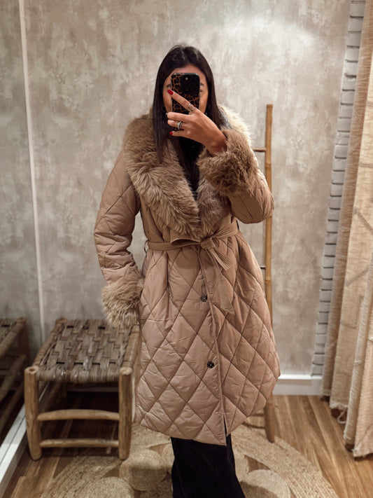Casaco de pelo sintético em tons castanhos, com corte moderno e cinto para ajustar na cintura
