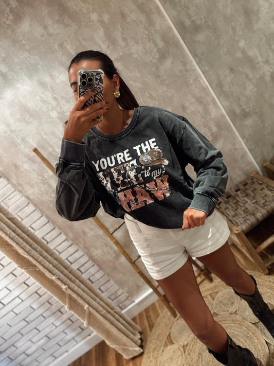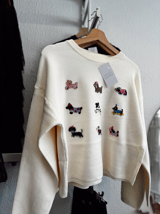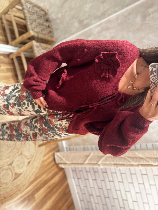Camisola de malha com decote ombro a ombro e aplicação de flores em relevo