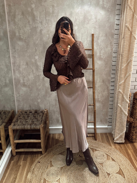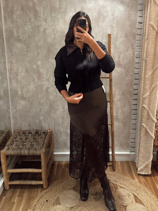 Calça de ganga c/ parte inferior em renda trabalhada - Castanho