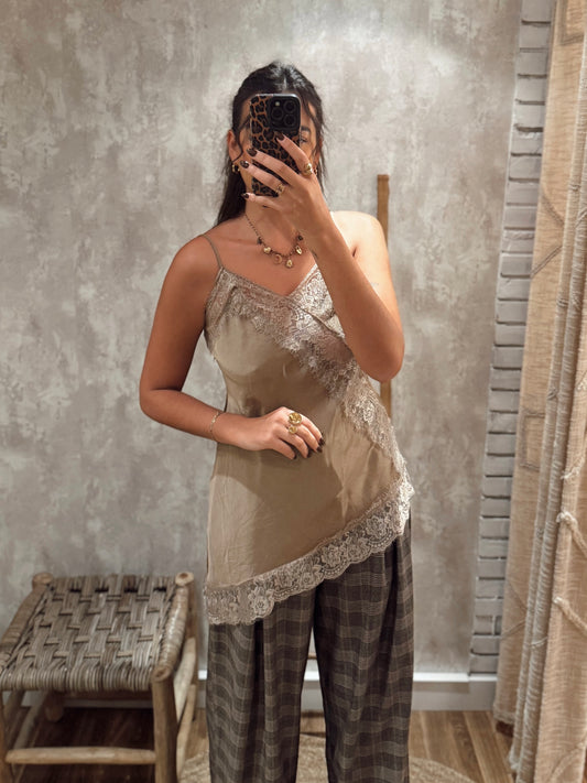 Top acetinado c/renda de corte assimétrico e alças ajustáveis