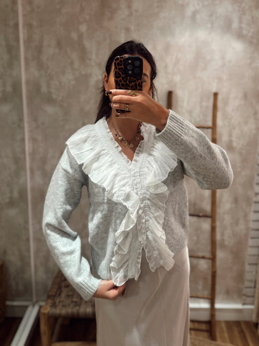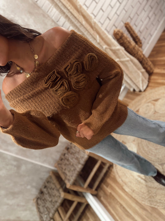 Camisola de malha com decote ombro a ombro e aplicação de flores em relevo