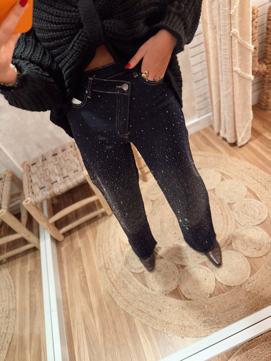 Calça de ganga c/ parte inferior em renda trabalhada - Castanho