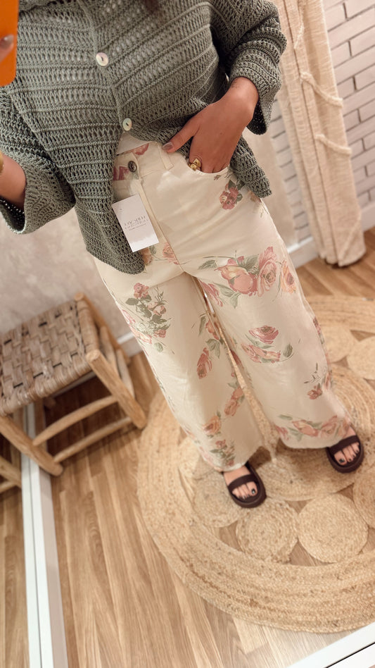 Jeans modelo wide leg c/padrão floral - branco