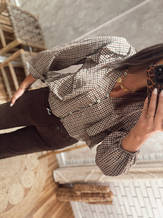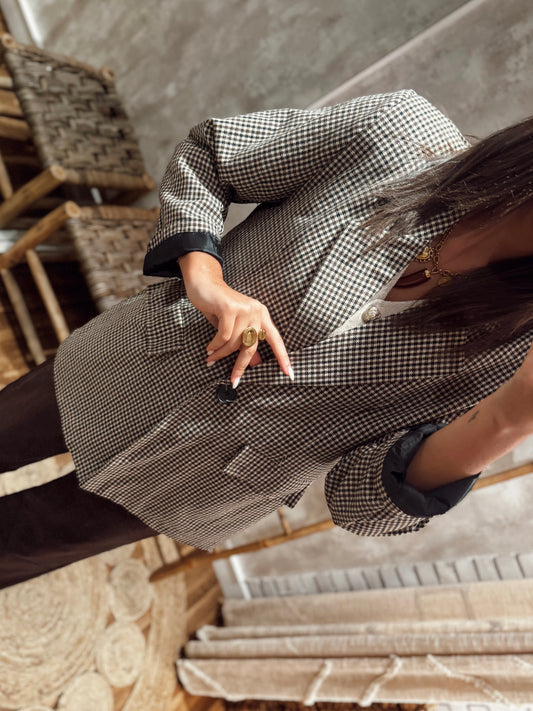 Blazer em tecido tipo fazenda com padrão vichy