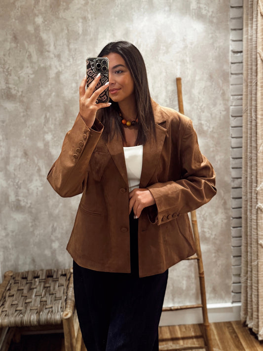 Blazer oversized em pele de pêssego -Camel