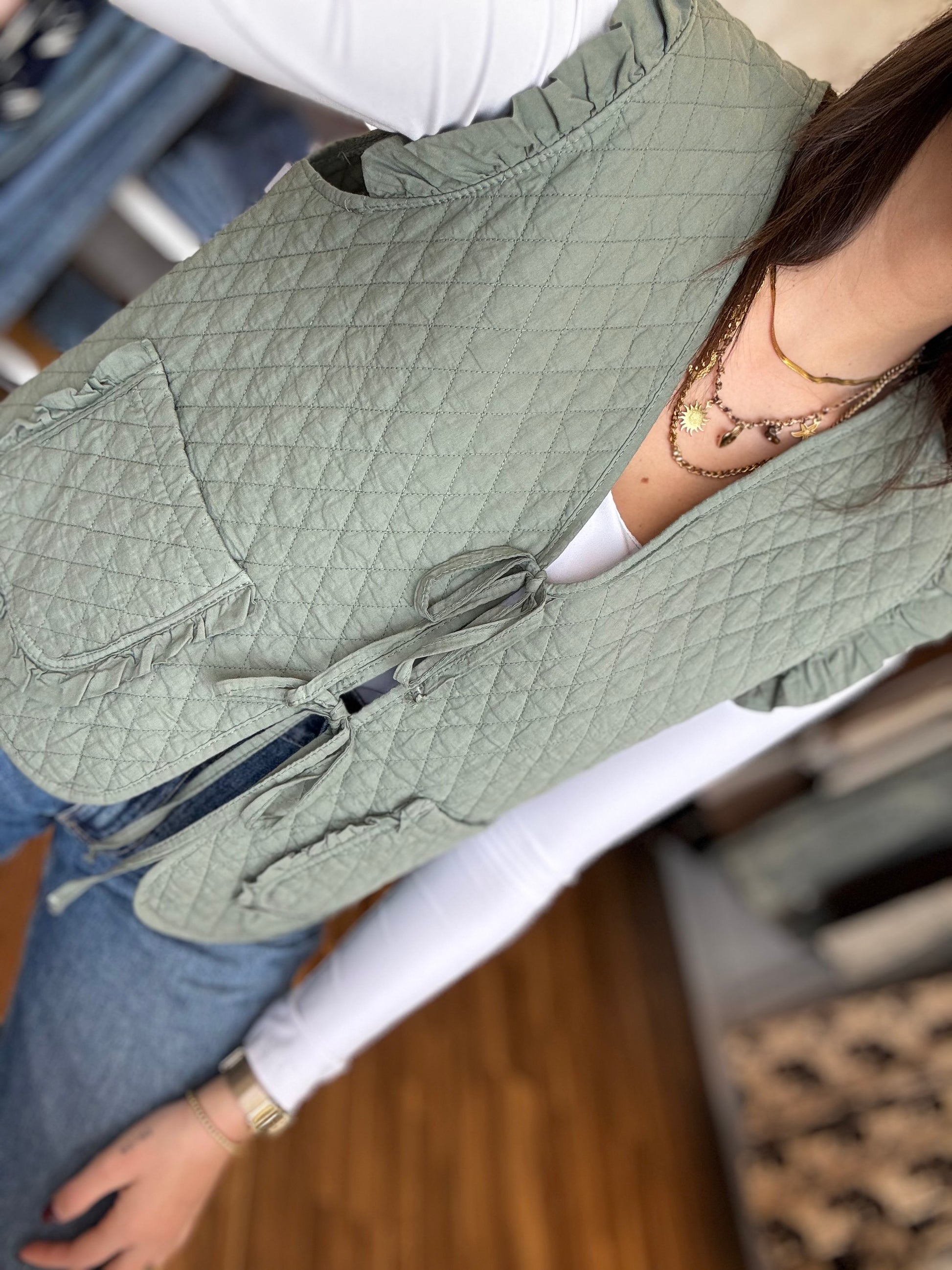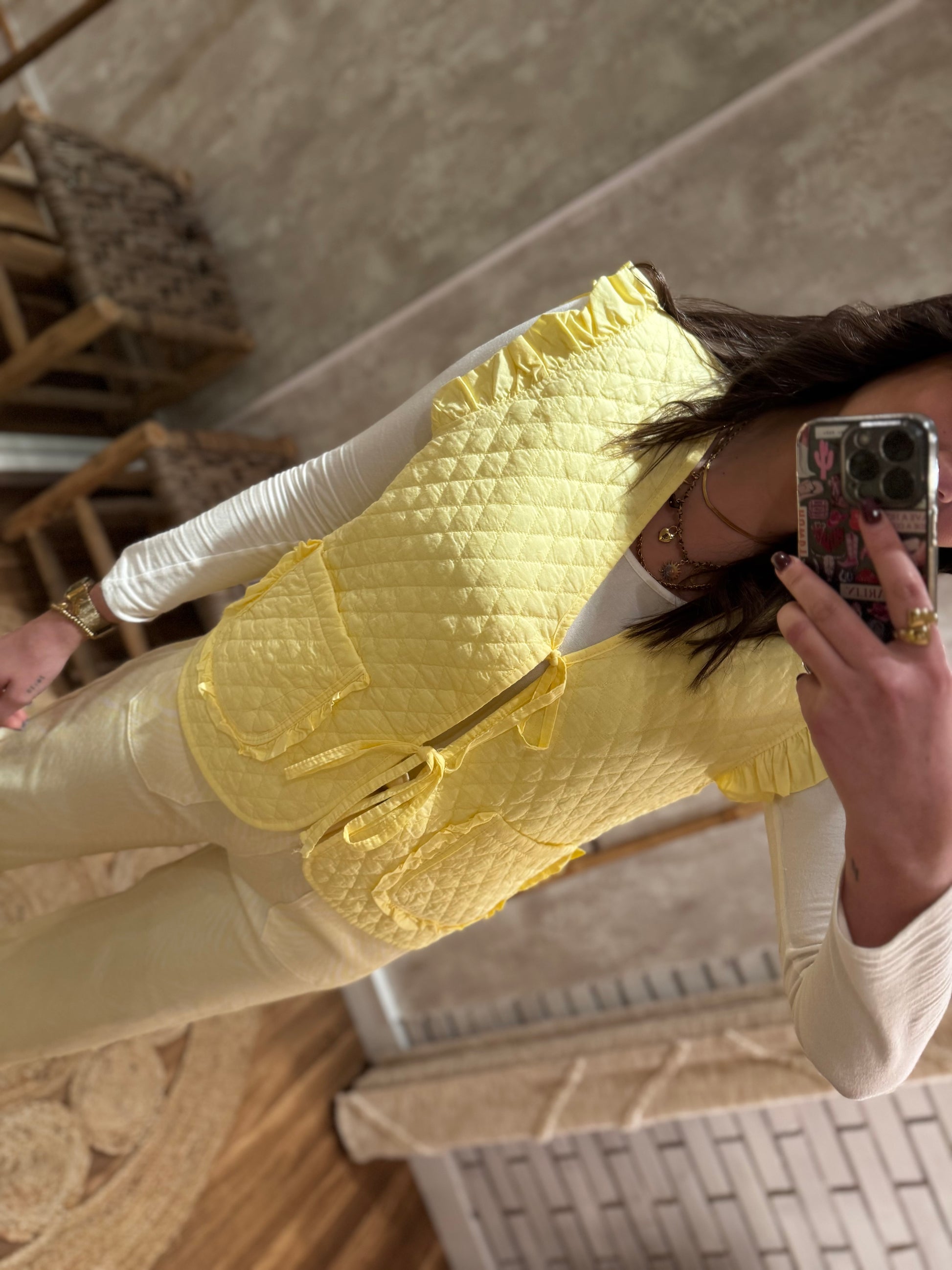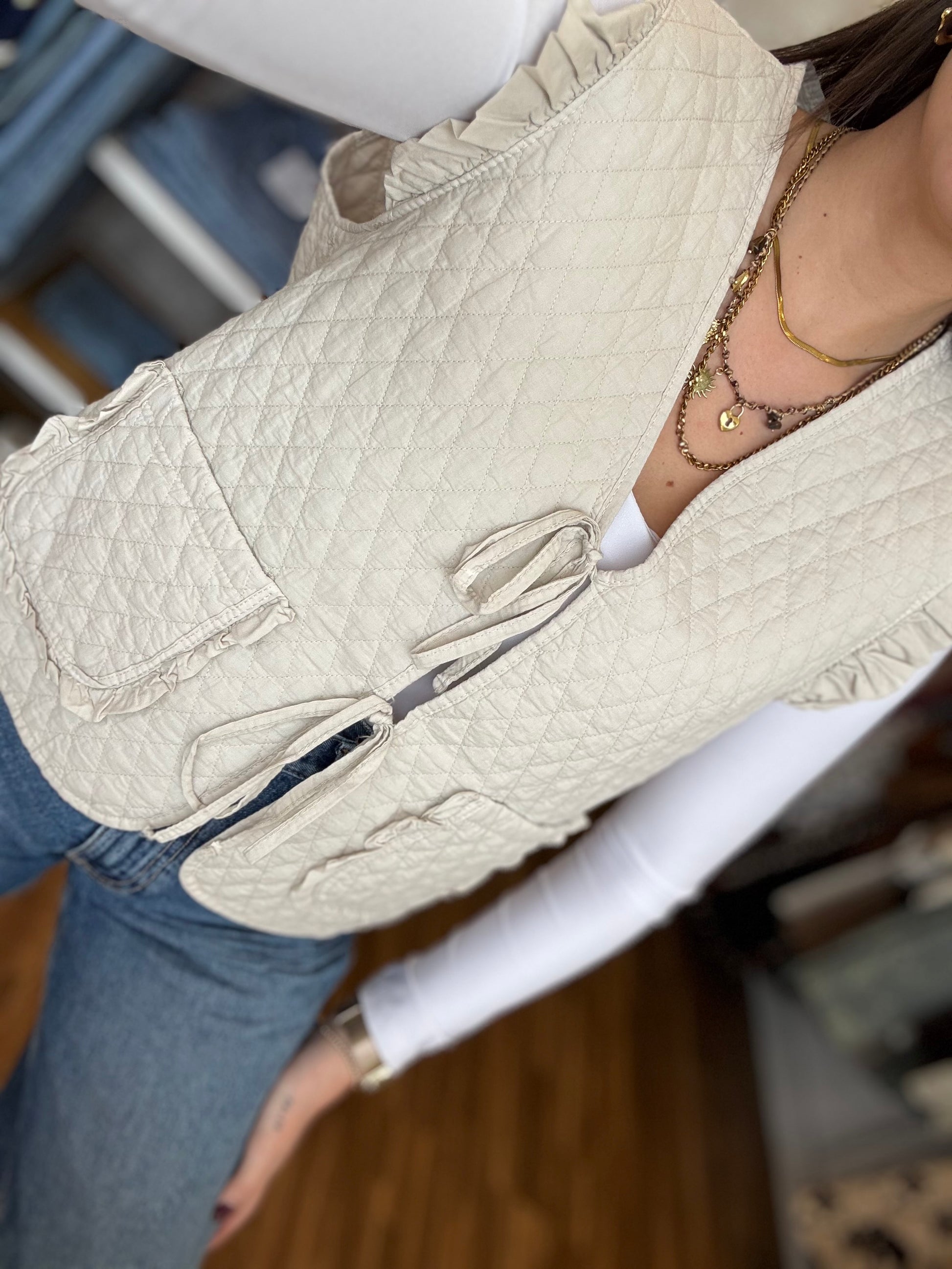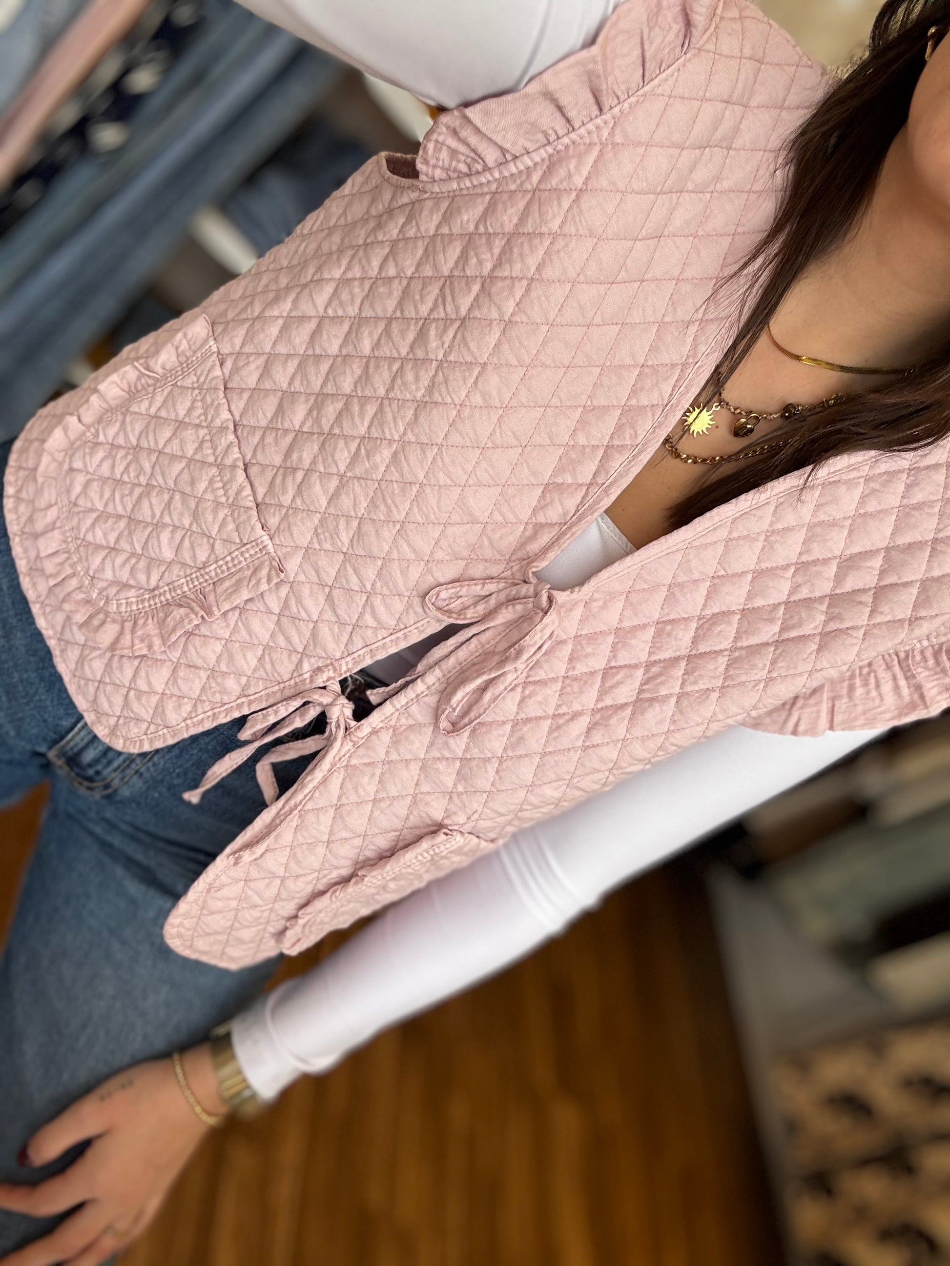 Colete leve e acolchoado, com detalhe de folhos nas mangas e atilhos na frente. Um modelo feminino e versátil, perfeito para completar qualquer look.