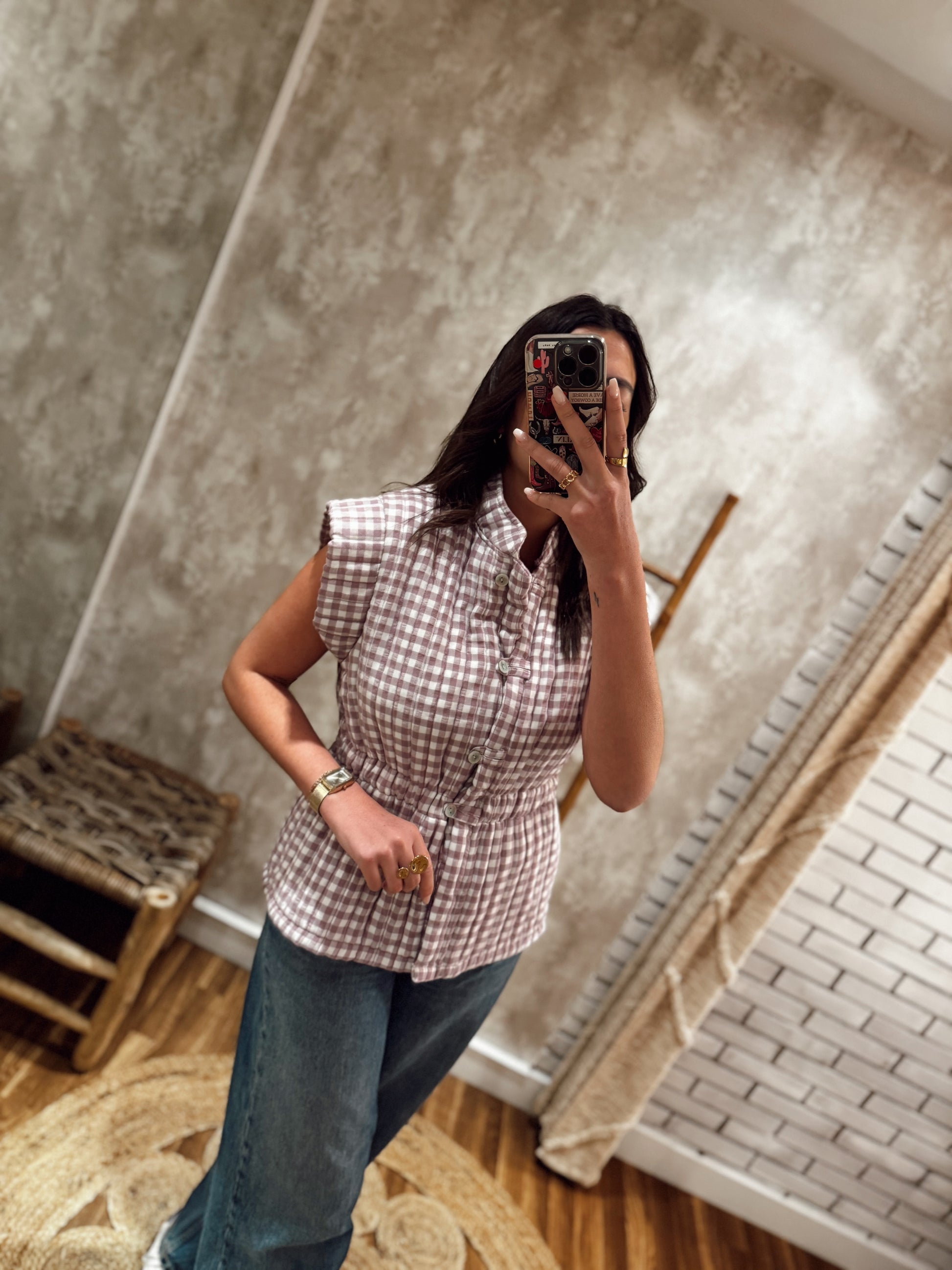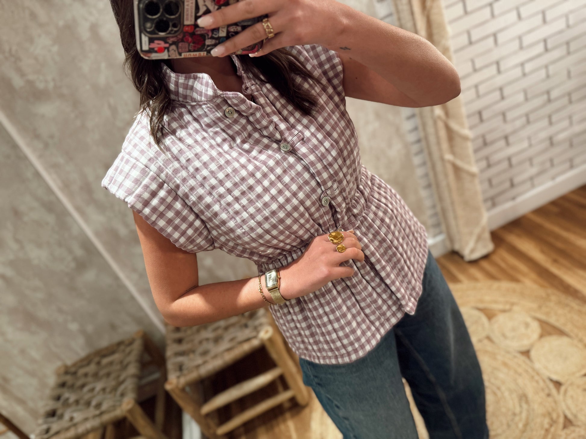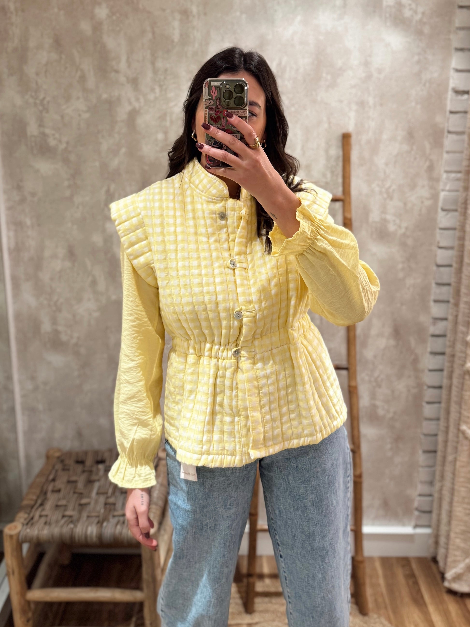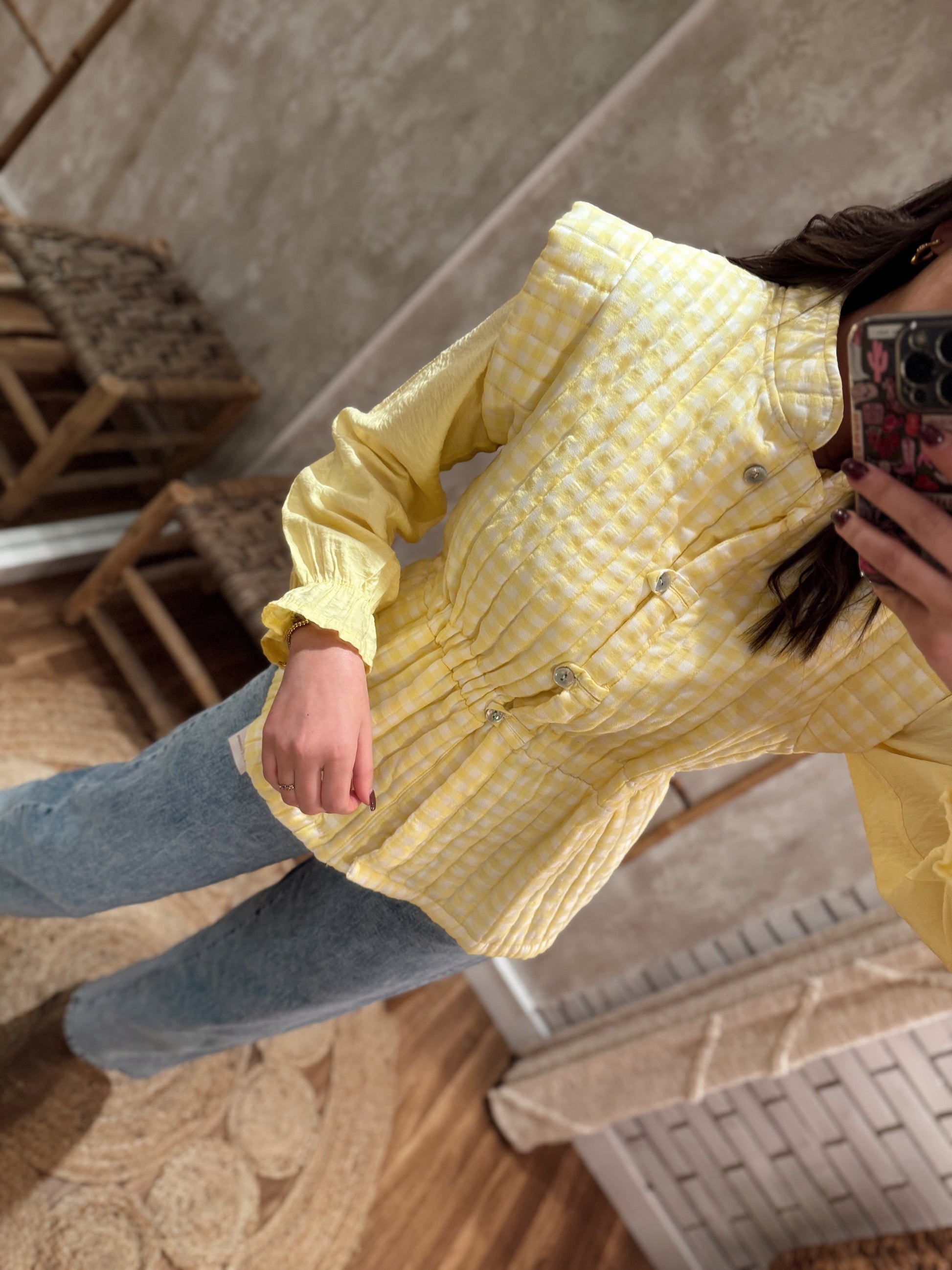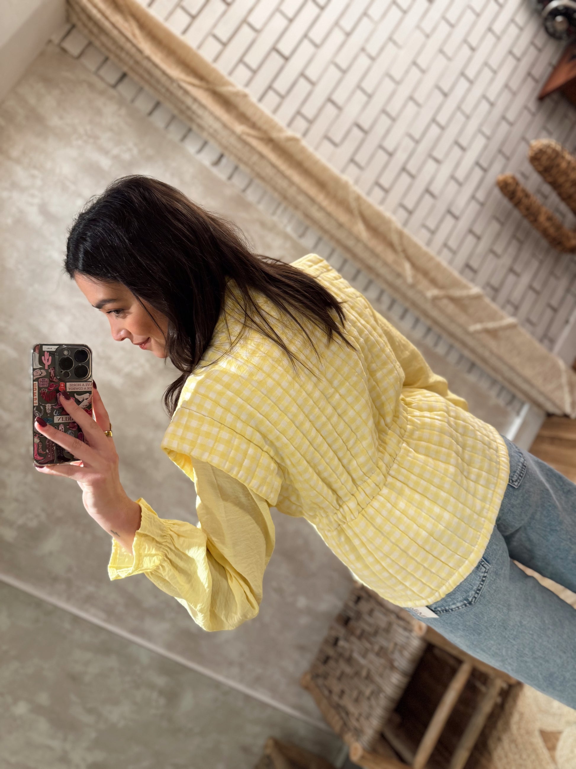 Colete acolchoado com corte cintado, fecho em botões e gola estilo padre. Padrão aos quadrados, perfeito para um look moderno e versátil.
