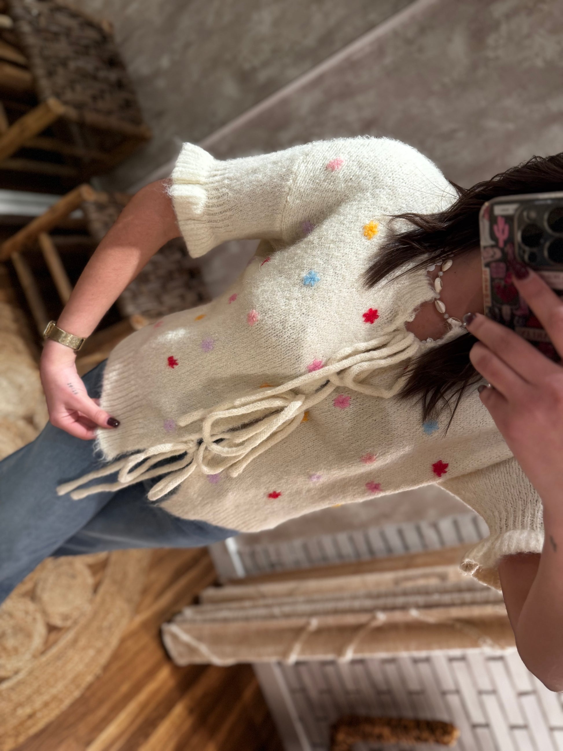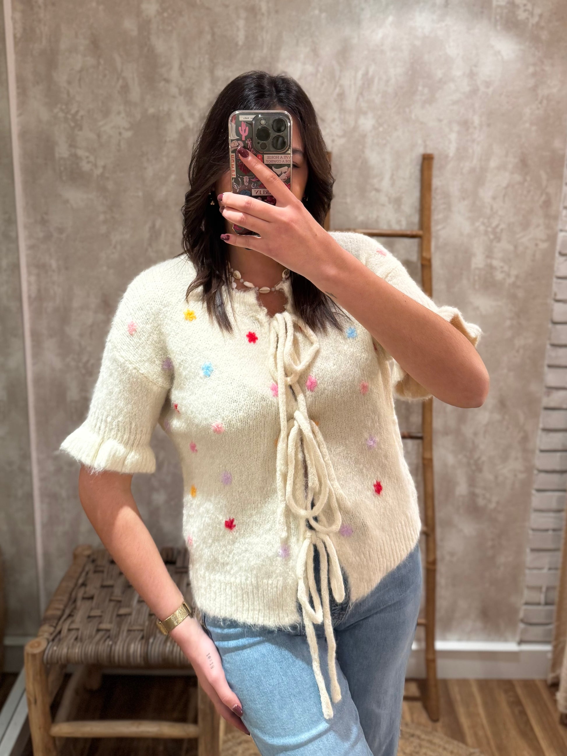 Colete com manga curta, destacado por folhos nas mangas que adicionam um toque feminino e leve. O colete é ajustado com atilhos, proporcionando um ajuste confortável. O pormenor encantador fica por conta das estrelas ou florezinhas bordadas com cores vibrantes, que conferem um ar alegre e delicado à peça.
