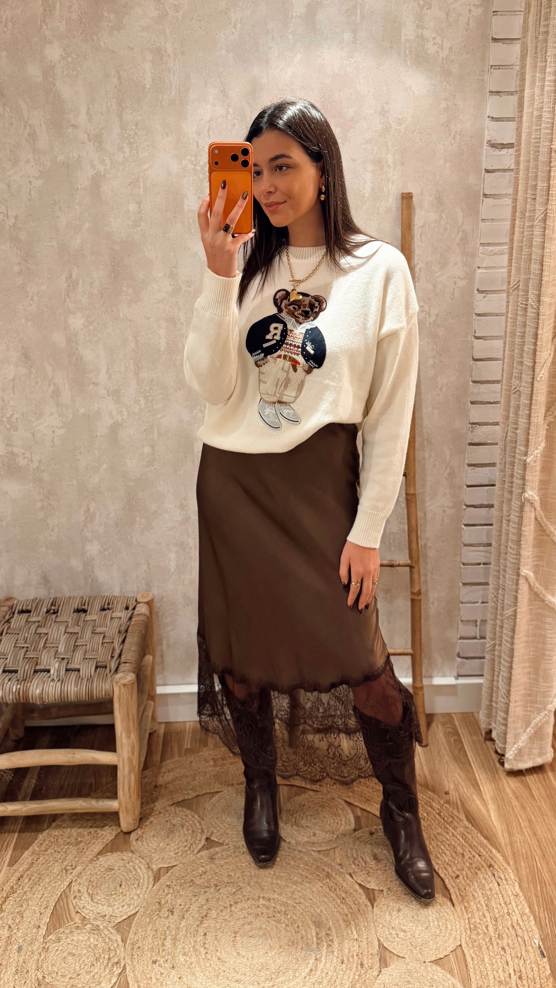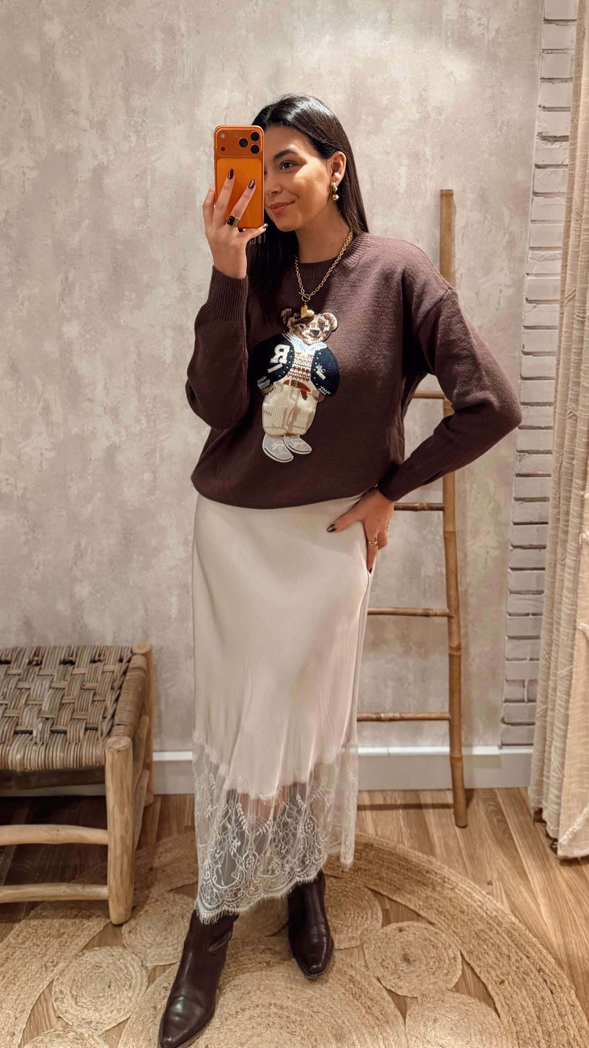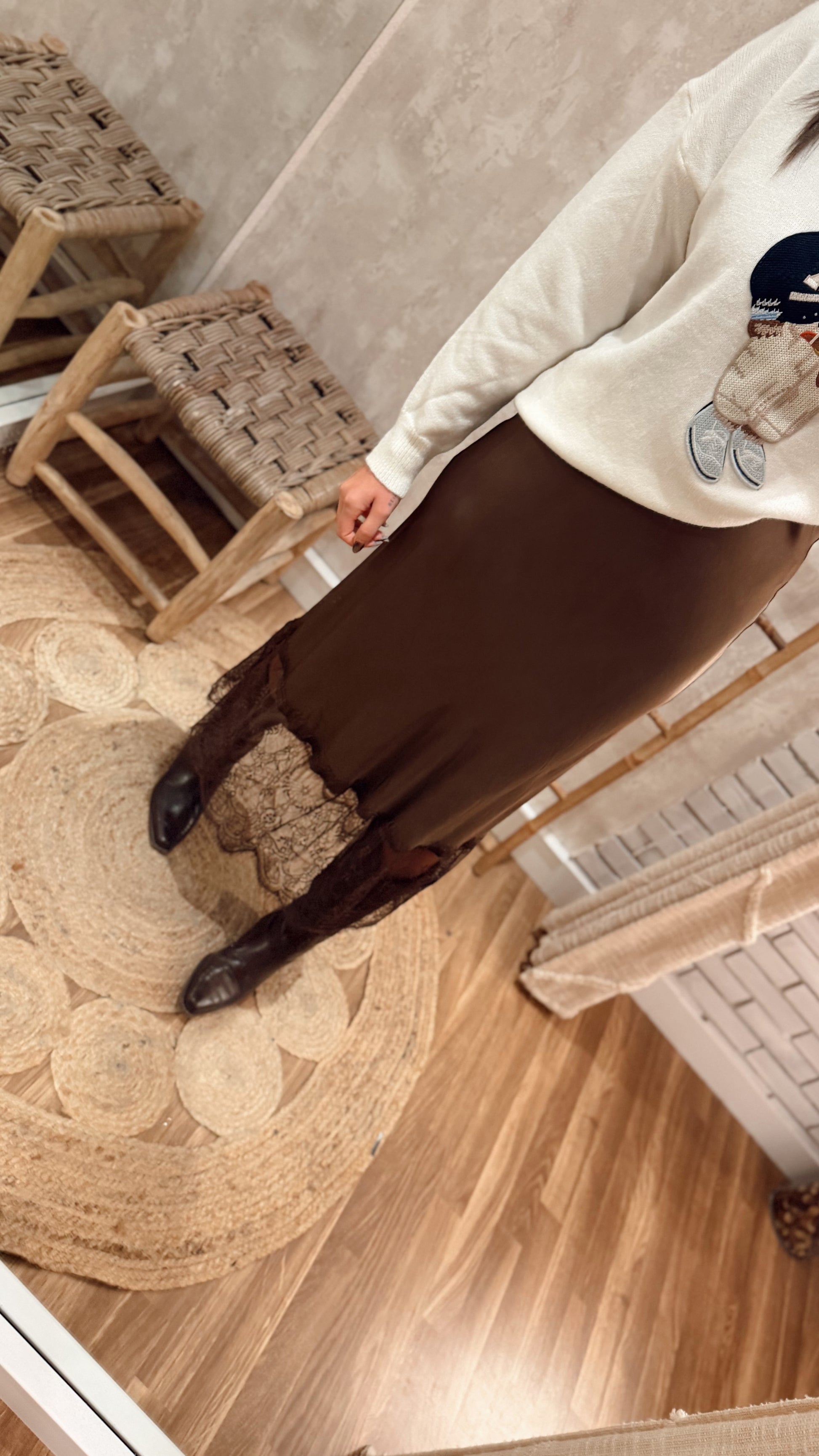 Esta saia é a definição de elegância simples e intemporal. Com um corte fluido e feminino, destaca-se pelo acabamento em renda na parte inferior, que acrescenta um toque delicado e sofisticado ao look. O tecido em viscose garante um cair leve e suave, acompanhando o movimento do corpo de forma natural e elegante.