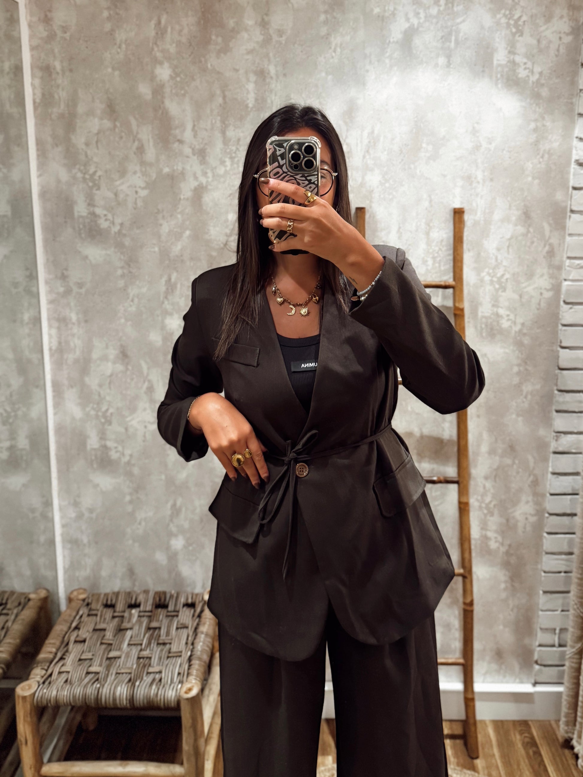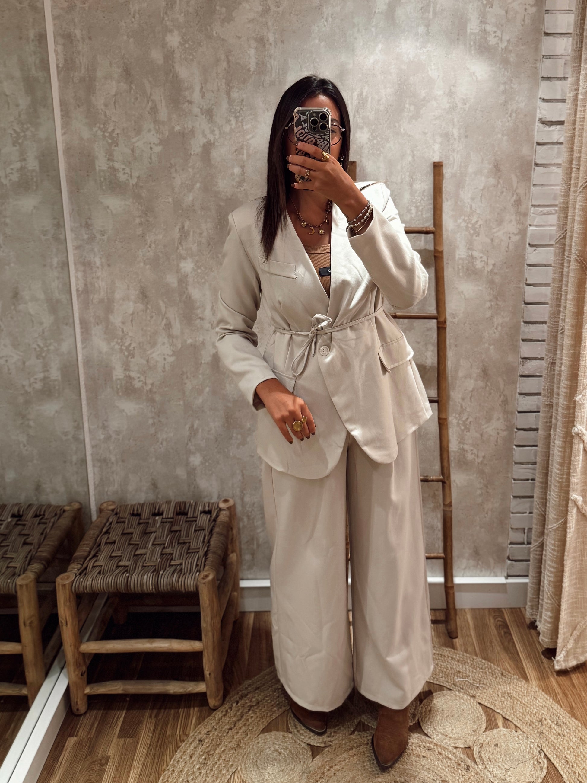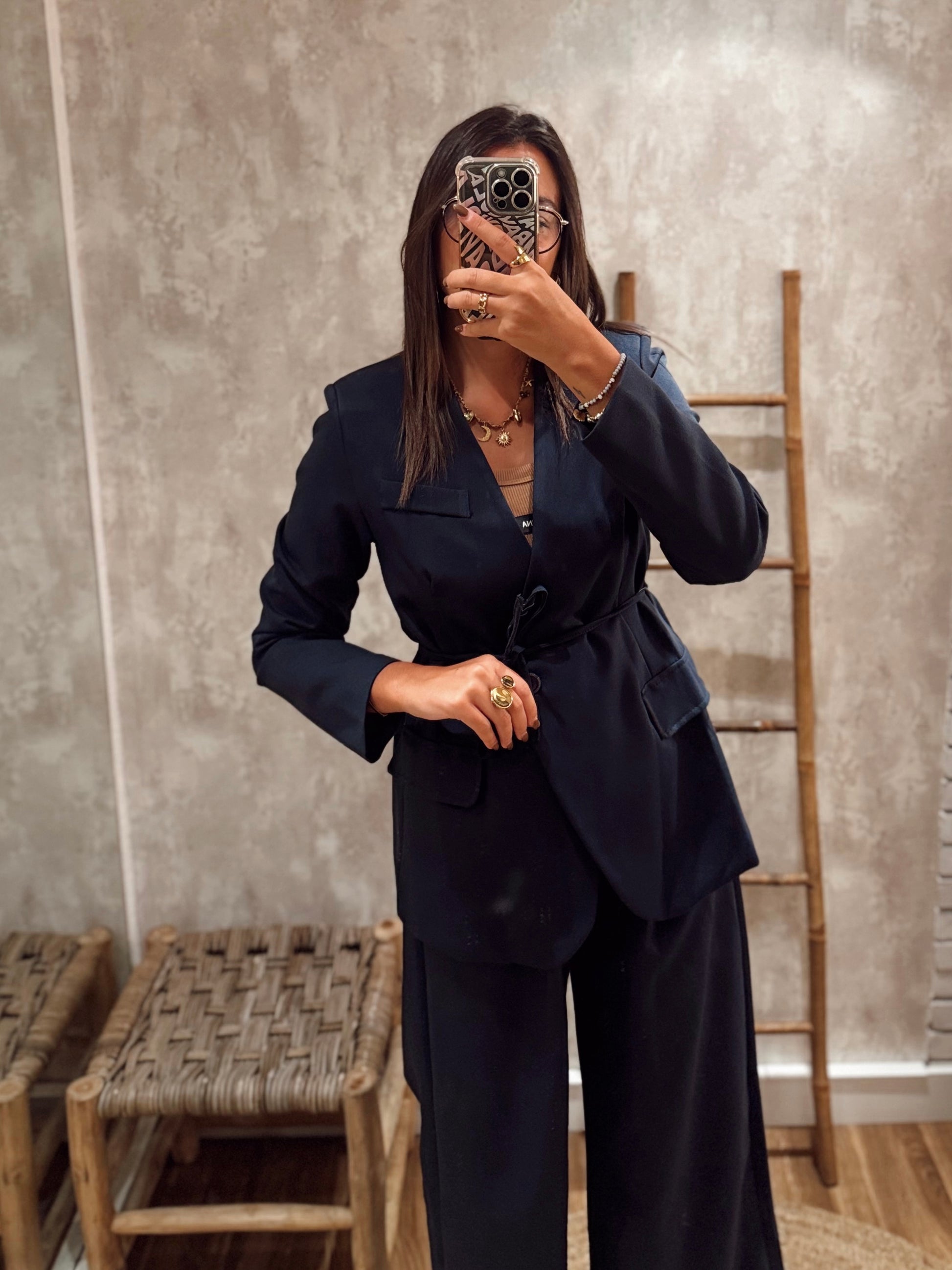 Un elegante blazer con un cinturón fino del mismo tejido y color, que acentúa la cintura y crea una silueta más definida. Este modelo cuenta con bolsillos delanteros y un corte clásico, ideal para looks formales o más informales. Disponible en cuatro colores: beige, verde seco, azul marino y marrón.