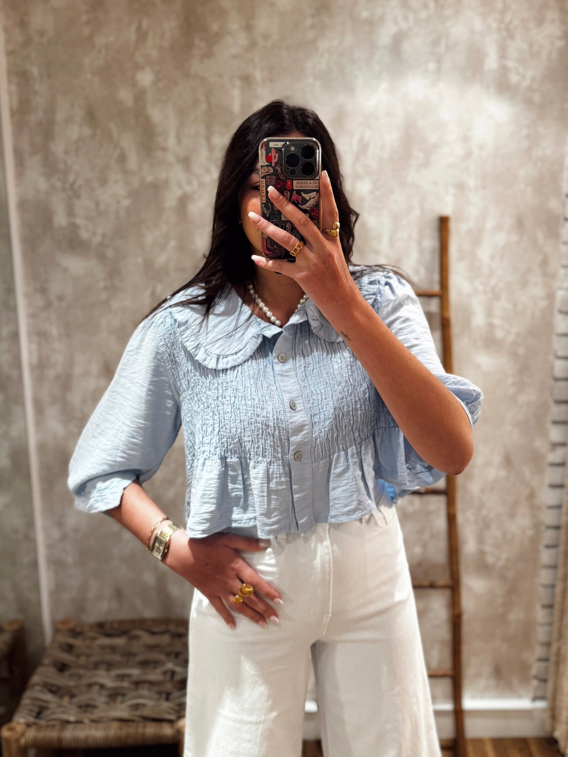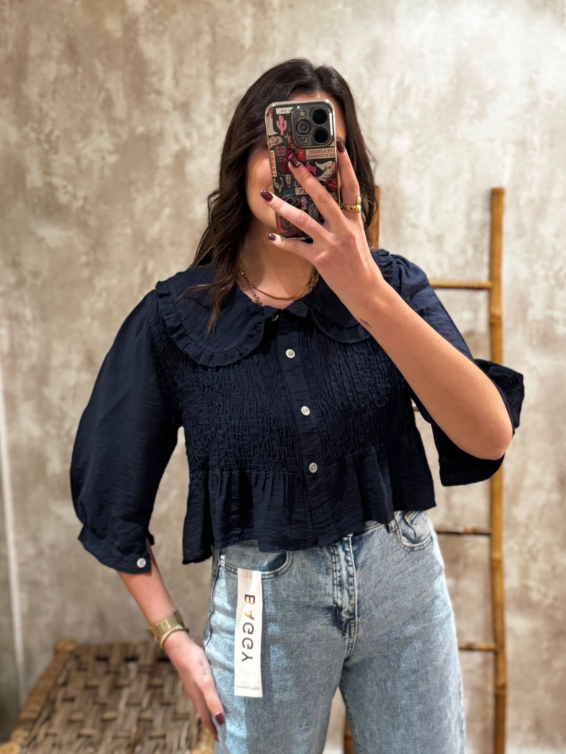 Blusa corta de media manga y cuello alto, confeccionada en punto elástico para un ajuste cómodo. Perfecta para un look informal y femenino.