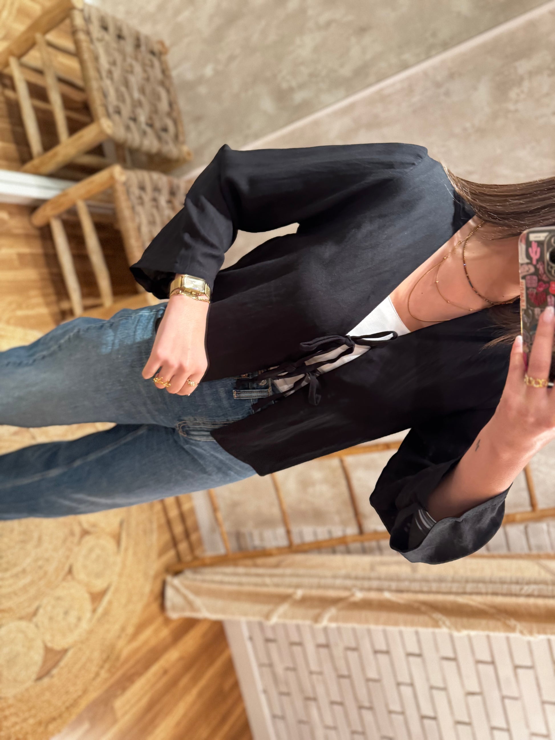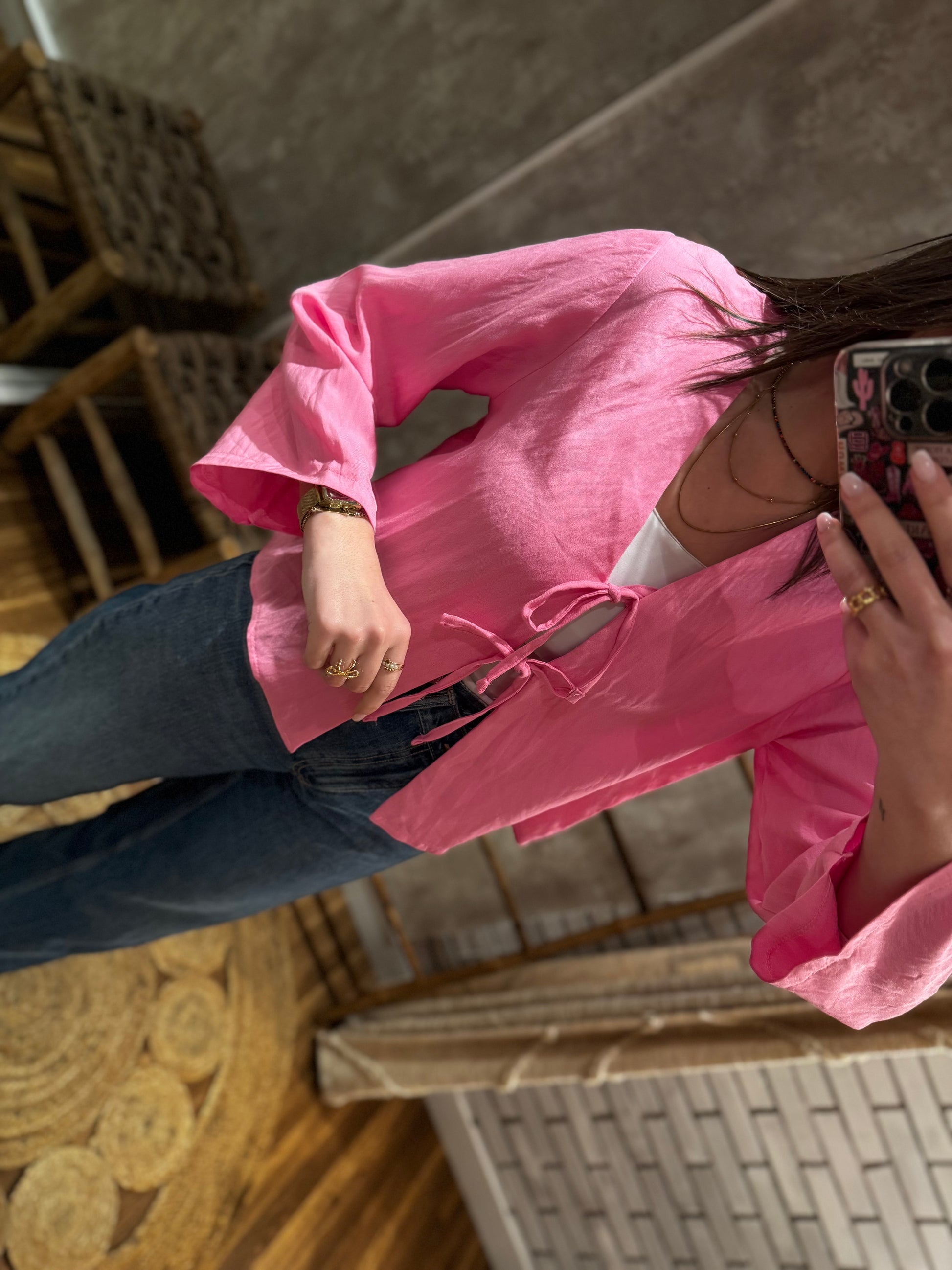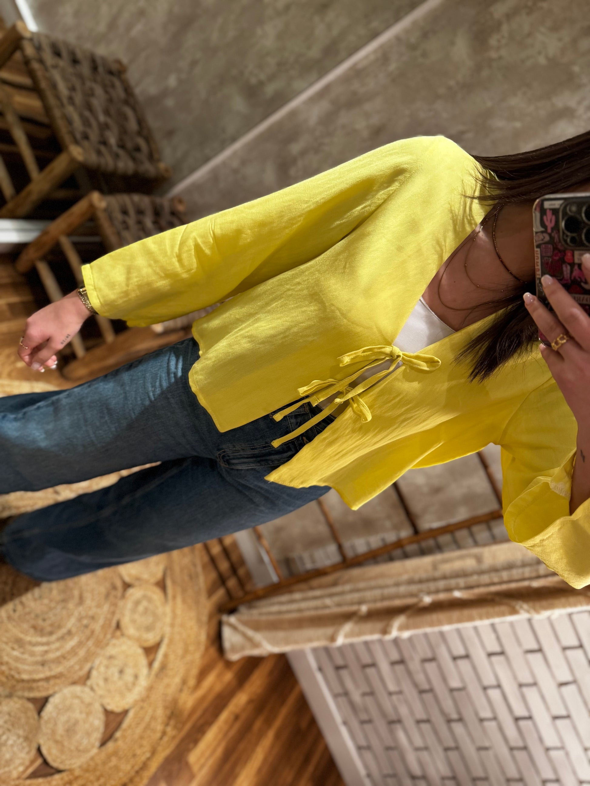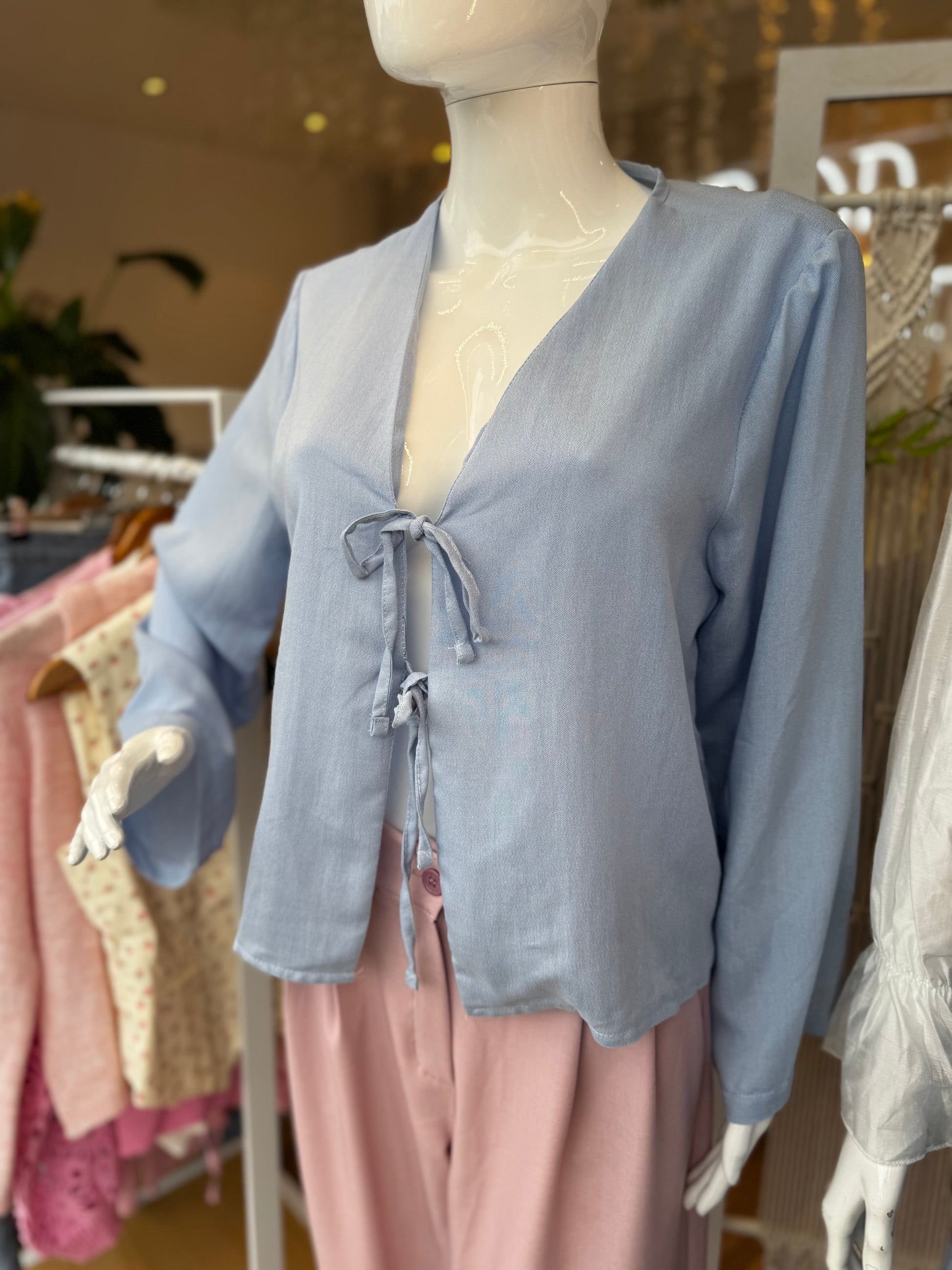 Esta blusa es una prenda versátil y elegante, ideal para cualquier ocasión. Confeccionada en una tela ligera y fluida, cuenta con lazos en la parte delantera que te permiten ajustar el escote a tu gusto, aportando un toque delicado y encantador a tu look. Las mangas largas y anchas aportan un toque de elegancia y comodidad, haciéndola perfecta tanto para días como para noches frescas.