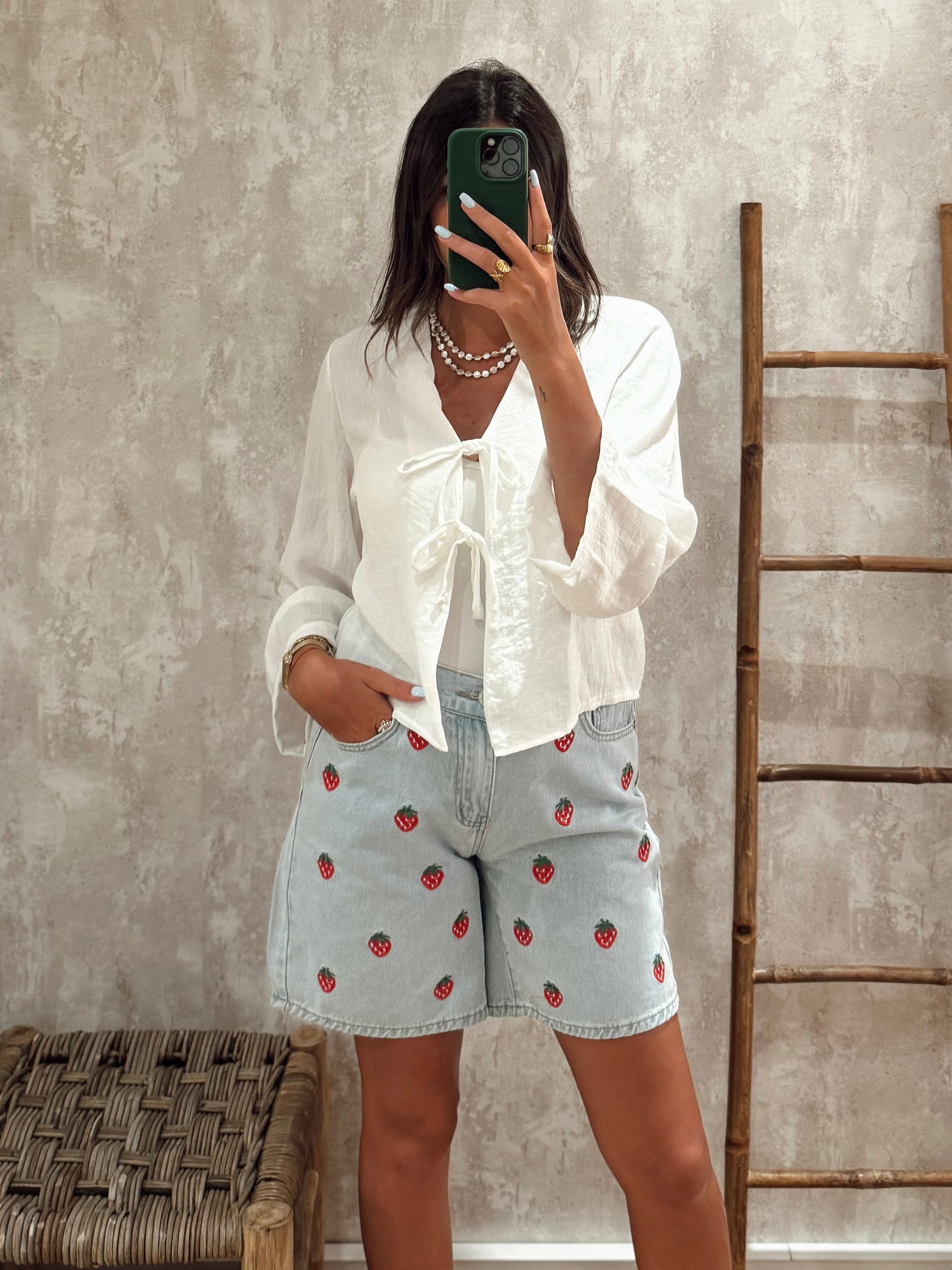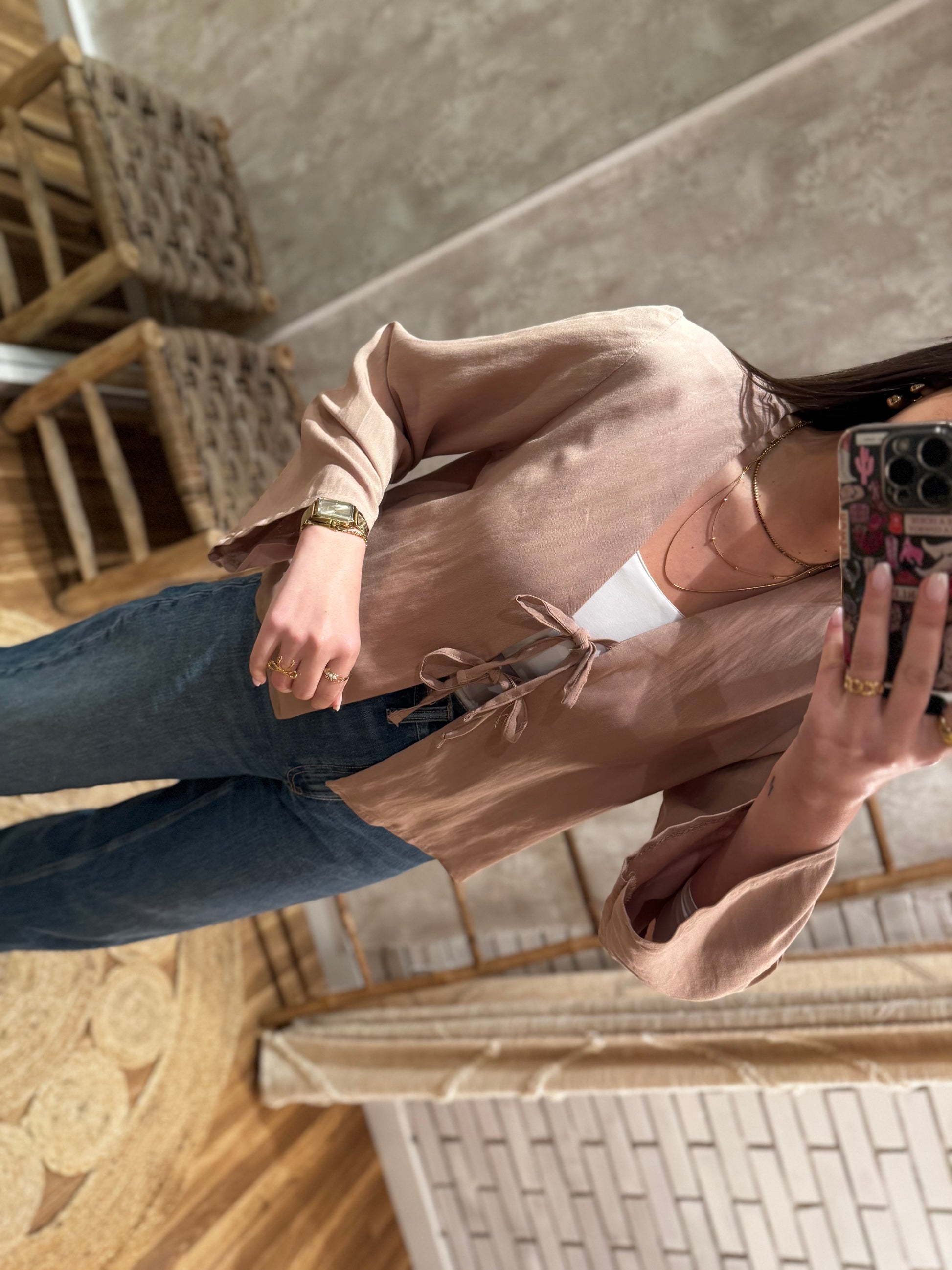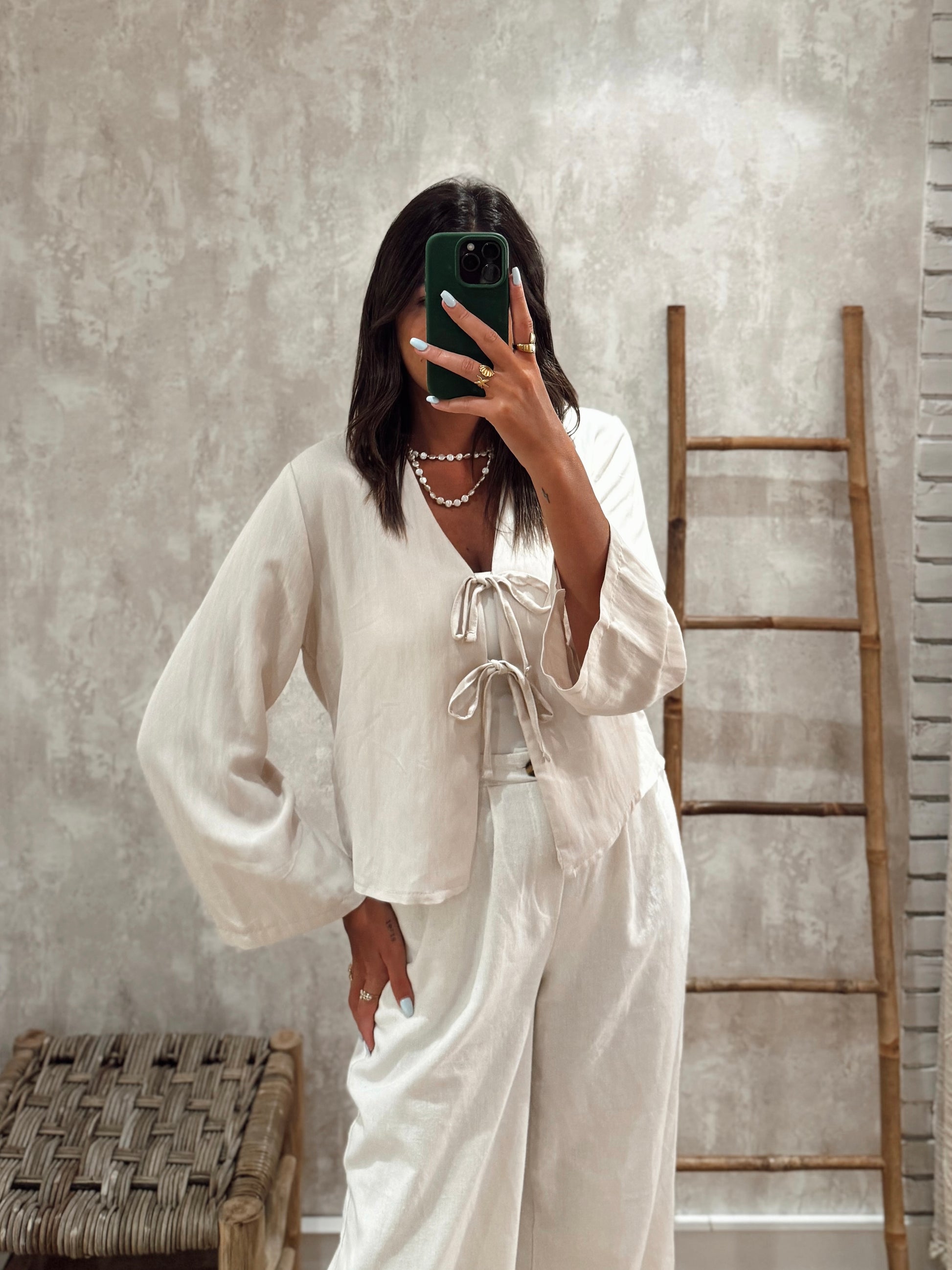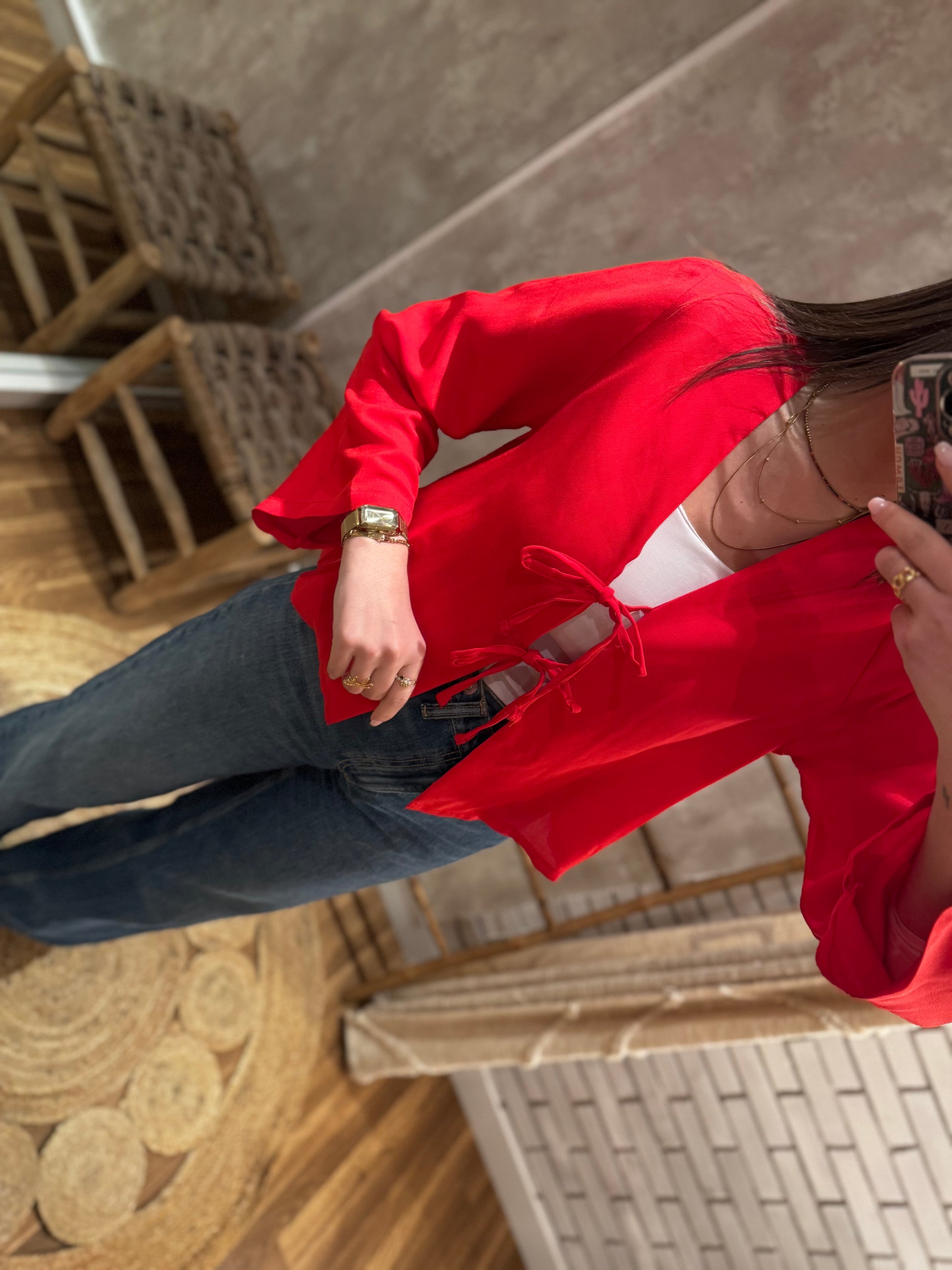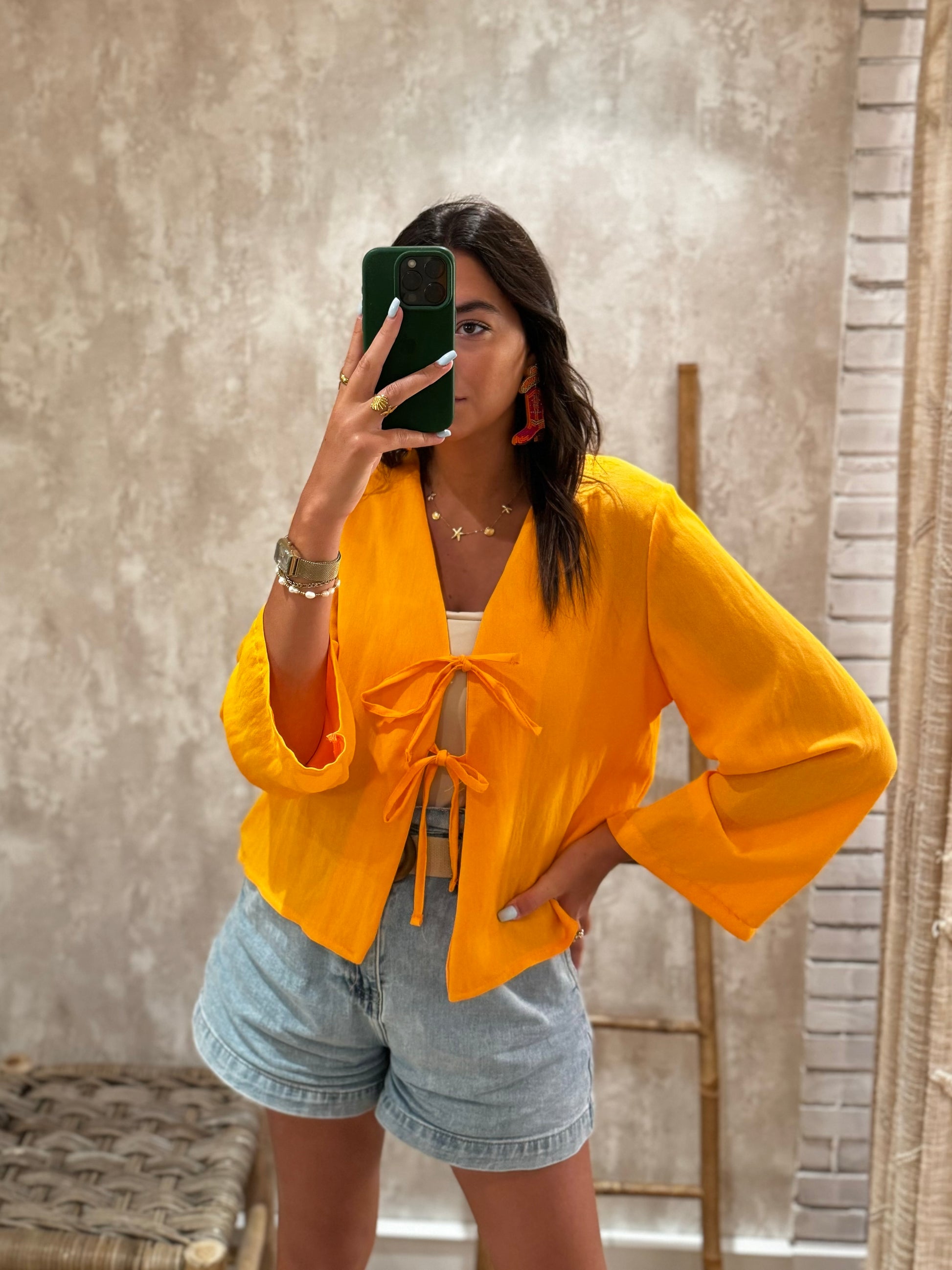 Esta blusa es una prenda versátil y elegante, ideal para cualquier ocasión. Confeccionada en una tela ligera y fluida, cuenta con lazos en la parte delantera que te permiten ajustar el escote a tu gusto, aportando un toque delicado y encantador a tu look. Las mangas largas y anchas aportan un toque de elegancia y comodidad, haciéndola perfecta tanto para días como para noches frescas.