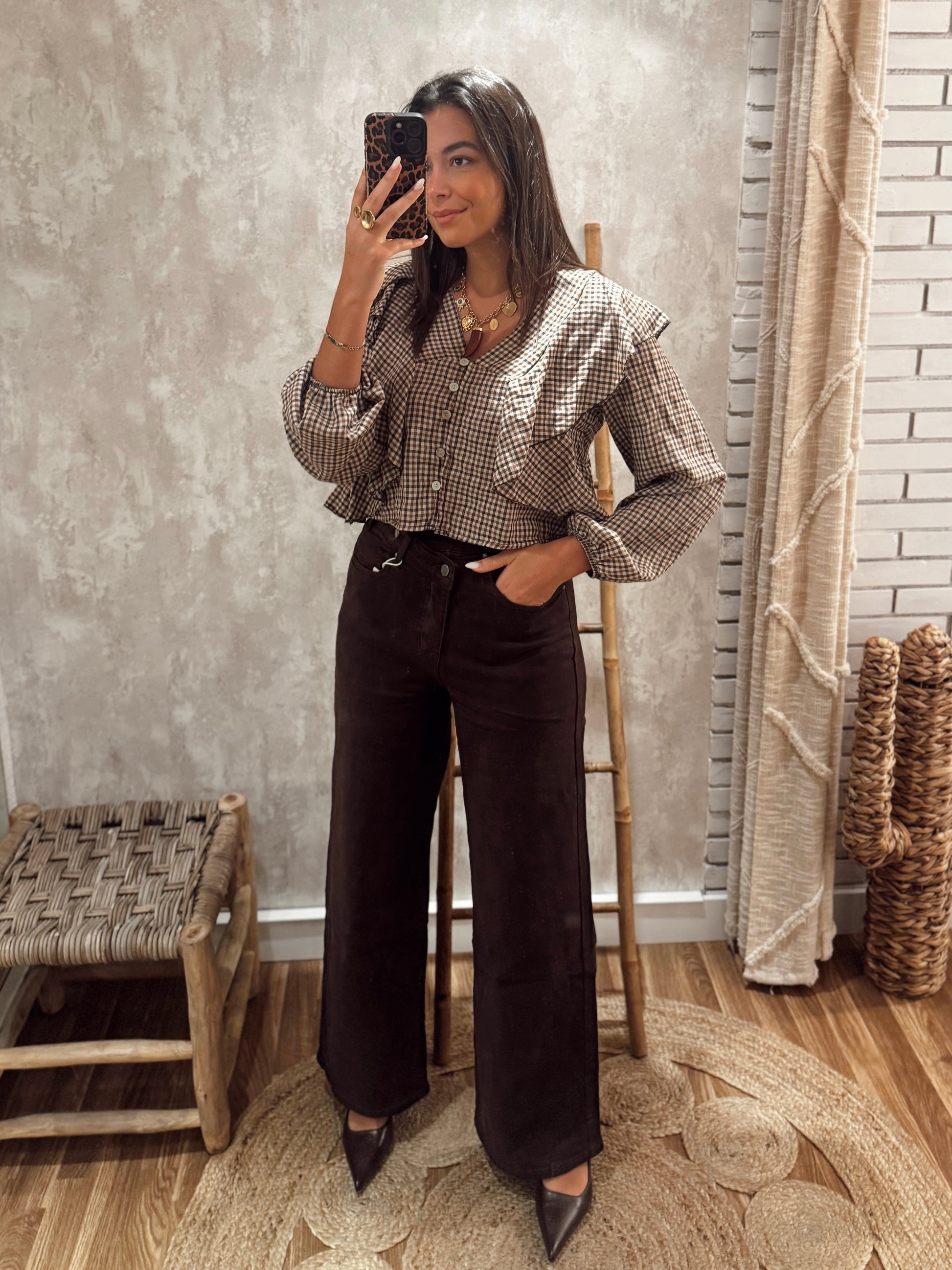 Calças castanhas modelo wide leg, com fecho de botão cruzado e tecido com elasticidade que garante máximo conforto. O corte elegante e o toque suave tornam-nas perfeitas para conjugar tanto em looks mais casuais como em coordenados sofisticados.