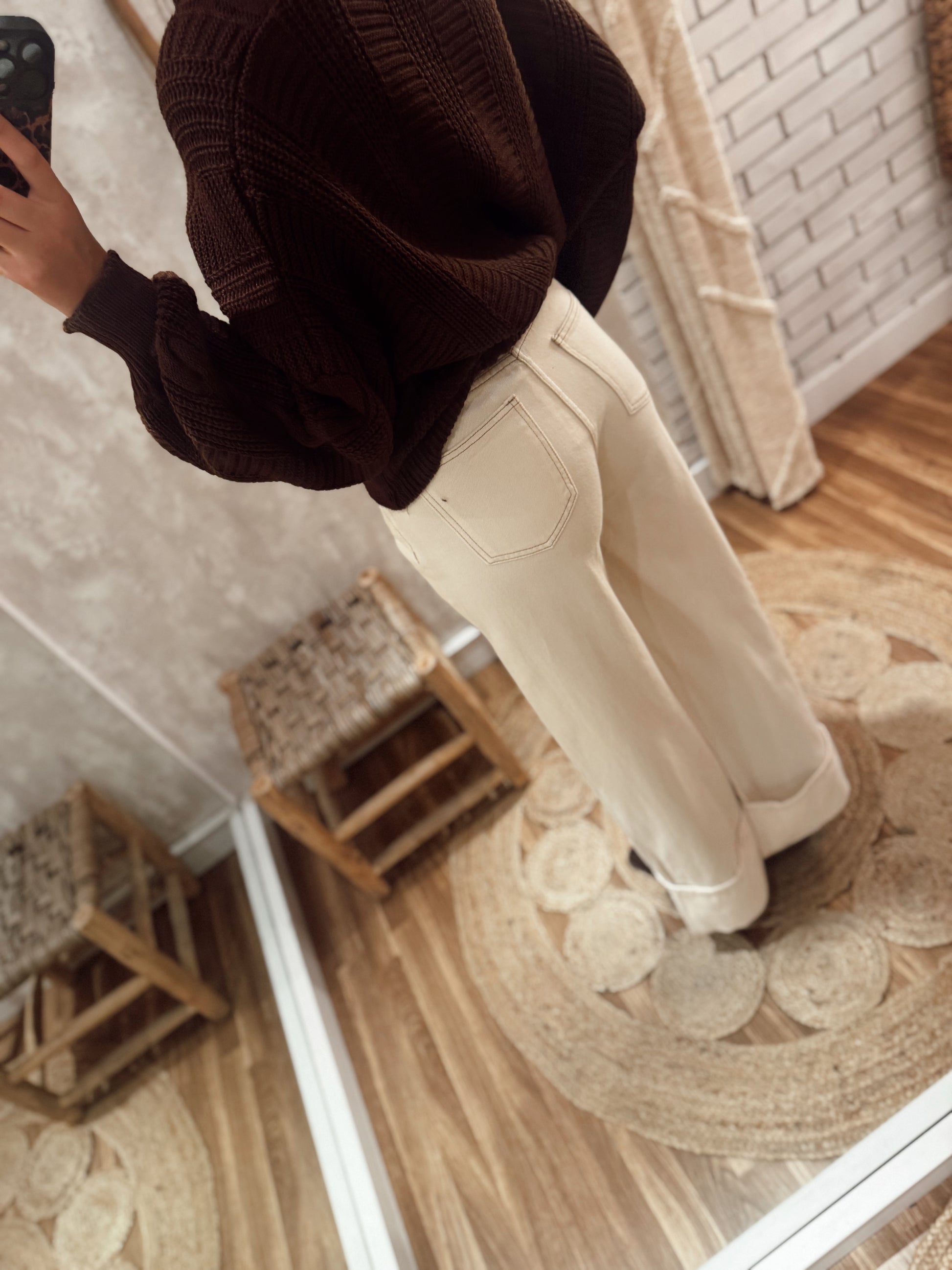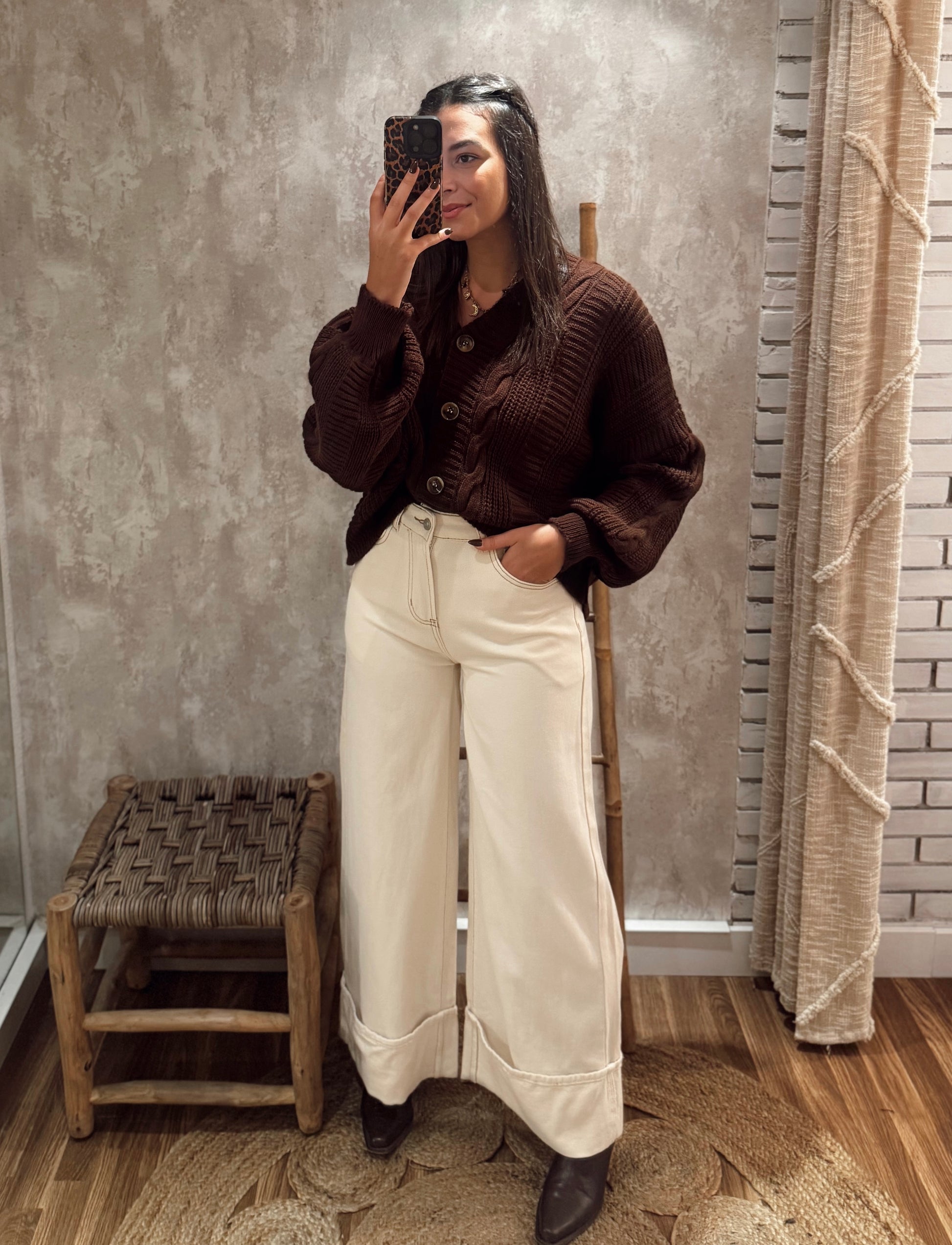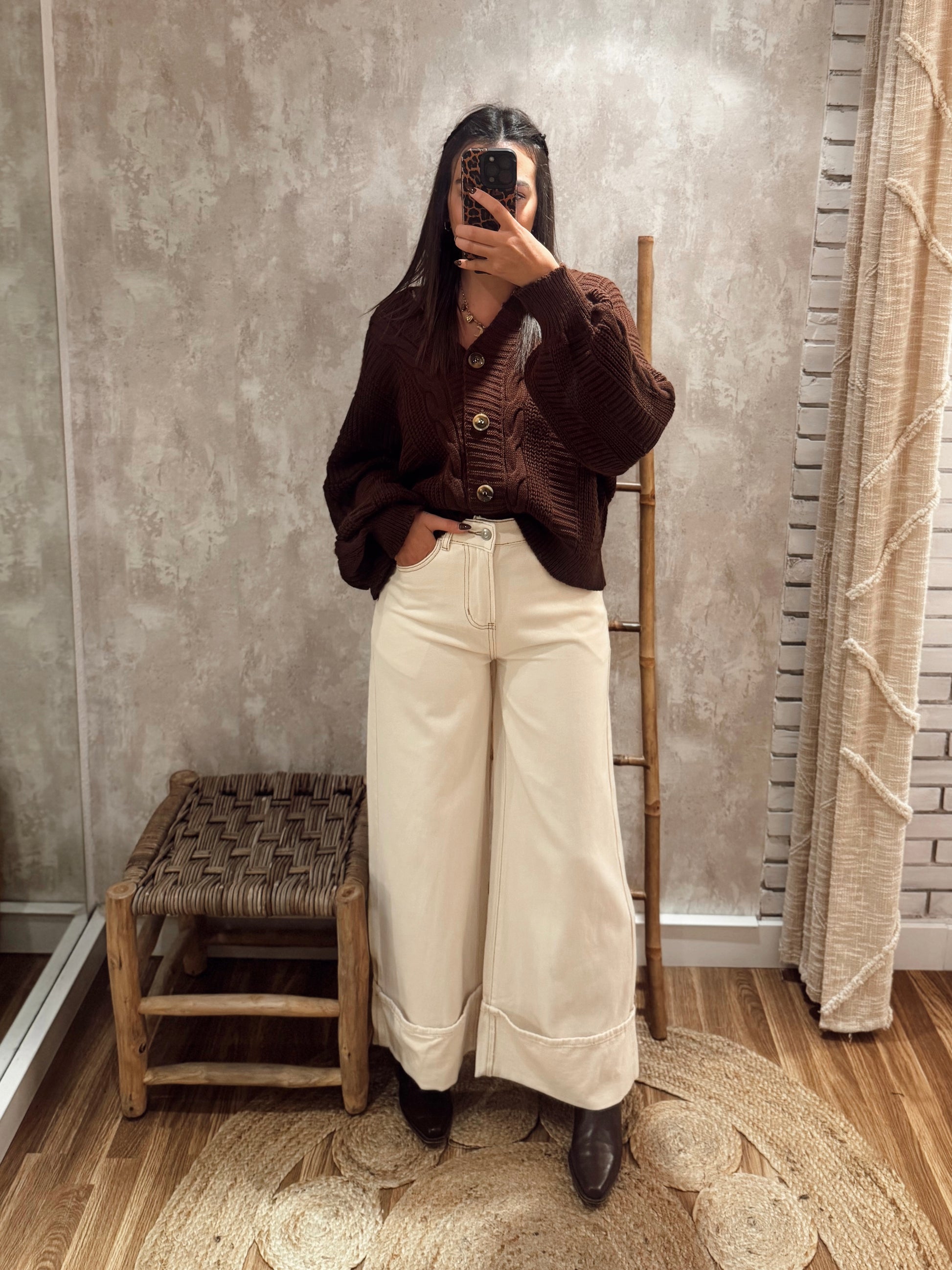 O modelo apresenta cintura subida, bolsos funcionais e detalhe de dobra no final da perna, que dá um toque original à peça.