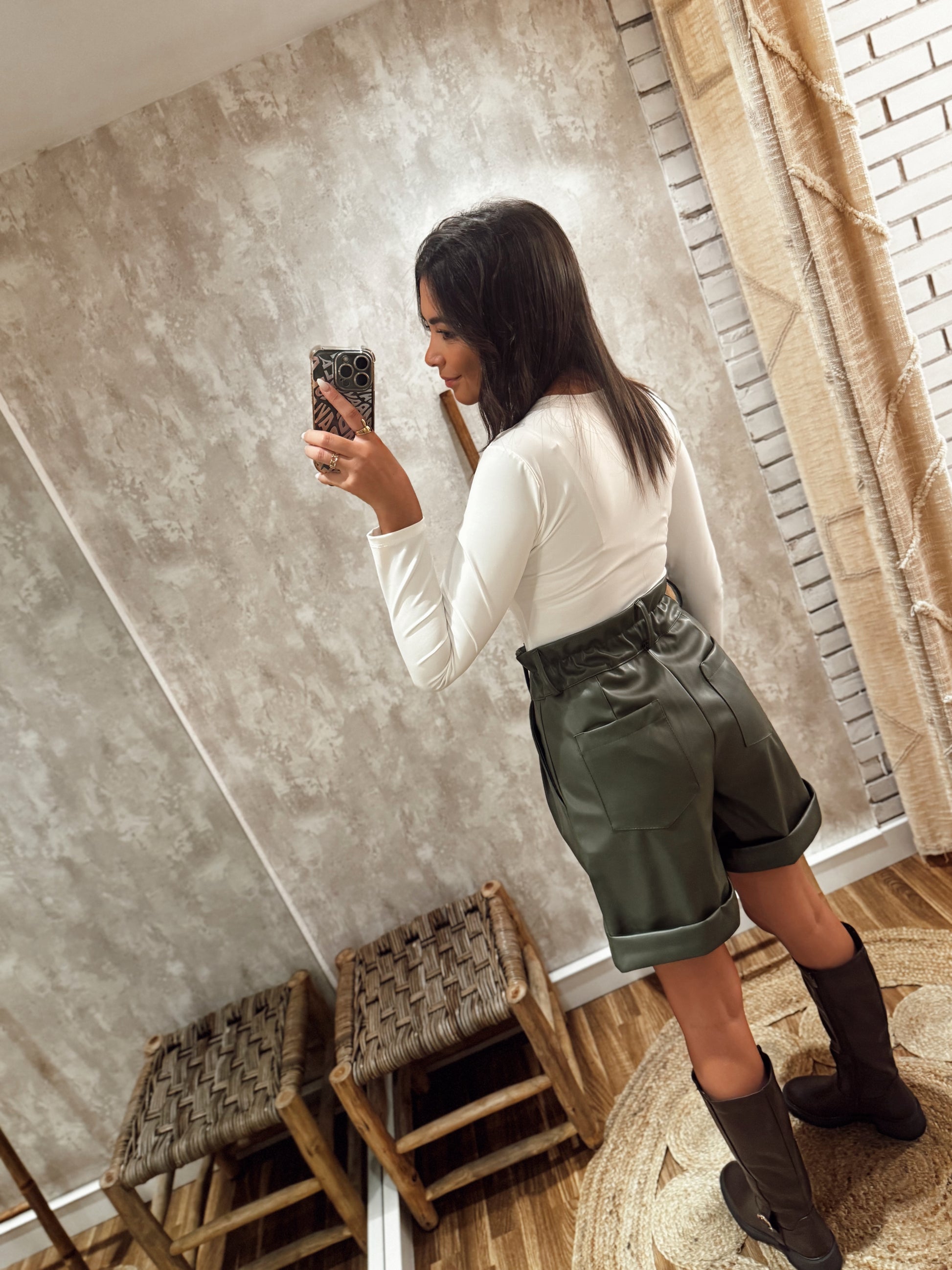Calções em napa, com cintura subida e elástico atrás para maior conforto. Modelo elegante com dobra no fundo e bolsos laterais, perfeito para conjugar em looks modernos e cheios de estilo. Disponível em verde, castanho e preto.
