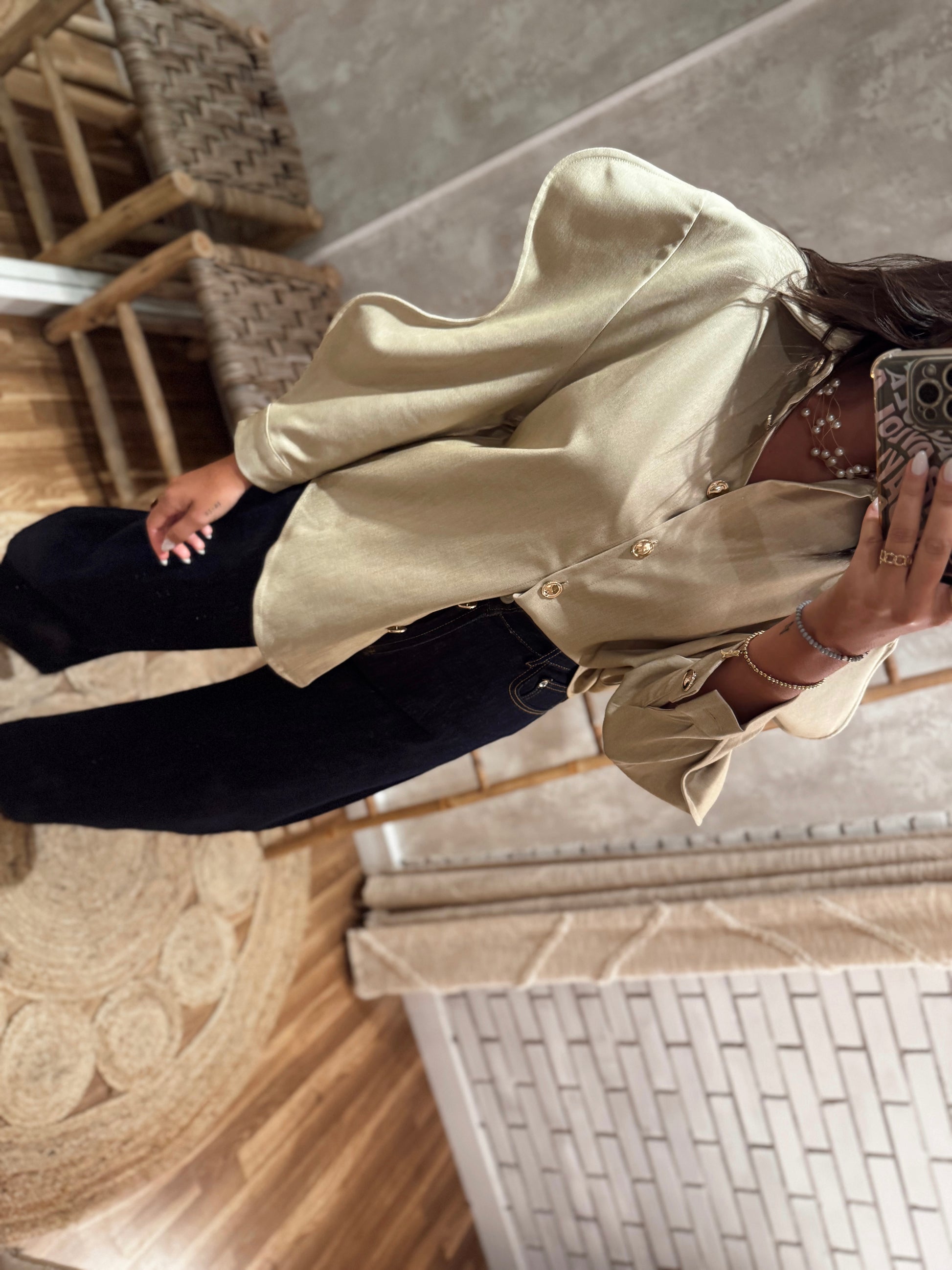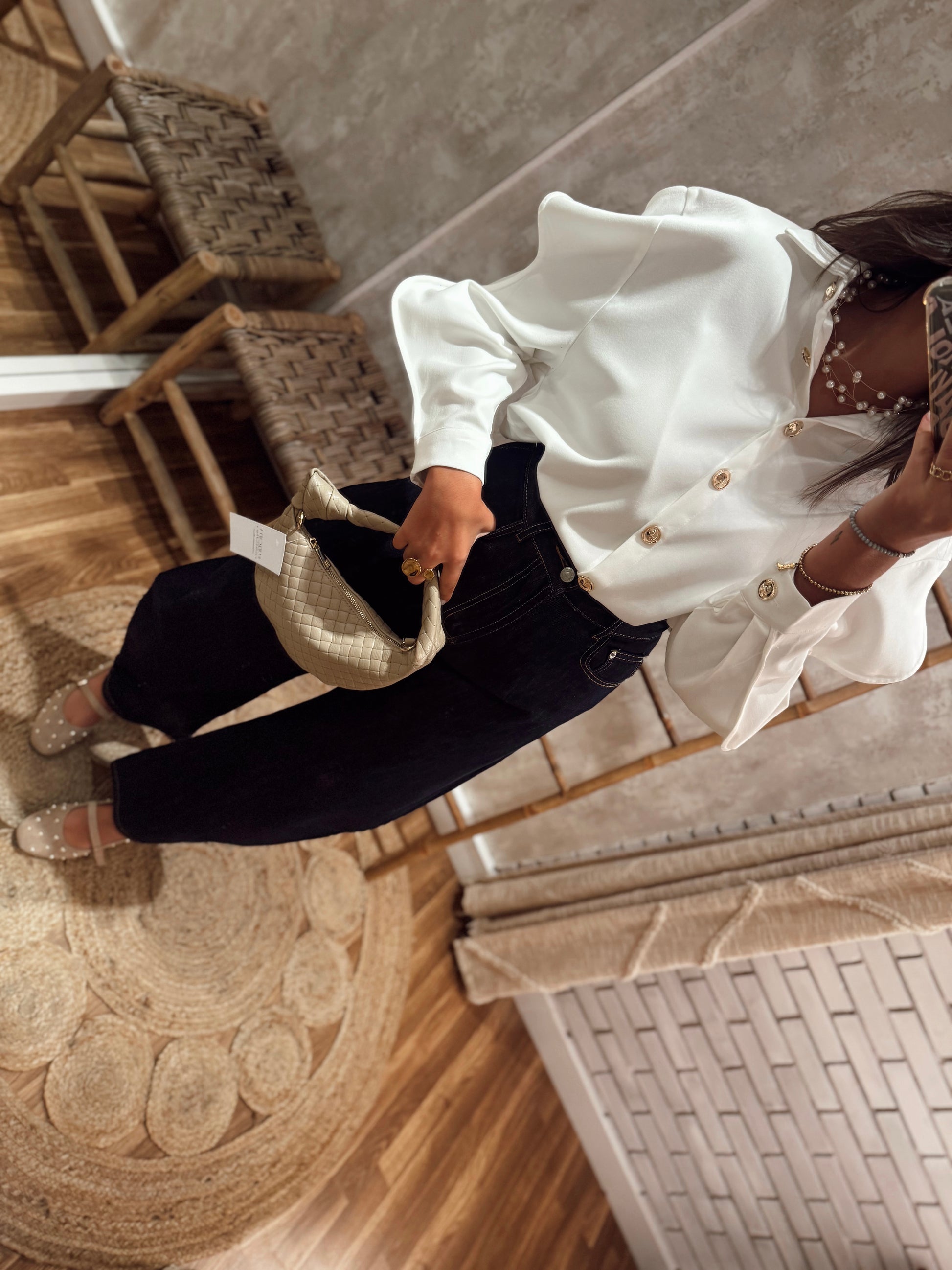 Camisa Mochy en azul claro con un diseño moderno y elegante. Las mangas voluminosas y estructuradas crean un efecto distintivo y sofisticado. Se cierra con botones dorados para un sutil toque de brillo. Perfecta para realzar looks de diario o crear conjuntos más atrevidos.