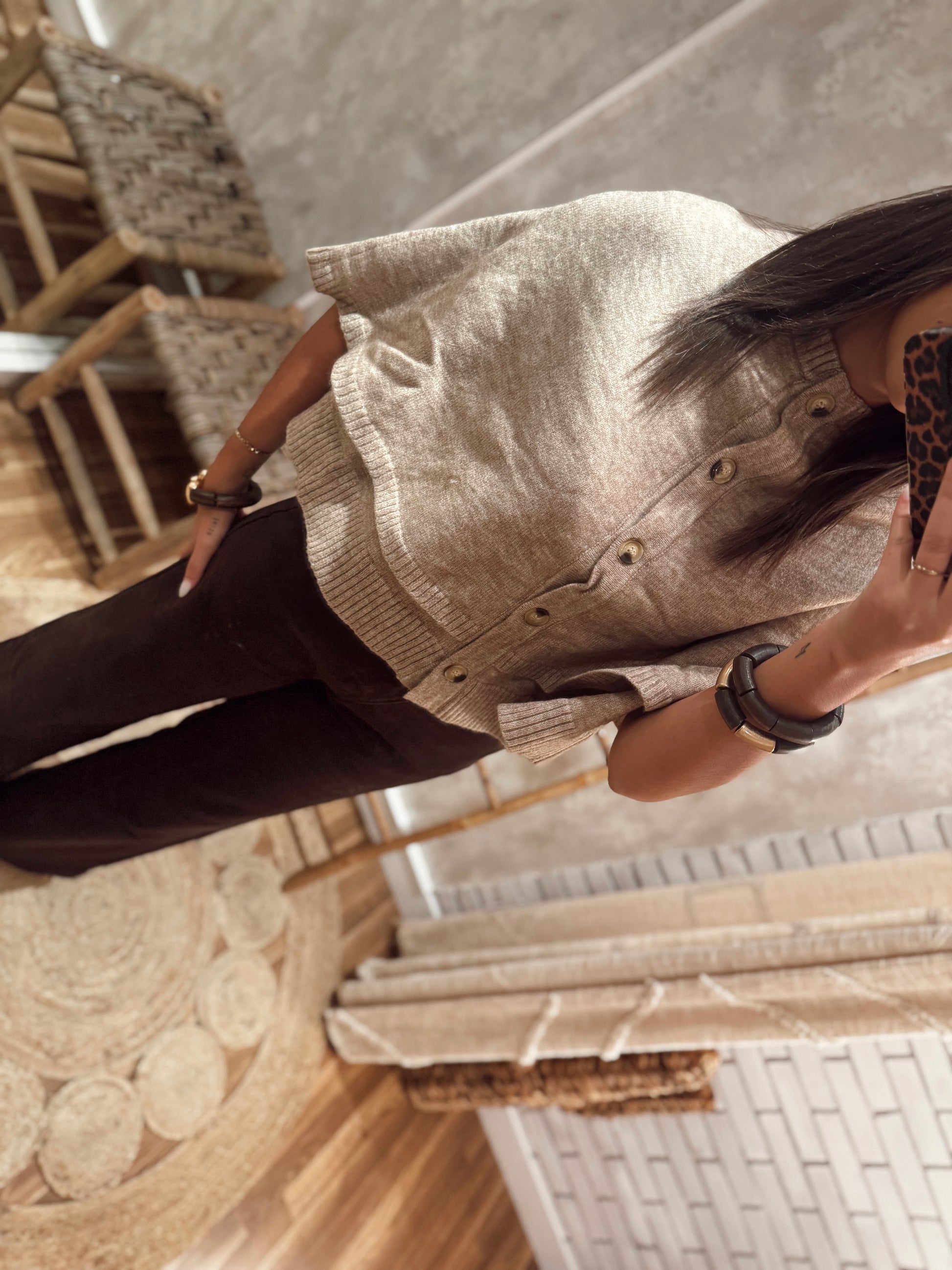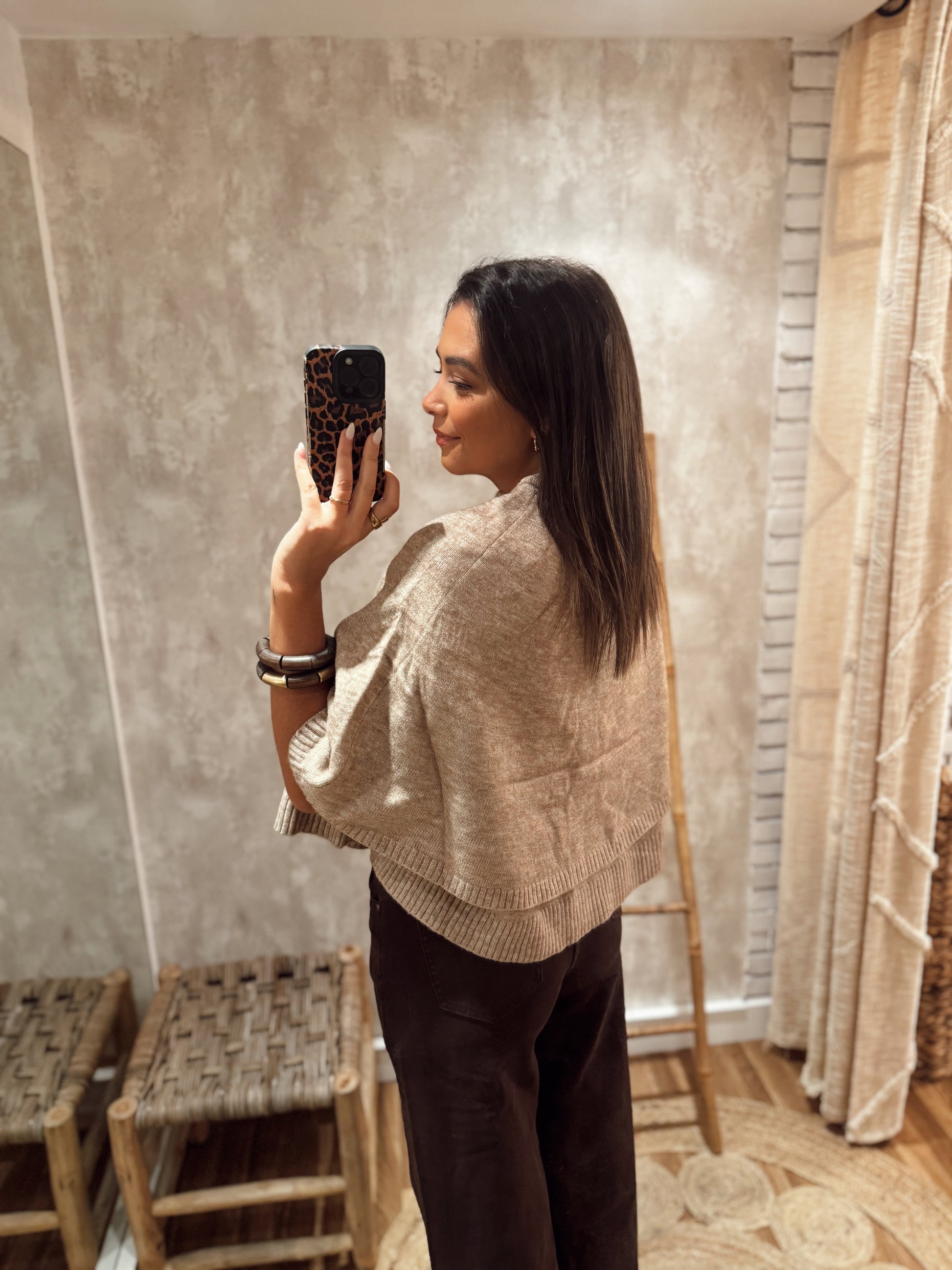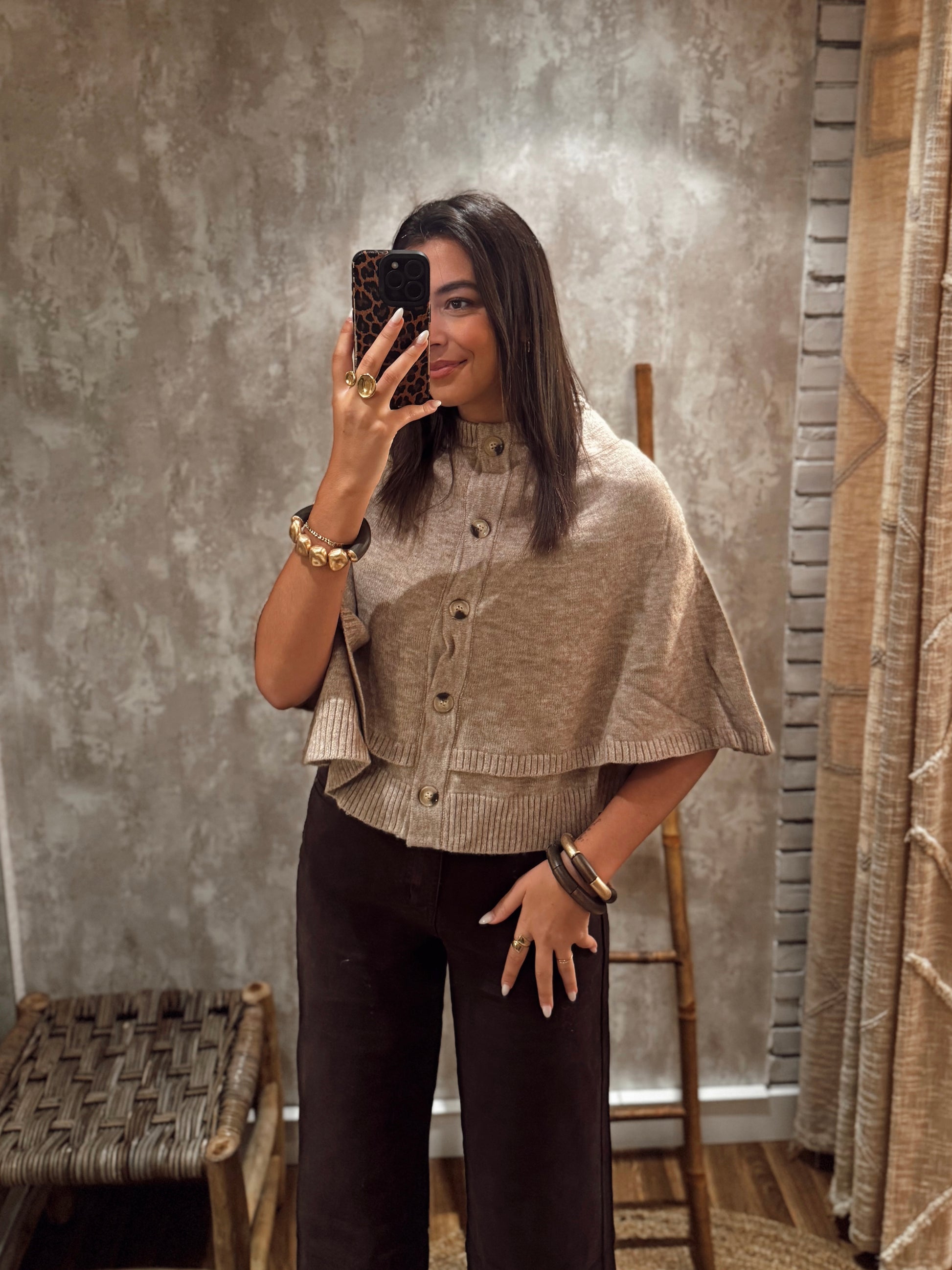 Capa em malha com efeito em camadas e botões frontais funcionais, que permitem usá-la também como um pequeno casaco. Versátil e elegante, é uma peça prática para complementar qualquer look com um toque sofisticado e aconchegante. Disponível em bege e castanho.