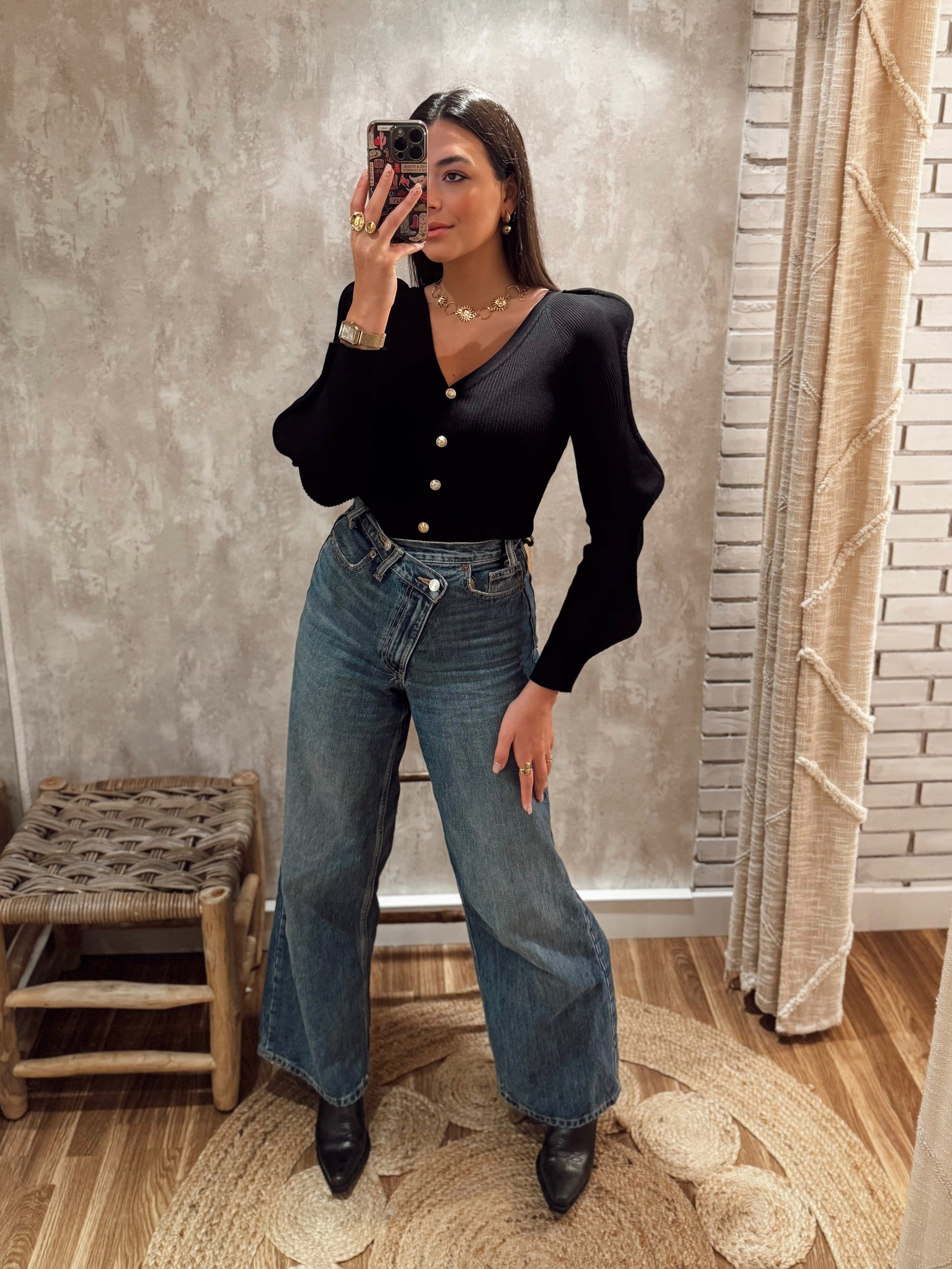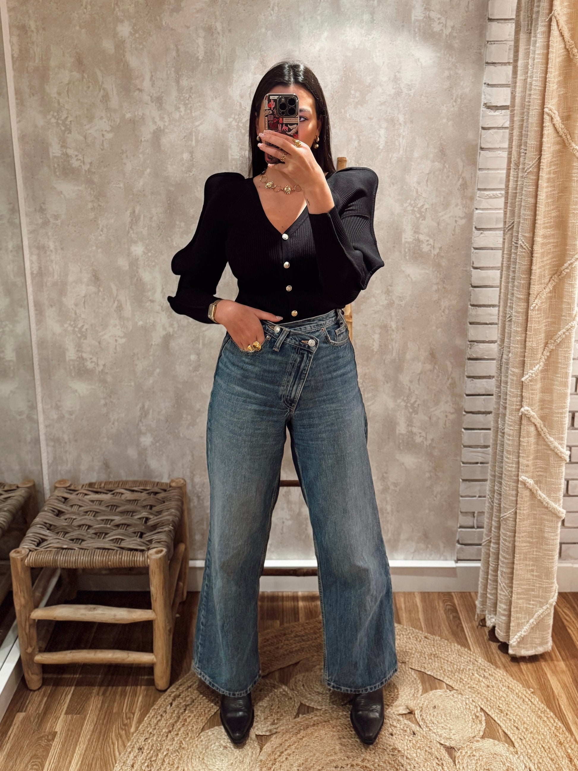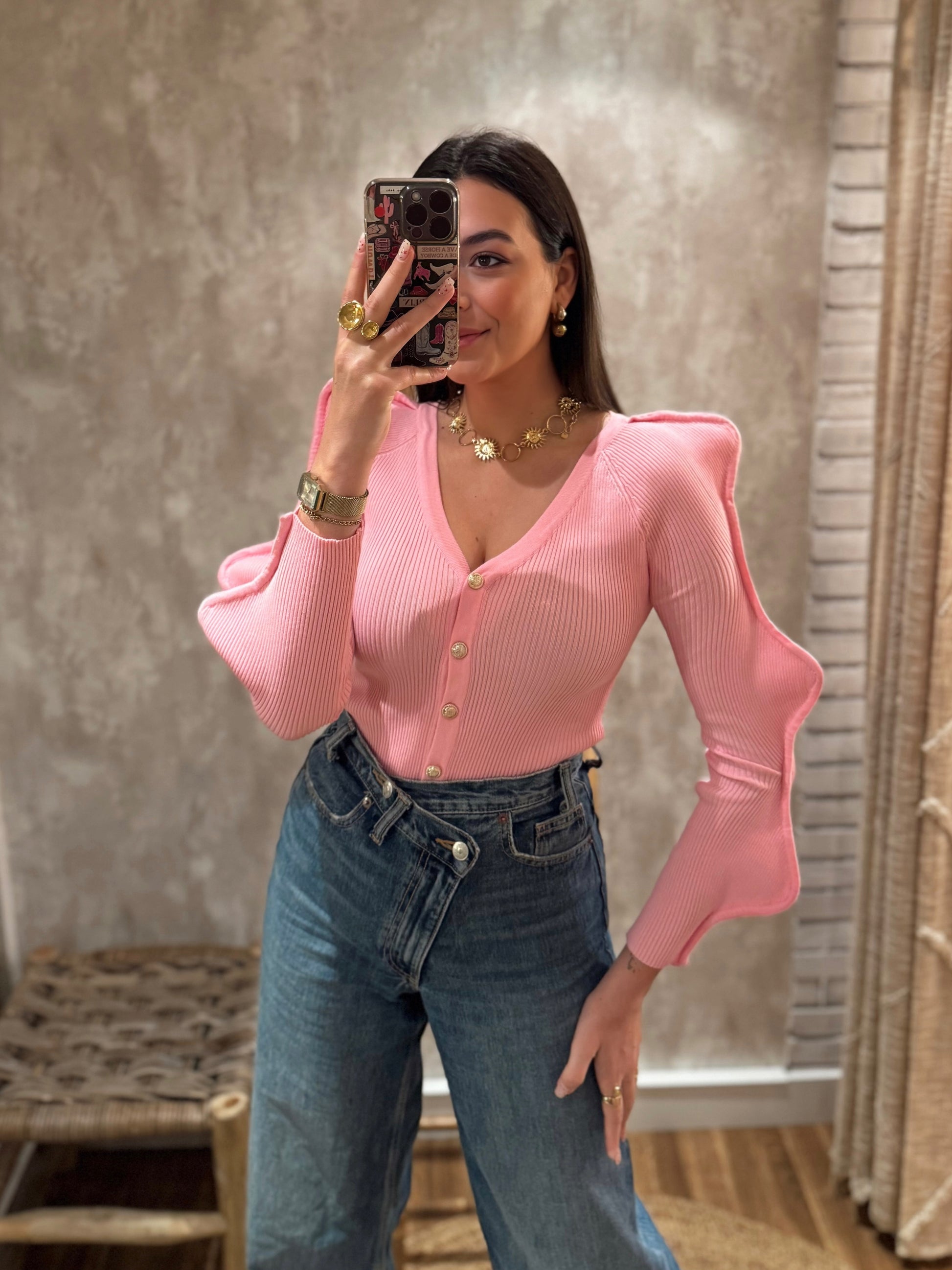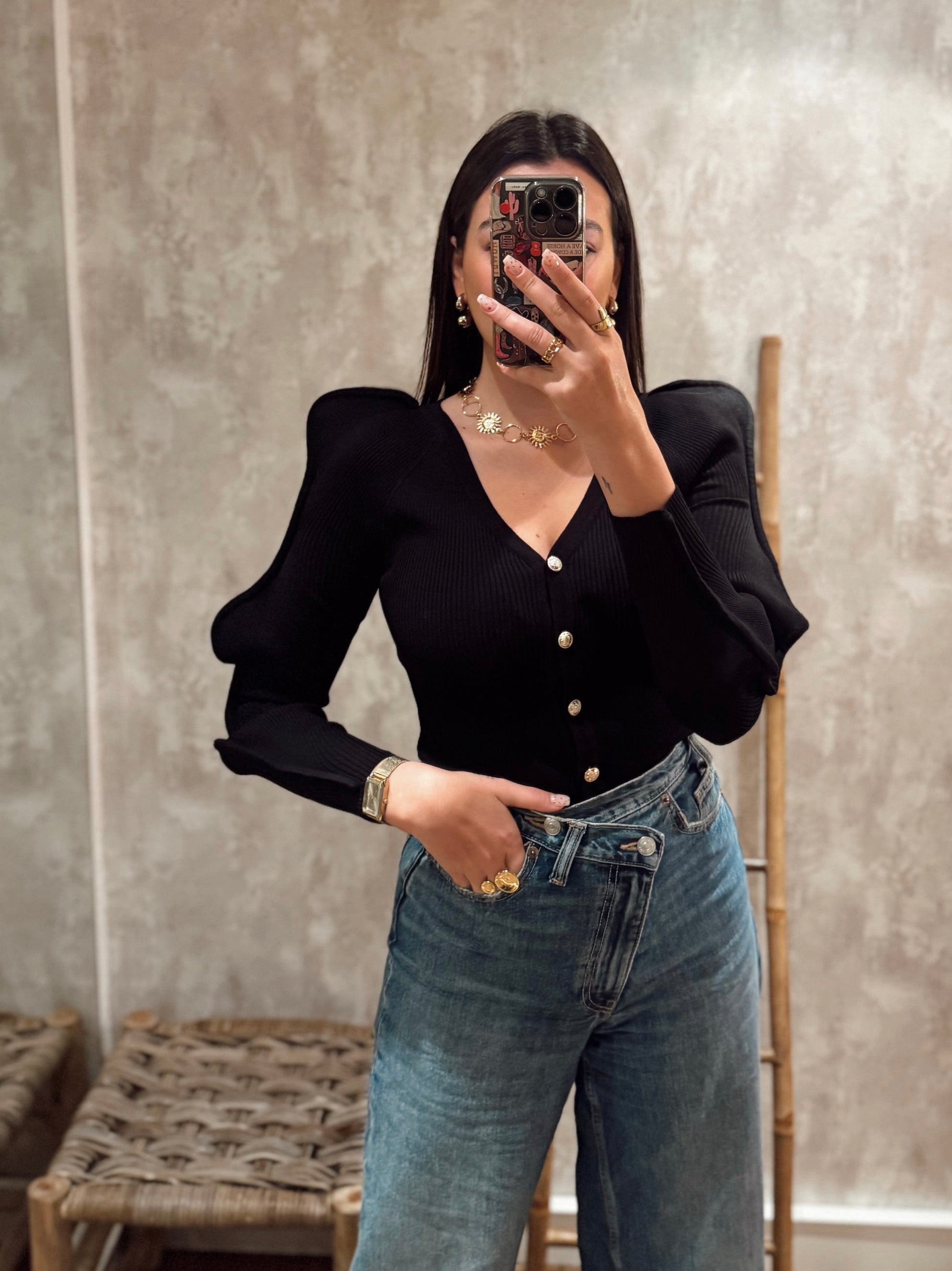 Abrigo de punto acanalado con detalles estructurados en las mangas, que crea un efecto llamativo y elegante. Se cierra con botones dorados en la parte delantera, lo que le aporta un toque sofisticado. Versátil y cómodo, es ideal para realzar cualquier look.