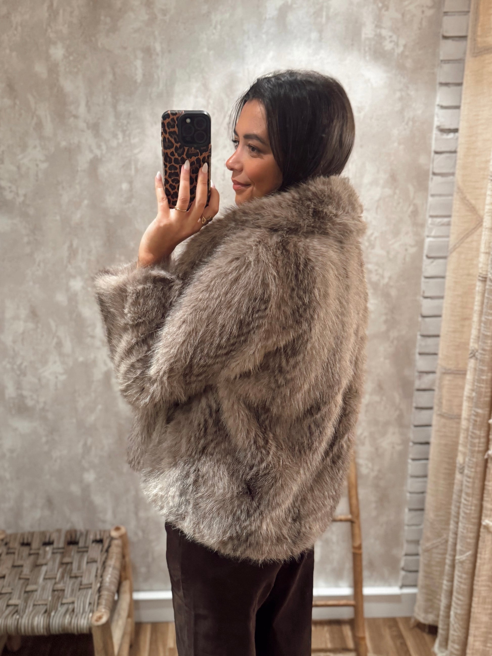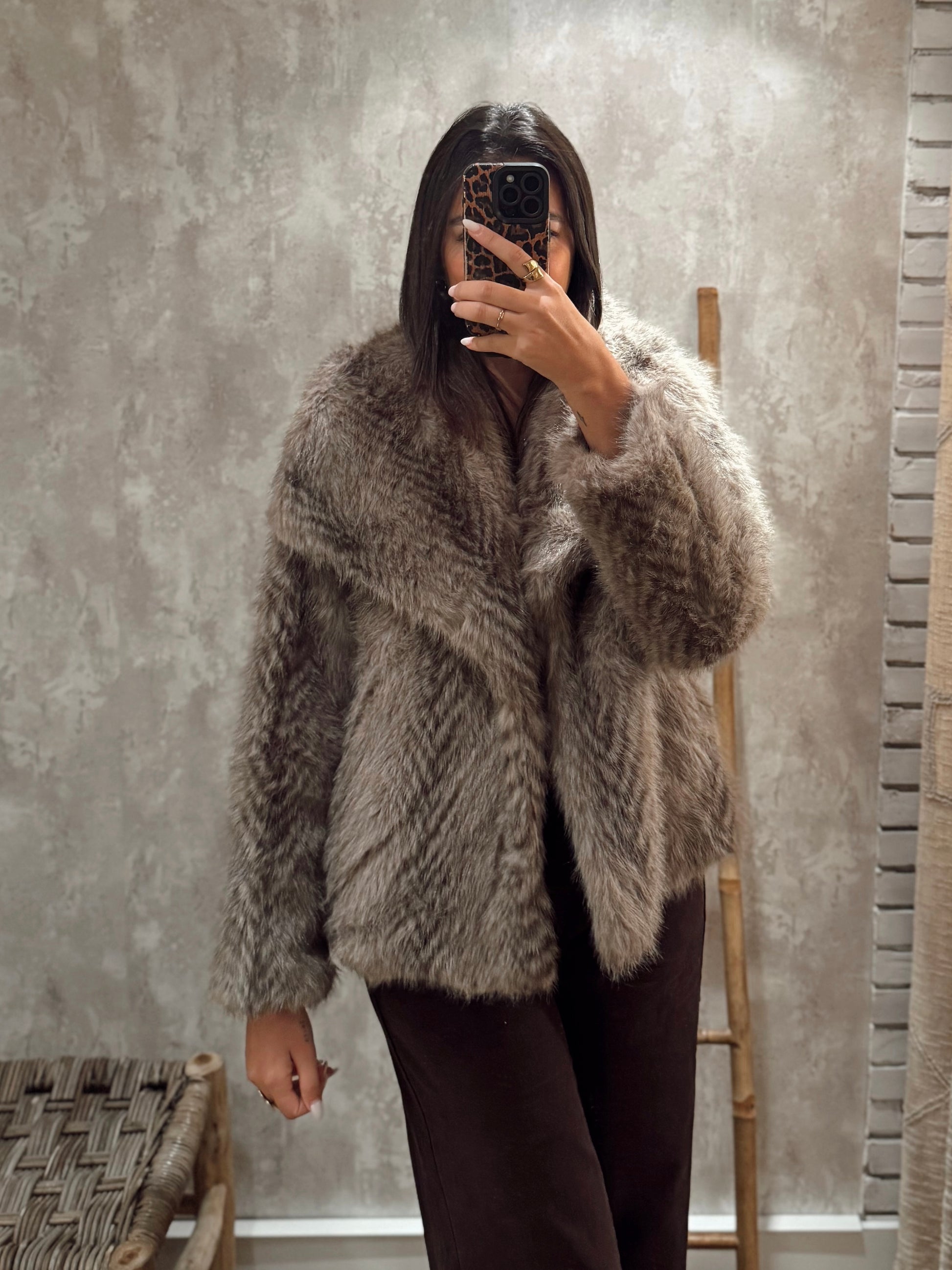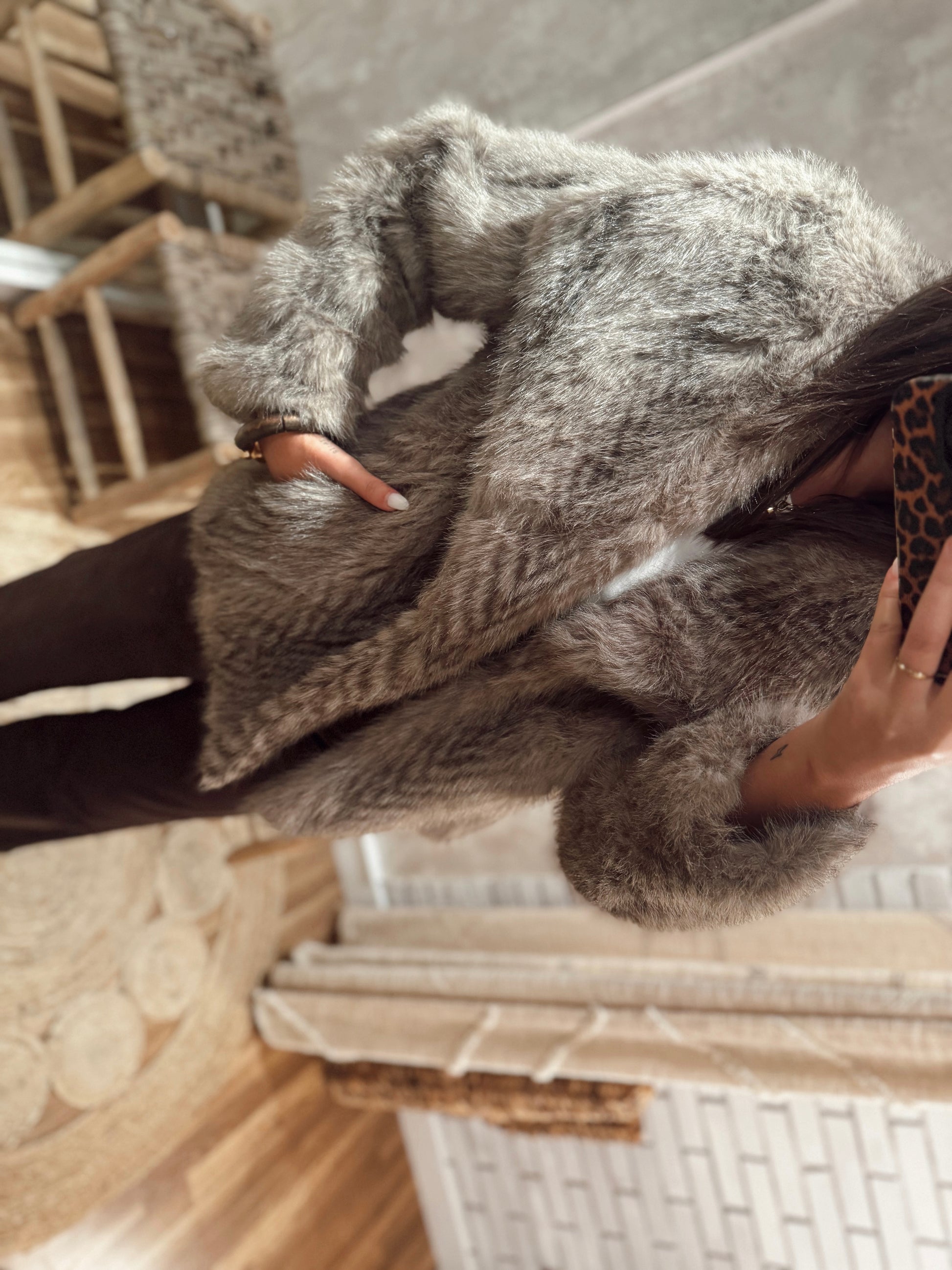 Casaco em pelo sintético com mistura de tons castanhos e bege, criando um efeito mesclado moderno e sofisticado. O corte solto e a gola ampla tornam-no perfeito para conjugar tanto em looks casuais como mais elegantes.