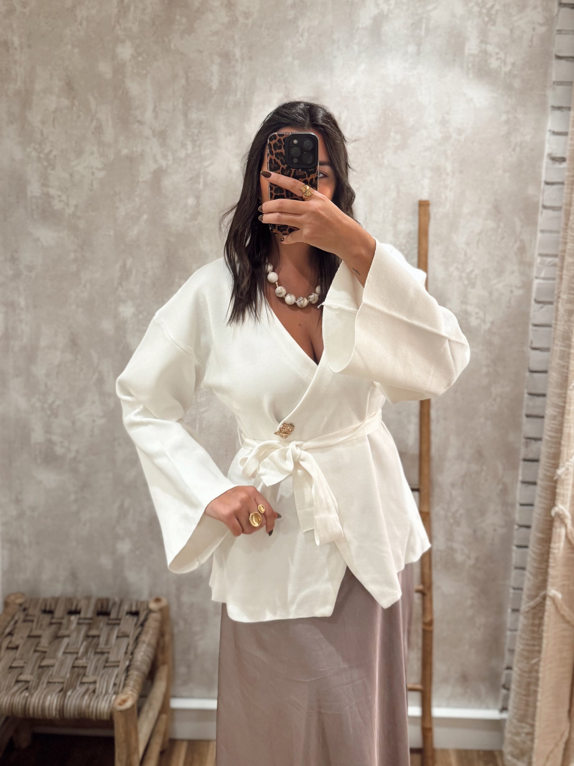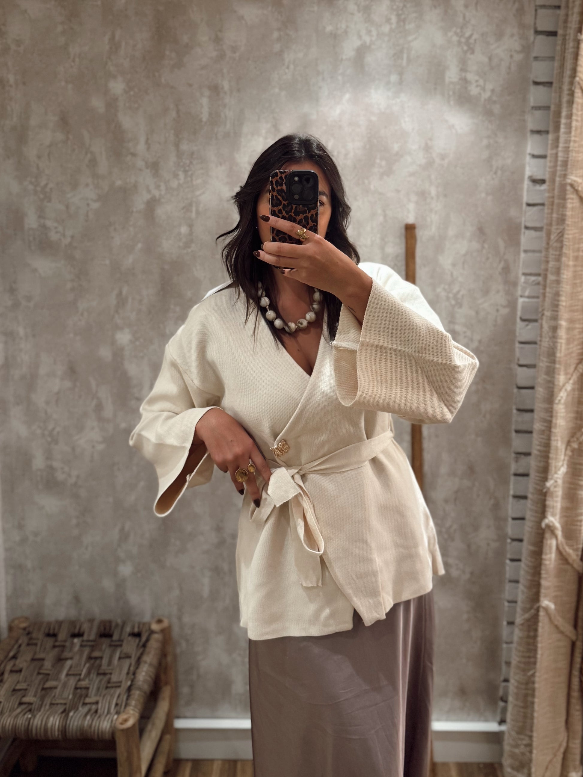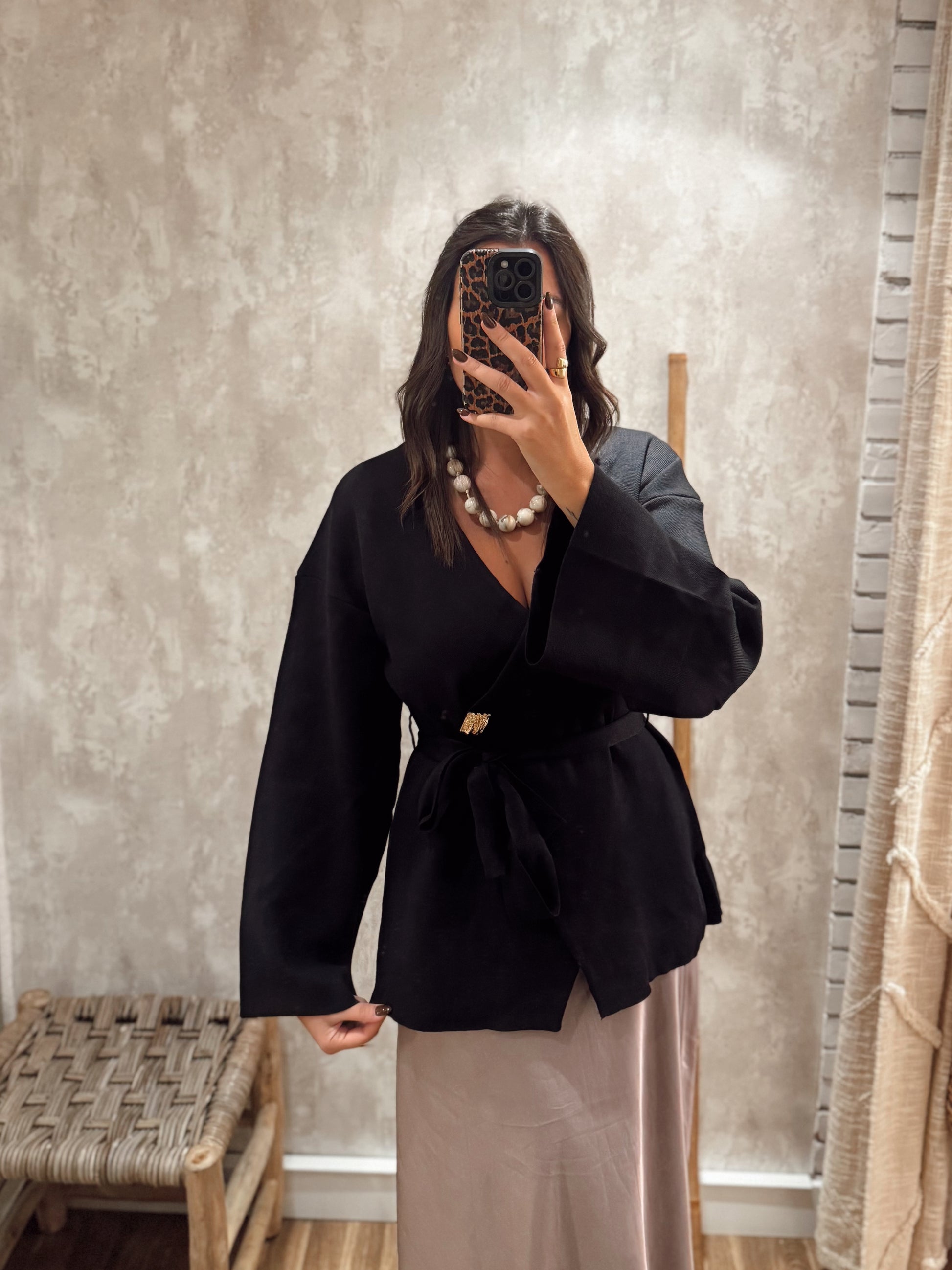 Casaco em malha premium de corte cruzado, com fita para cintar e formar uma laçada que realça a silhueta. O pormenor metálico dourado confere-lhe um toque elegante, enquanto as mangas largas dão movimento e sofisticação ao look. Uma peça versátil e cheia de estilo, perfeita para composições mais clássicas ou descontraídas.