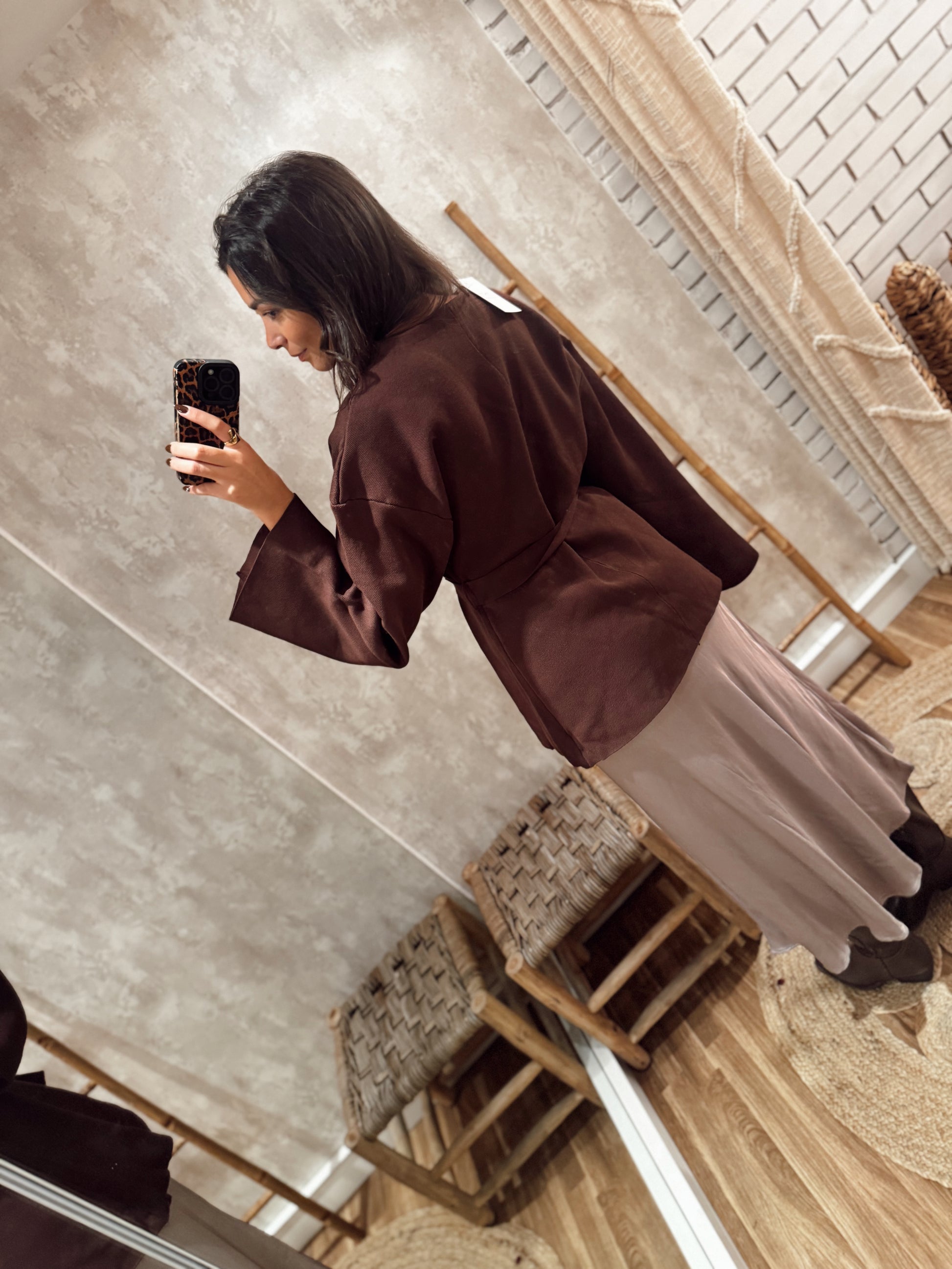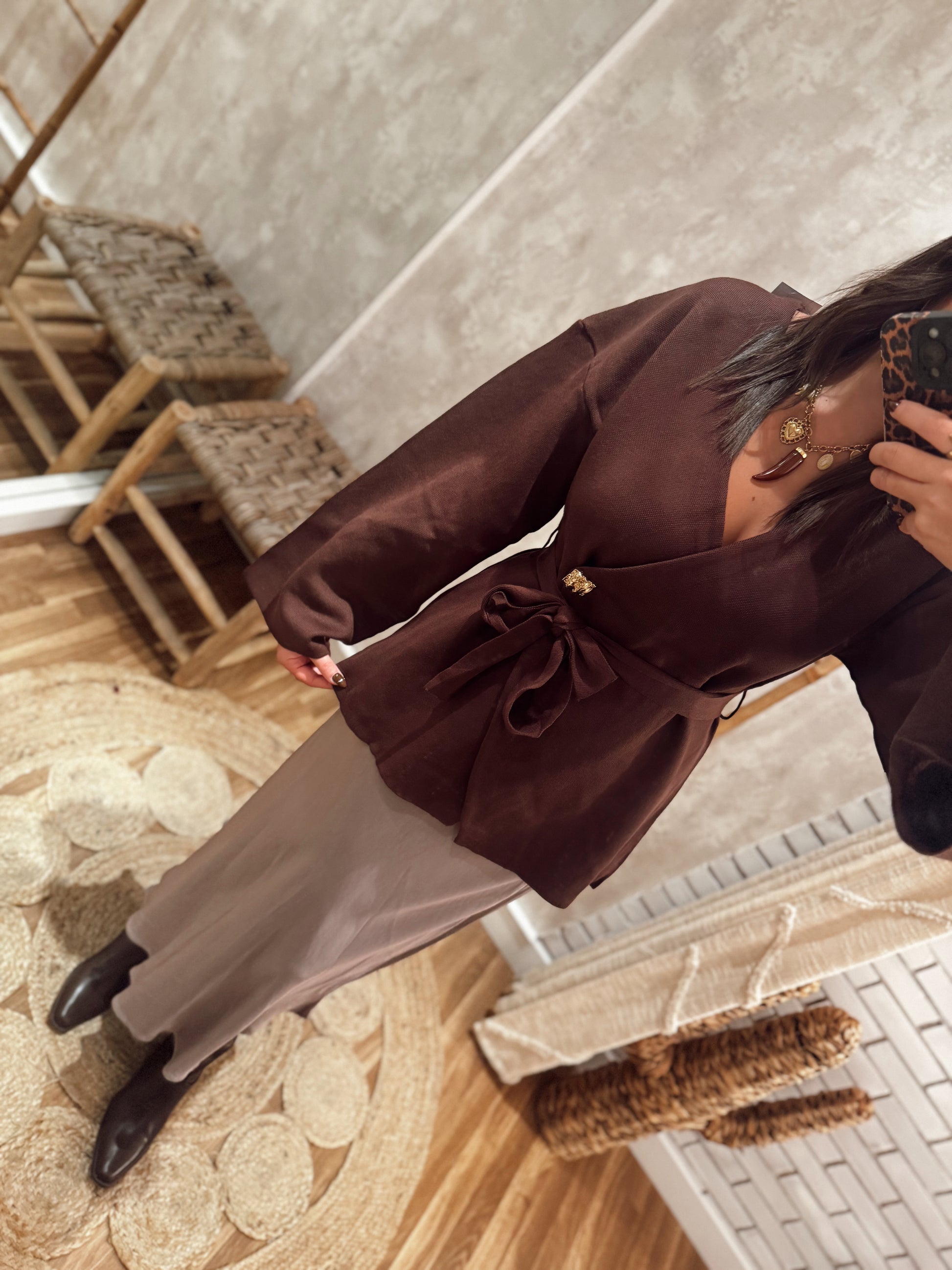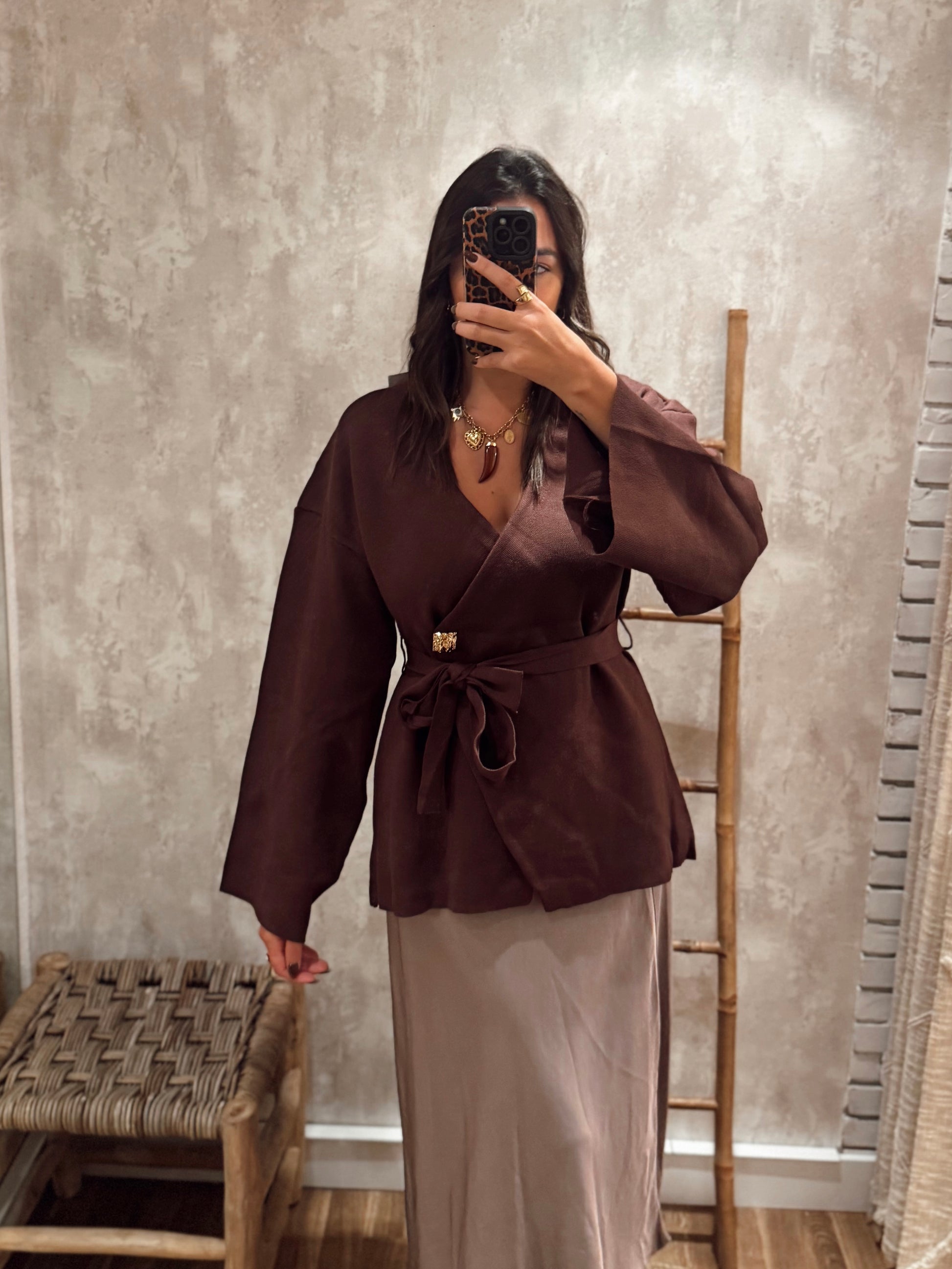Casaco em malha premium de corte cruzado, com fita para cintar e formar uma laçada que realça a silhueta. O pormenor metálico dourado confere-lhe um toque elegante, enquanto as mangas largas dão movimento e sofisticação ao look. Uma peça versátil e cheia de estilo, perfeita para composições mais clássicas ou descontraídas.