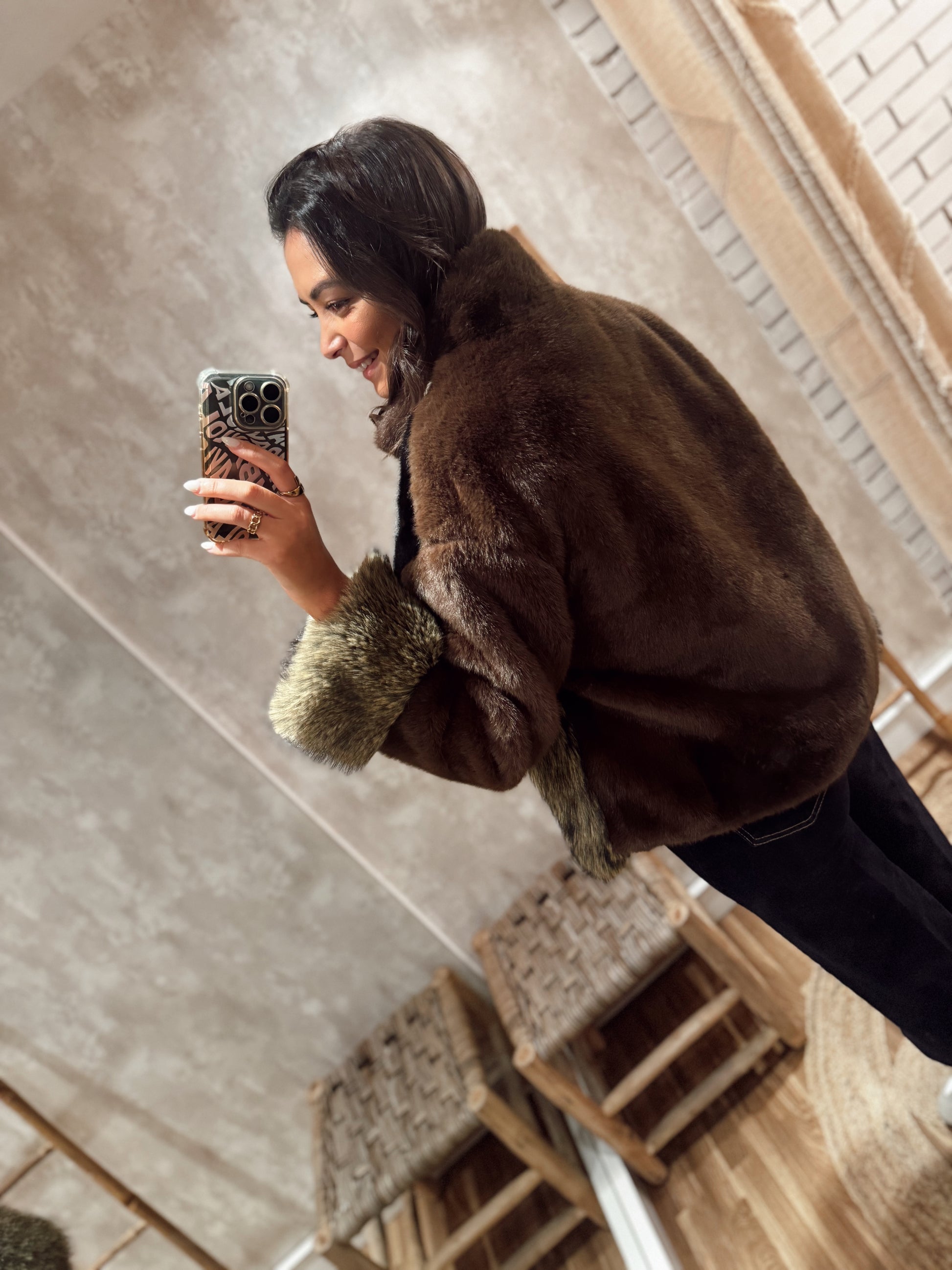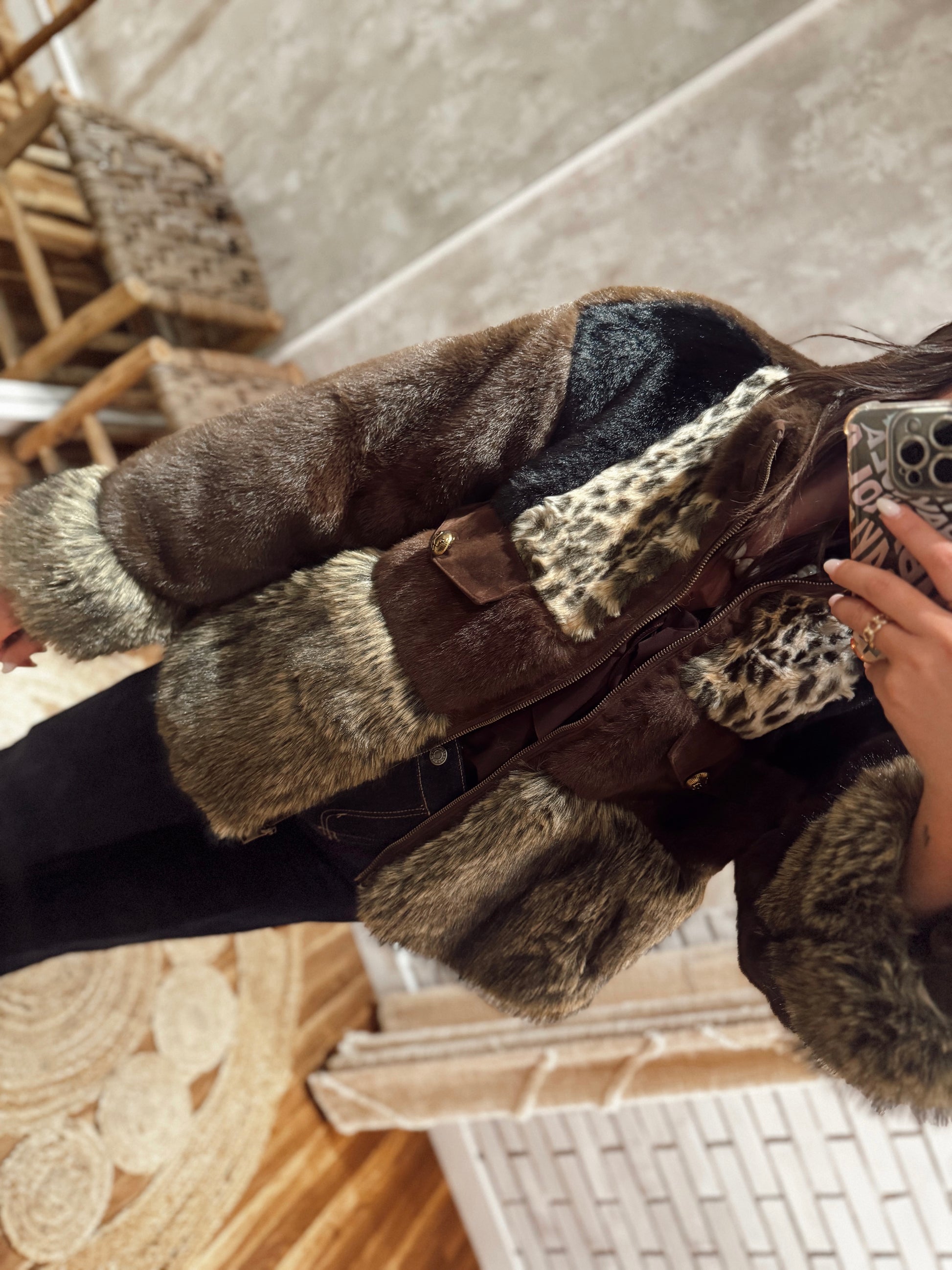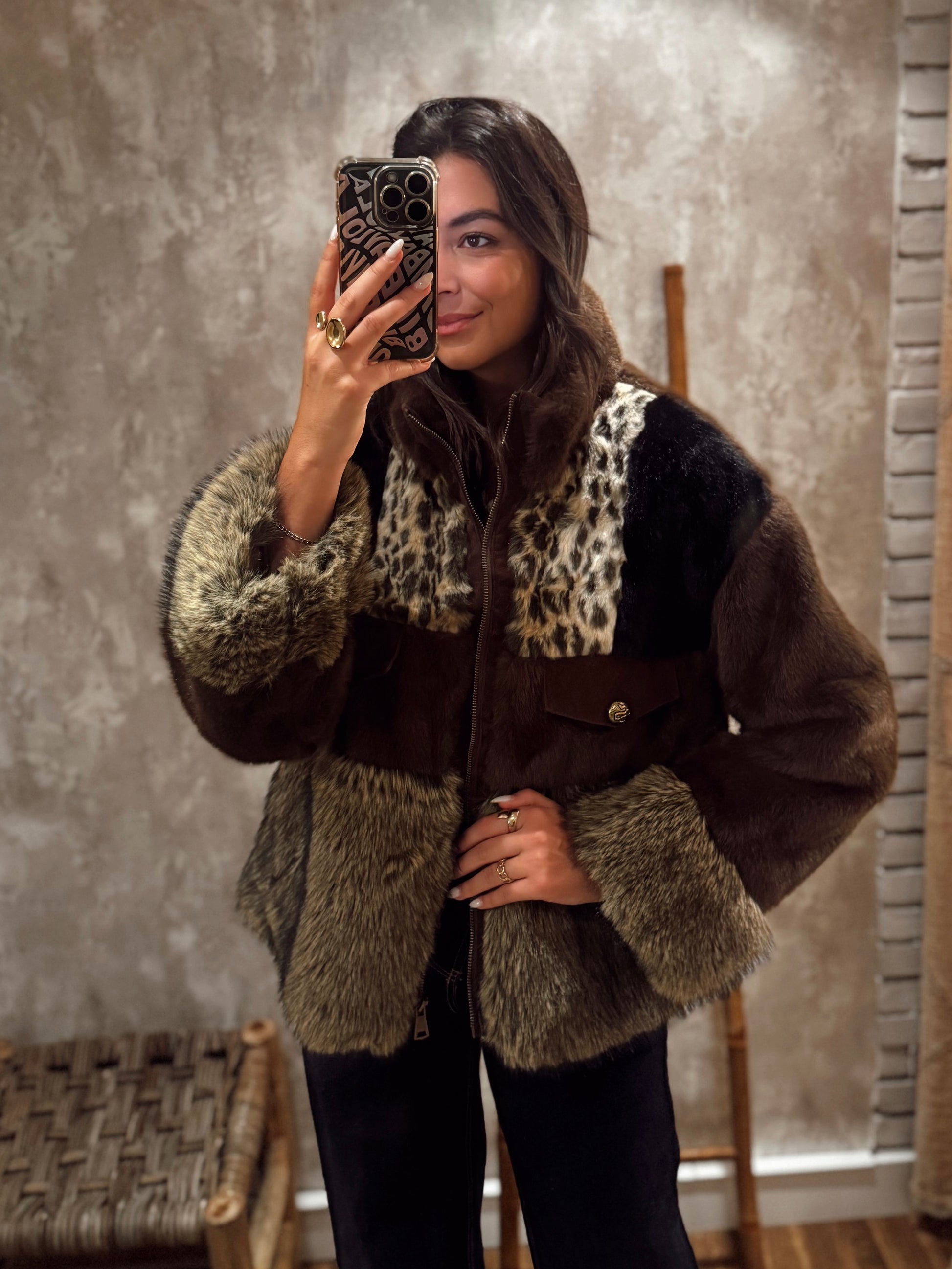 Casaco em pelo sintético com zíper frontal, uma peça cheia de estilo e personalidade. O seu design é marcado pelo jogo de cores e texturas, incluindo detalhe de padrão animal que o torna ainda mais especial. Tem bolsos frontais com aba e botão, além de um corte confortável e moderno. Um casaco quente e cheio de impacto, perfeito para quem gosta de se destacar.