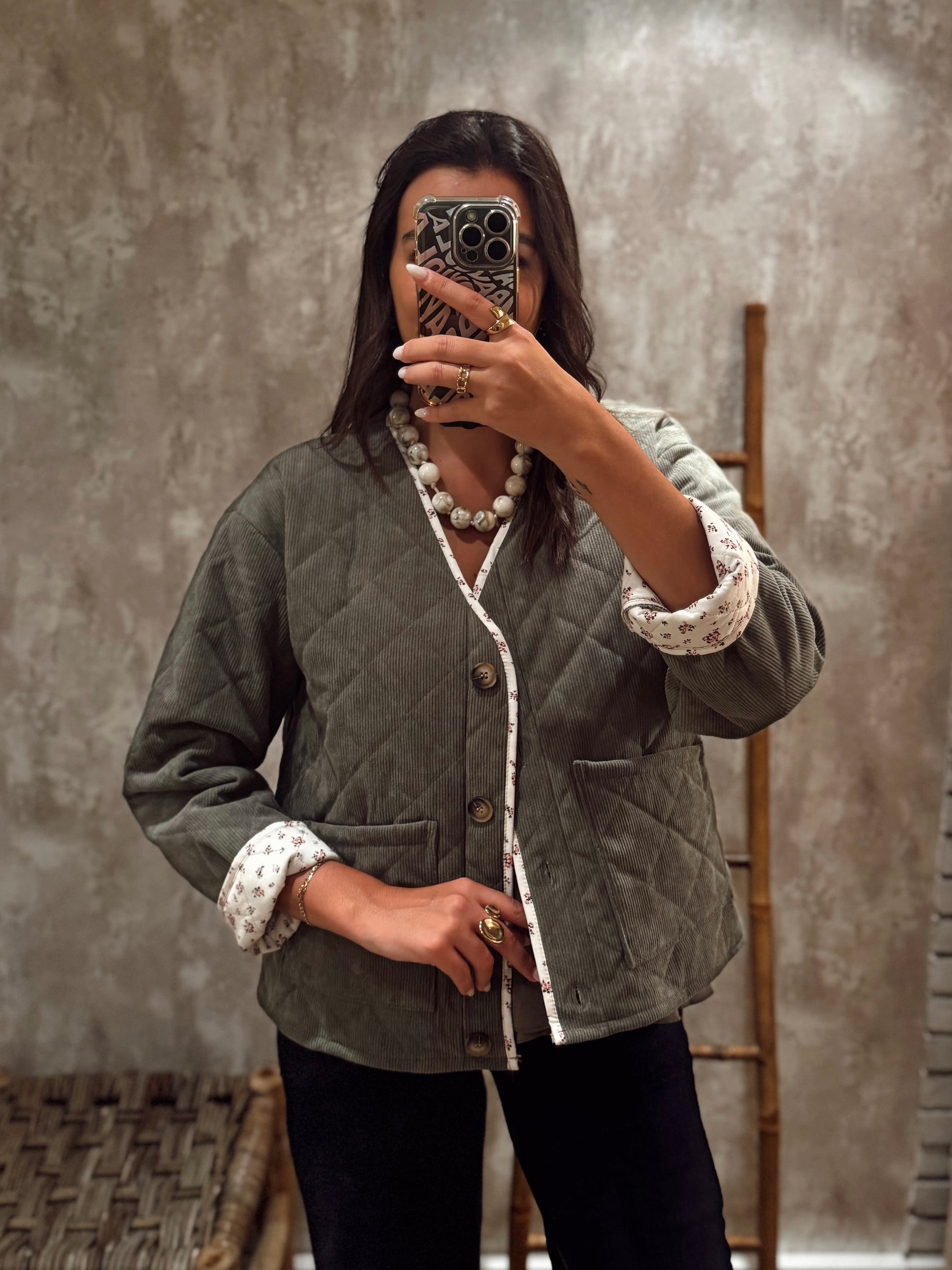 Casaco em tecido bombazina acolchoado, super confortável e cheio de detalhes especiais. O forro em padrão floral minimalista destaca-se tanto na costura frontal como quando se dobra as mangas, deixando o detalhe visível e delicado. Um modelo versátil, ideal para o dia a dia, que une estilo e praticidade.
