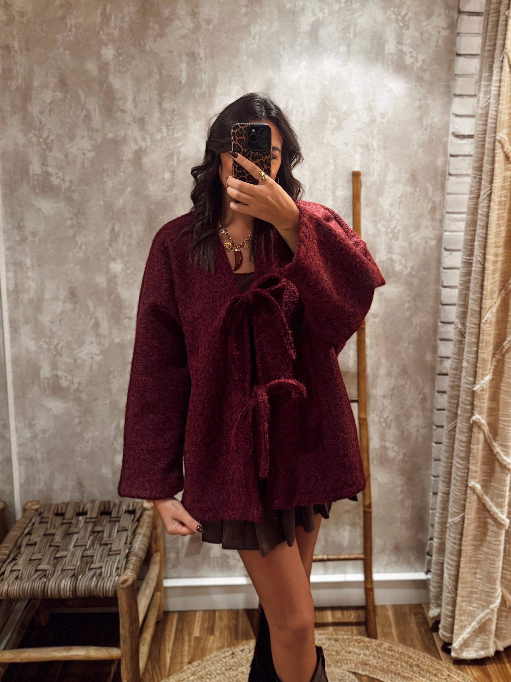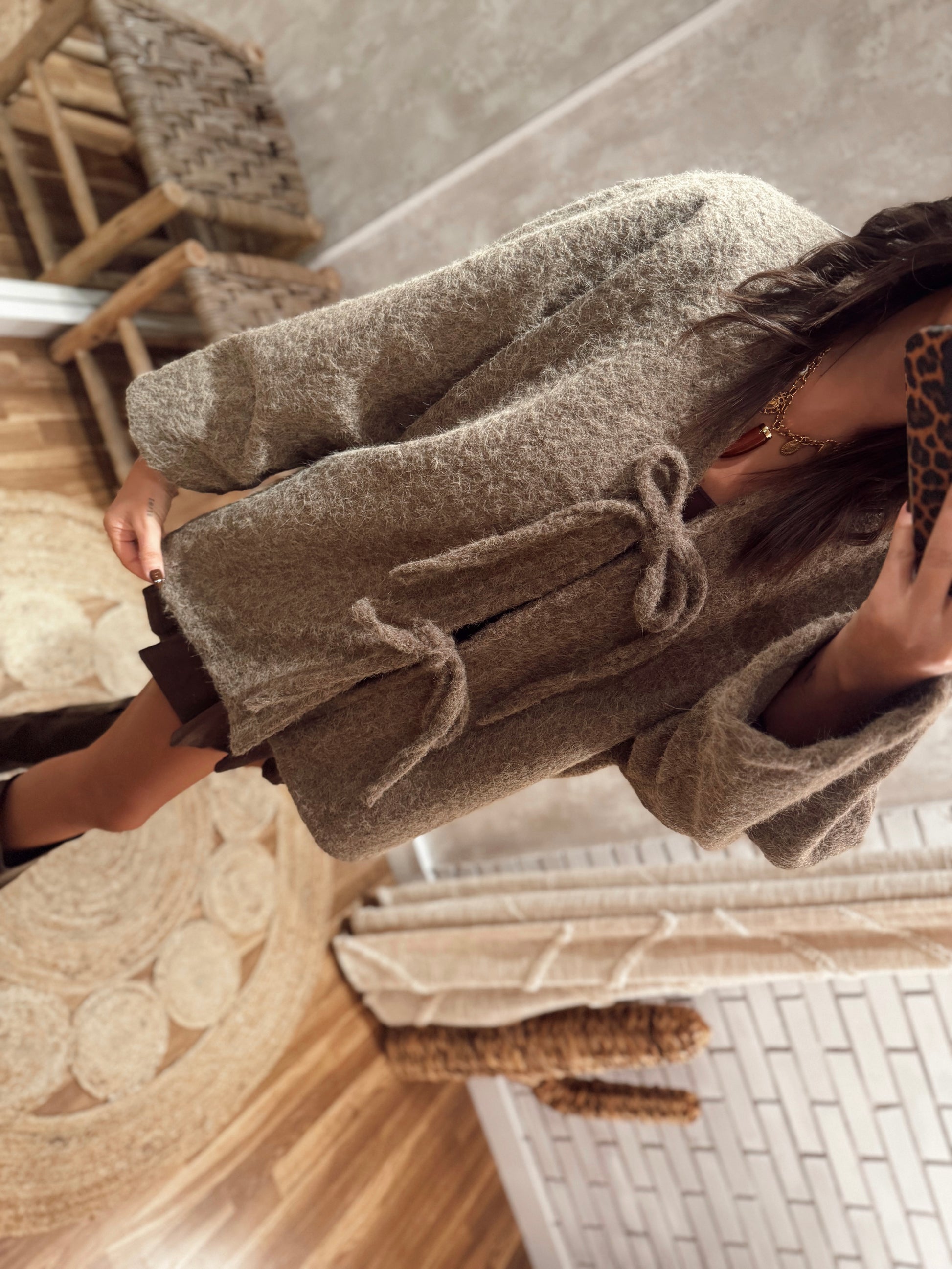 Casaco em tecido tipo fazenda com toque de pelo suave — aquele género de peça quentinha, confortável e cheia de estilo 🍂 O modelo é oversized, com laços na parte da frente que lhe dão um ar elegante e descontraído ao mesmo tempo. M