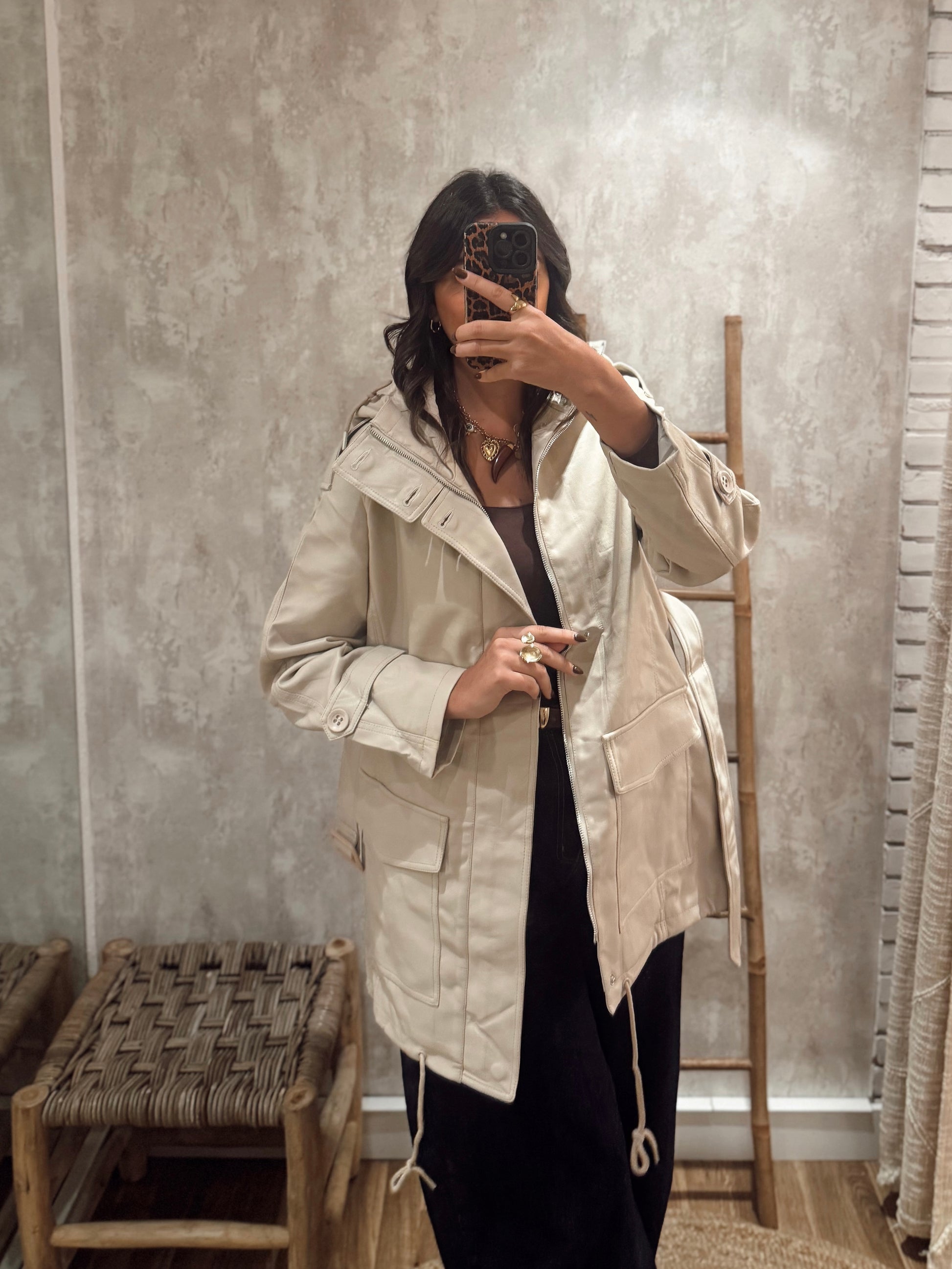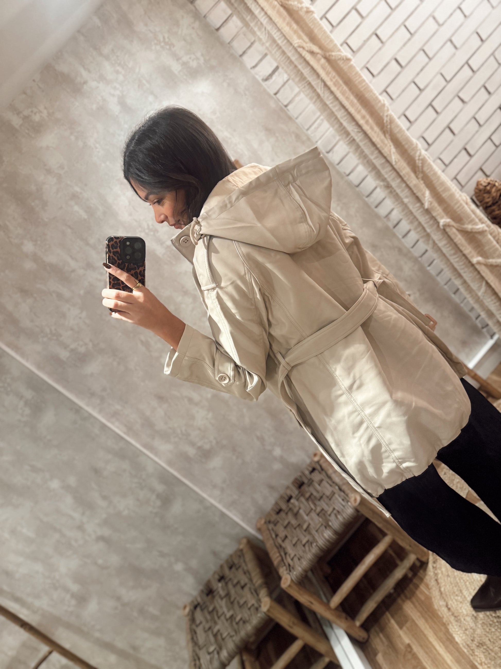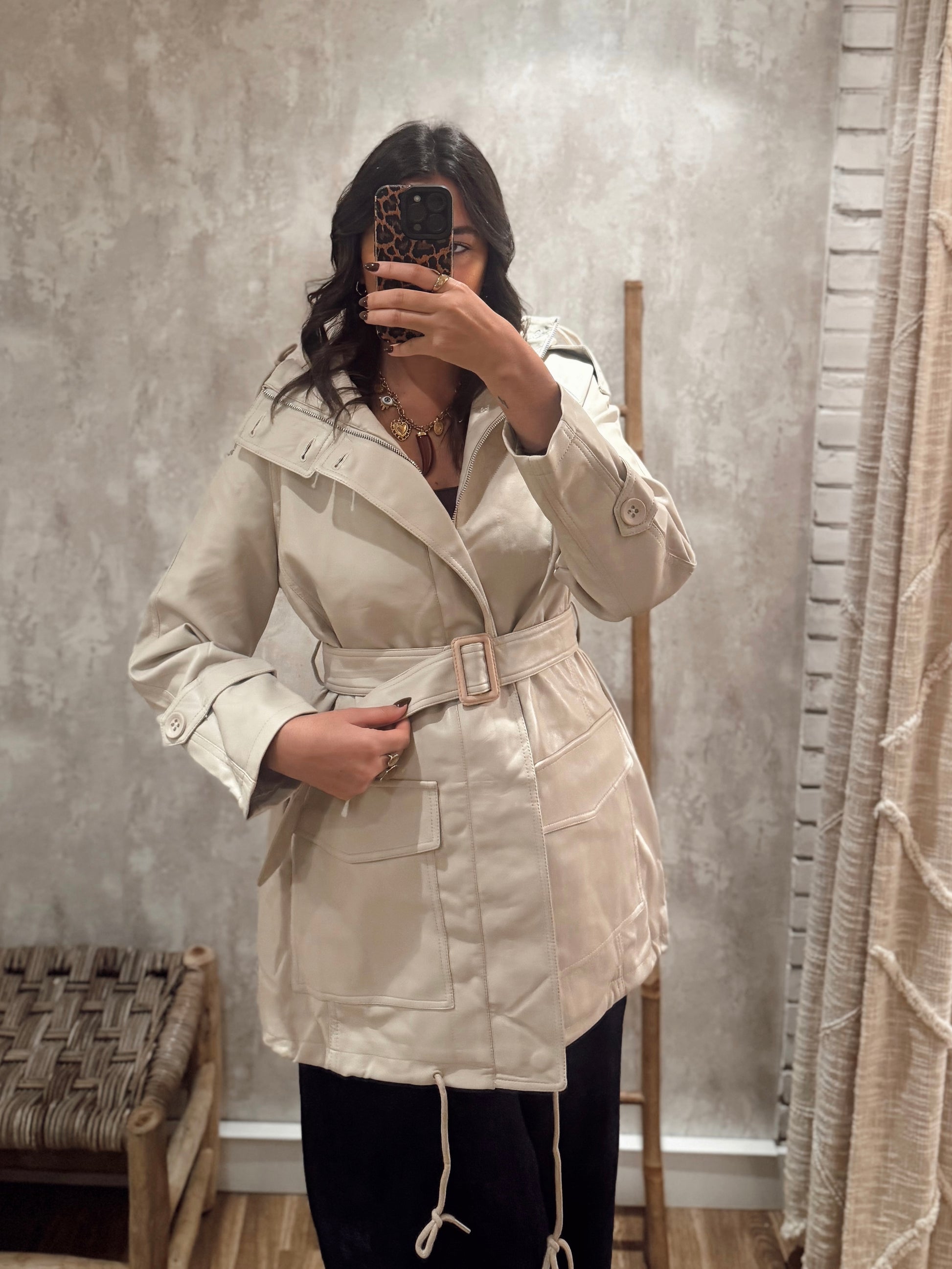 Casaco tipo gabardine curto em eco pele, com capuz e cinto ajustável na cintura. Tem fecho em zíper, bolsos frontais e acabamento de excelente qualidade — perfeito para dias mais frios ou chuvosos, sem perder o estilo. Uma peça prática, versátil e cheia de presença ✨