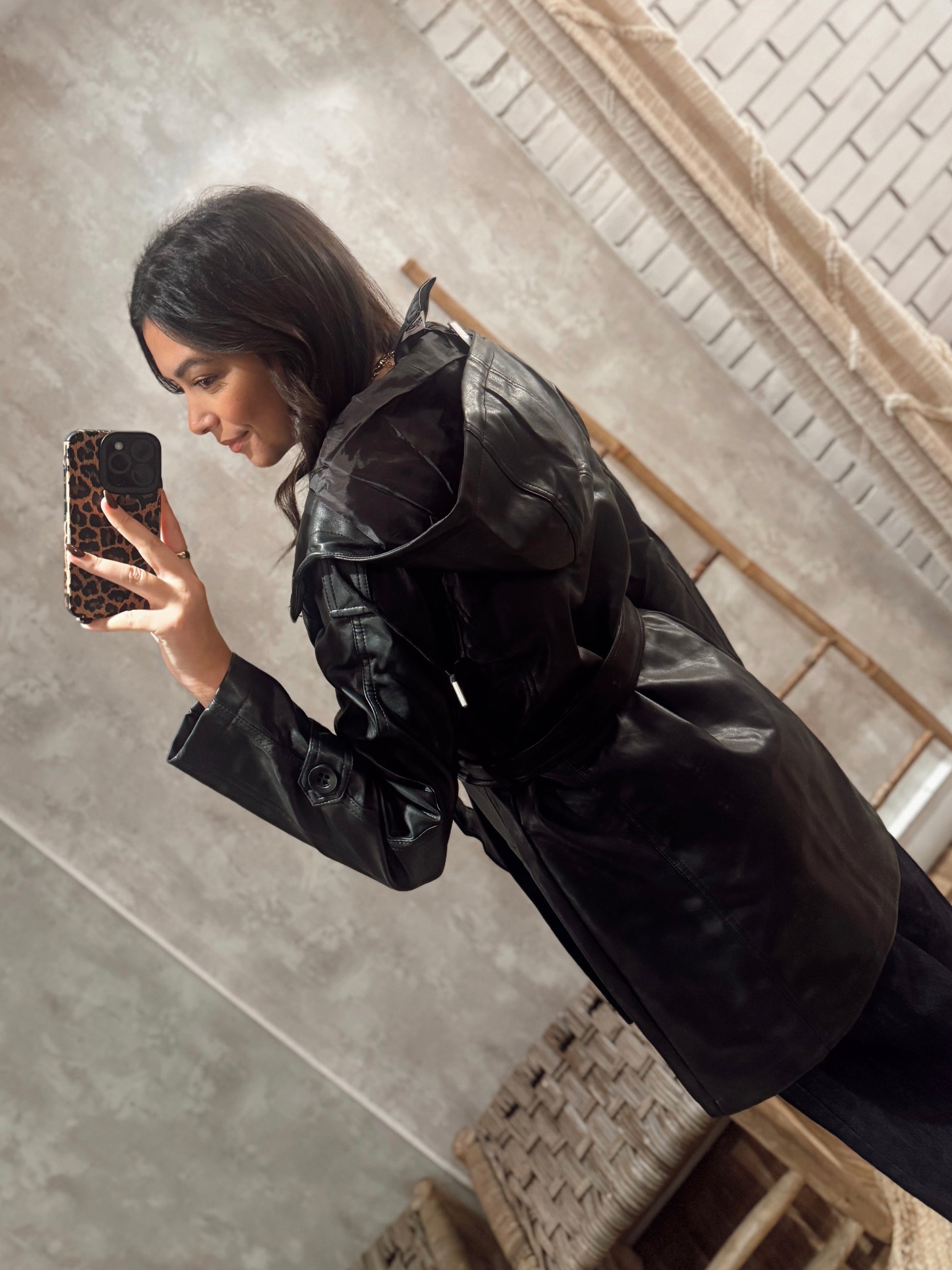 Casaco tipo gabardine curto em eco pele, com capuz e cinto ajustável na cintura. Tem fecho em zíper, bolsos frontais e acabamento de excelente qualidade — perfeito para dias mais frios ou chuvosos, sem perder o estilo. Uma peça prática, versátil e cheia de presença ✨