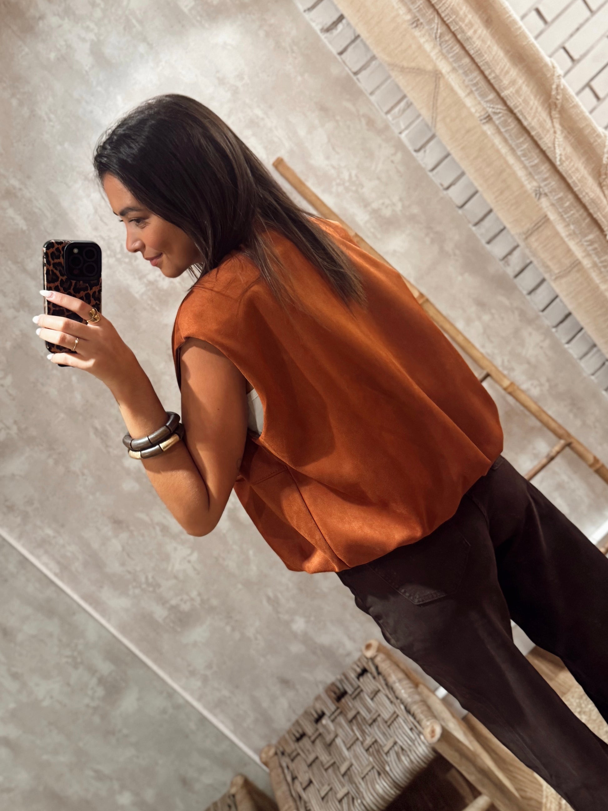 Colete em pele de pêssego com corte abalonado