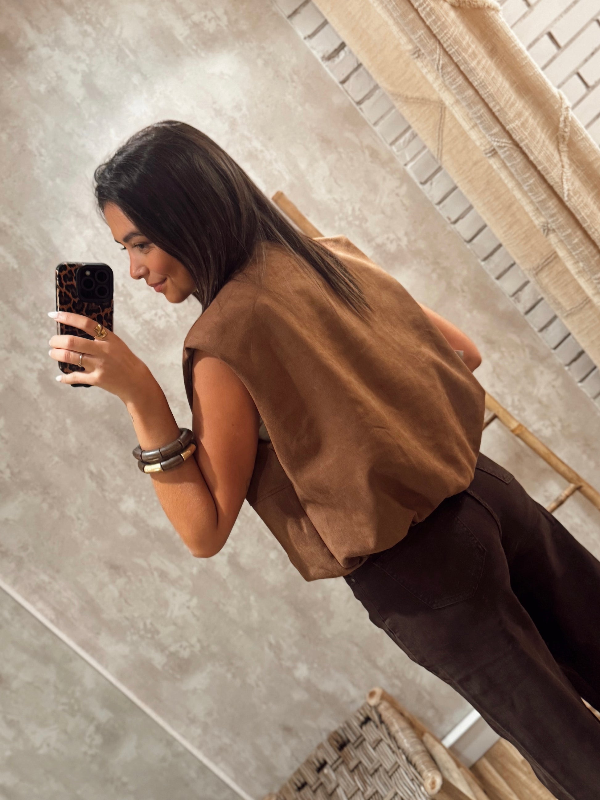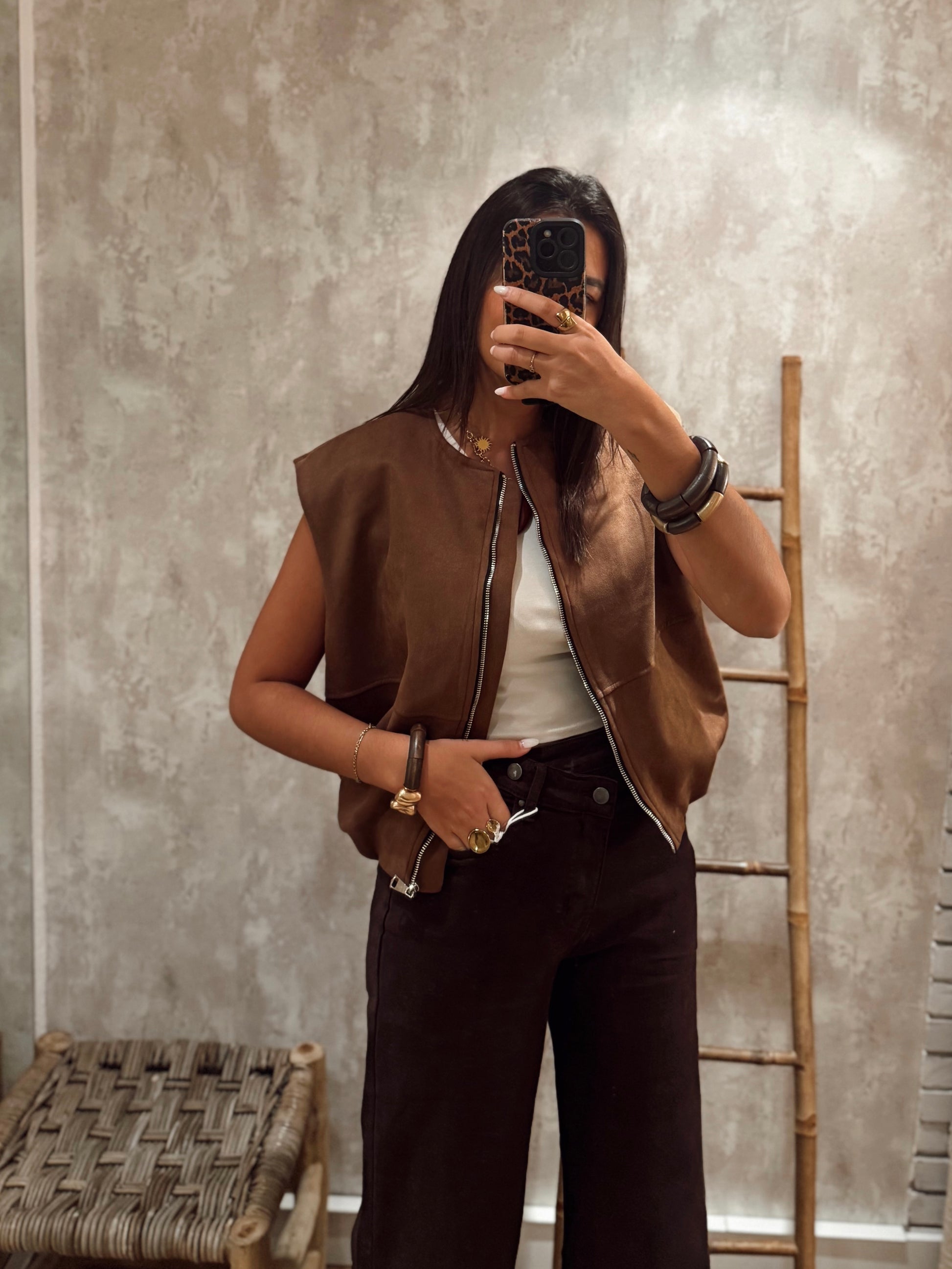 Colete em pele de pêssego com corte abalonado e fecho frontal em zíper. Um modelo moderno e versátil, perfeito para sobrepor em camisas, malhas ou blusas básicas. Disponível em dois tons, caramelo e castanho, ambos com toque suave e acabamento elegante.
