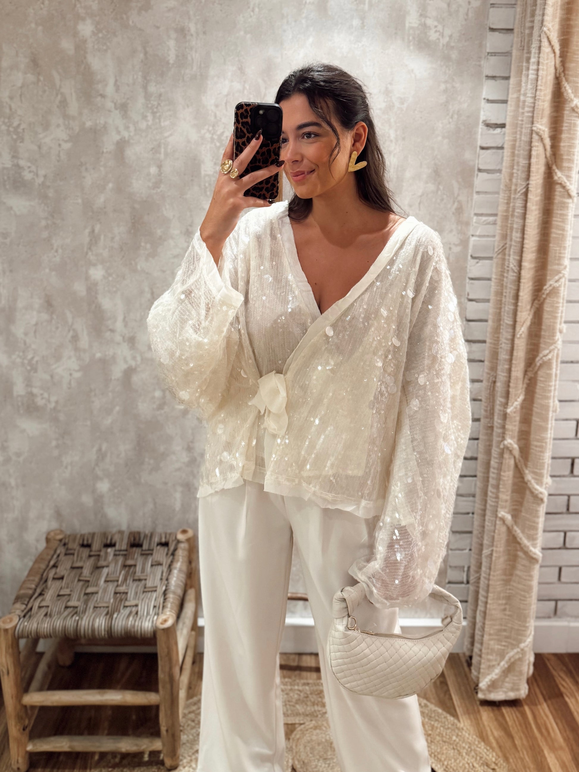 Com um tecido leve e fluido, repleto de lantejoulas delicadas, este modelo traz um toque sofisticado e festivo a qualquer look.