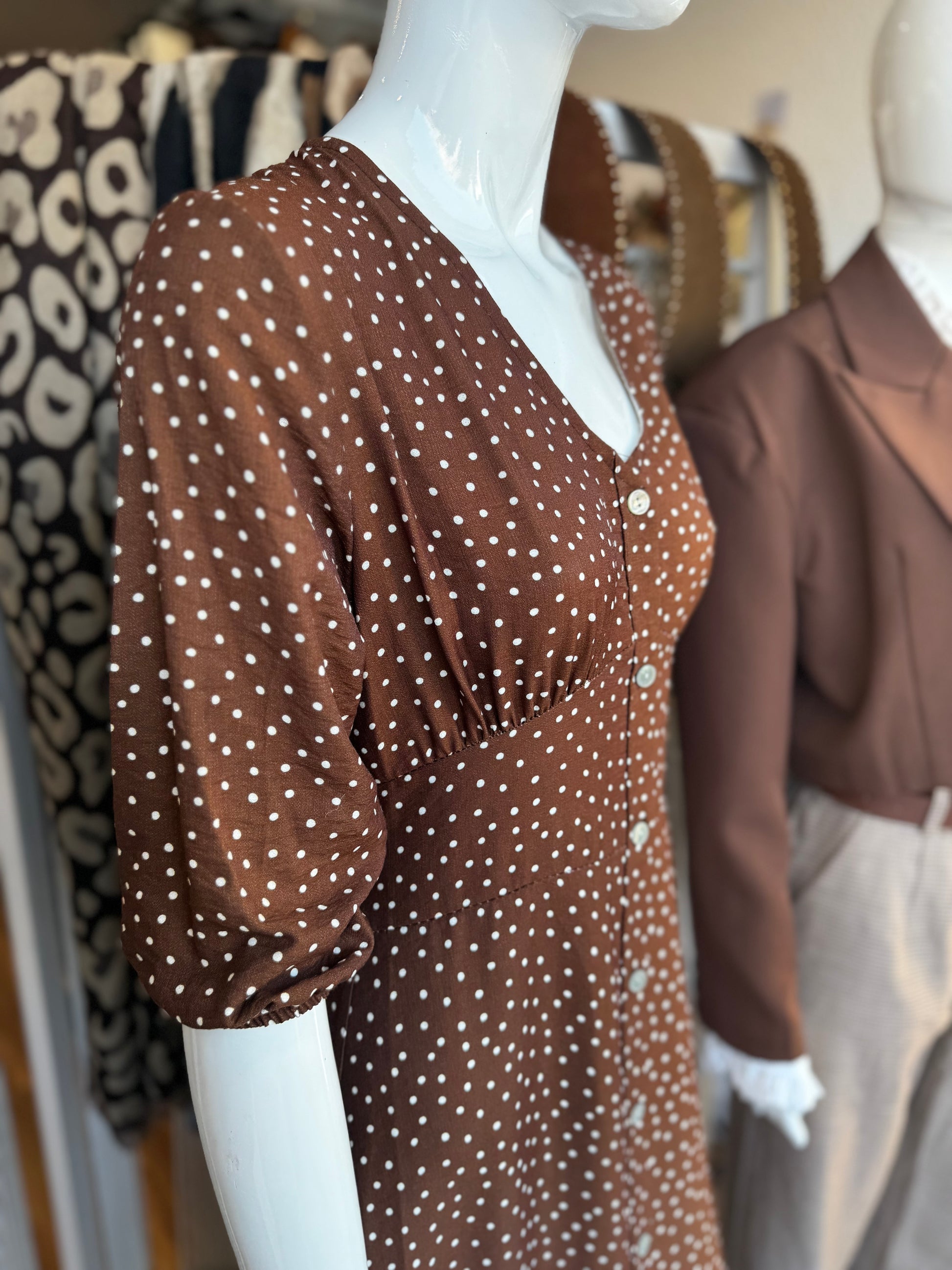 Vestido comprido com padrão de pintinhas, super feminino e intemporal. O modelo apresenta botões frontais em toda a peça, manga curta com leve volume e corte fluído que alonga a silhueta. Uma peça versátil que pode ser usada tanto de forma mais casual como em looks mais arranjados.