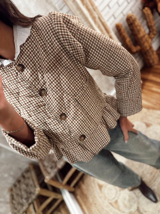 Casaco acolchoado aos quadradinhos com folhos