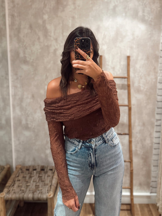 Blusa romântica em renda com decote ombro a ombro