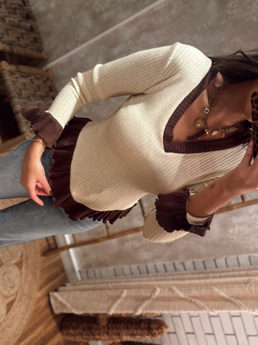 Camisola em malha canelada c/ detalhe de folhos em contraste