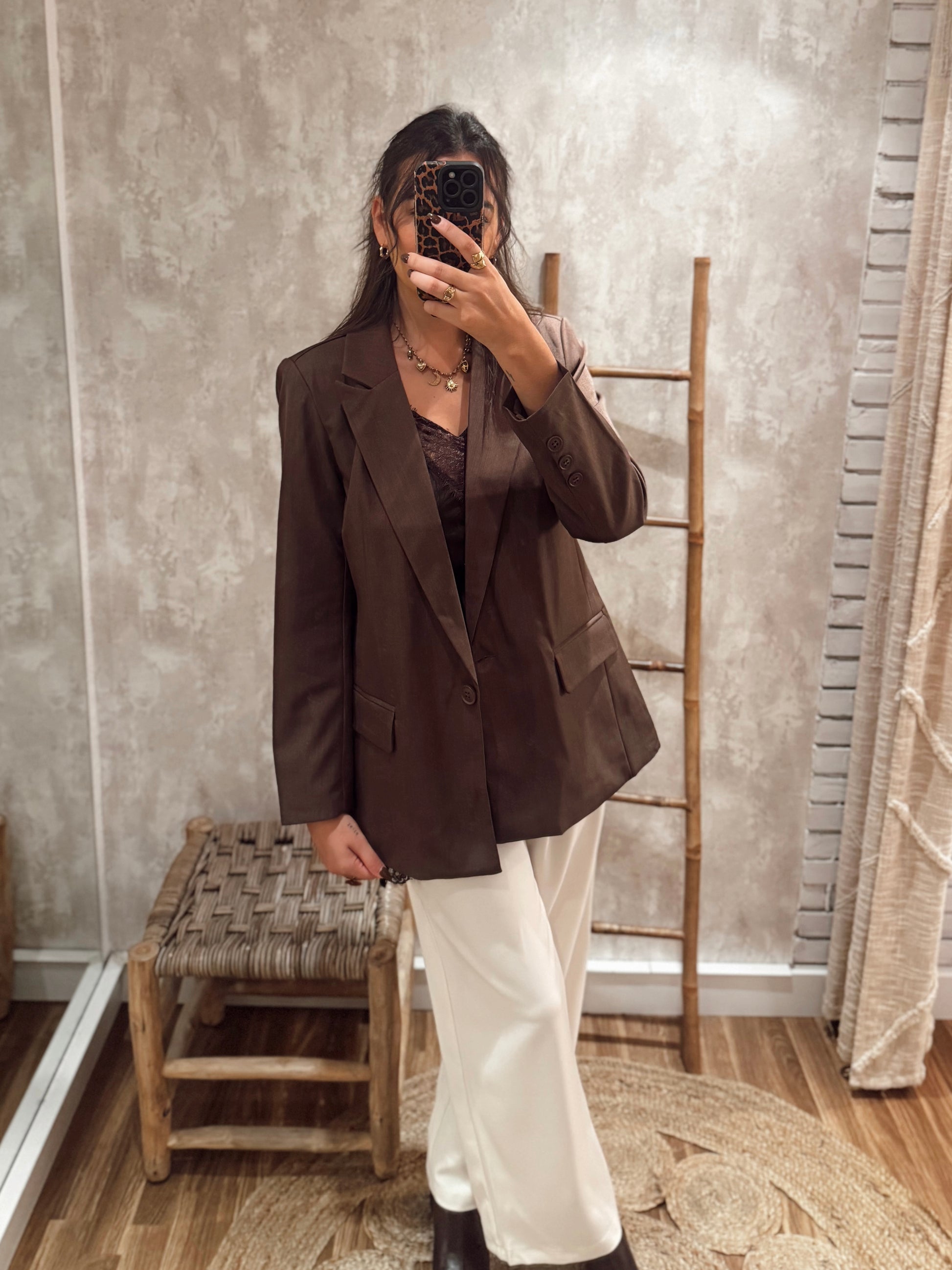 Blazer castanho forrado, com corte clássico e estrutura elegante.
