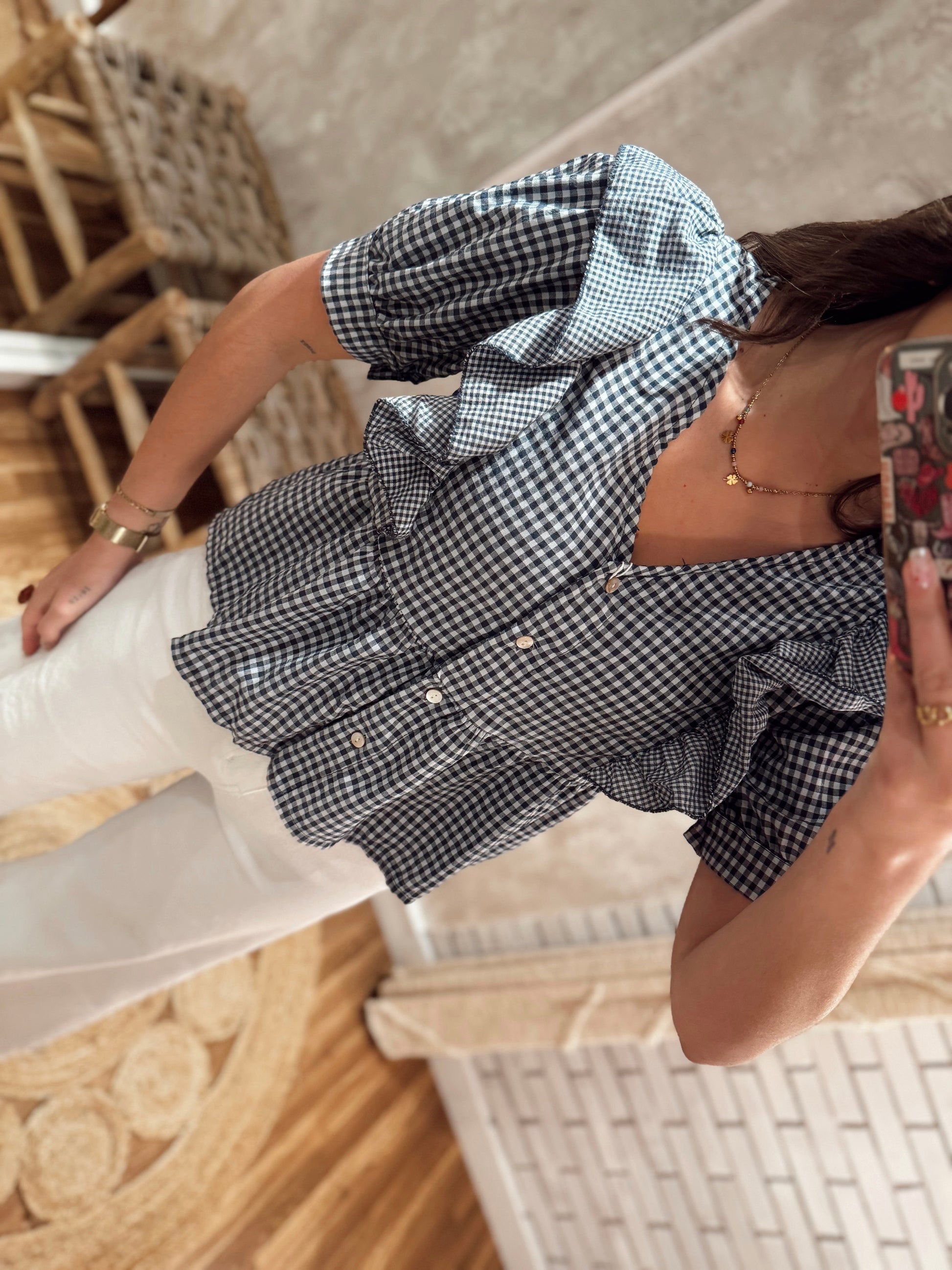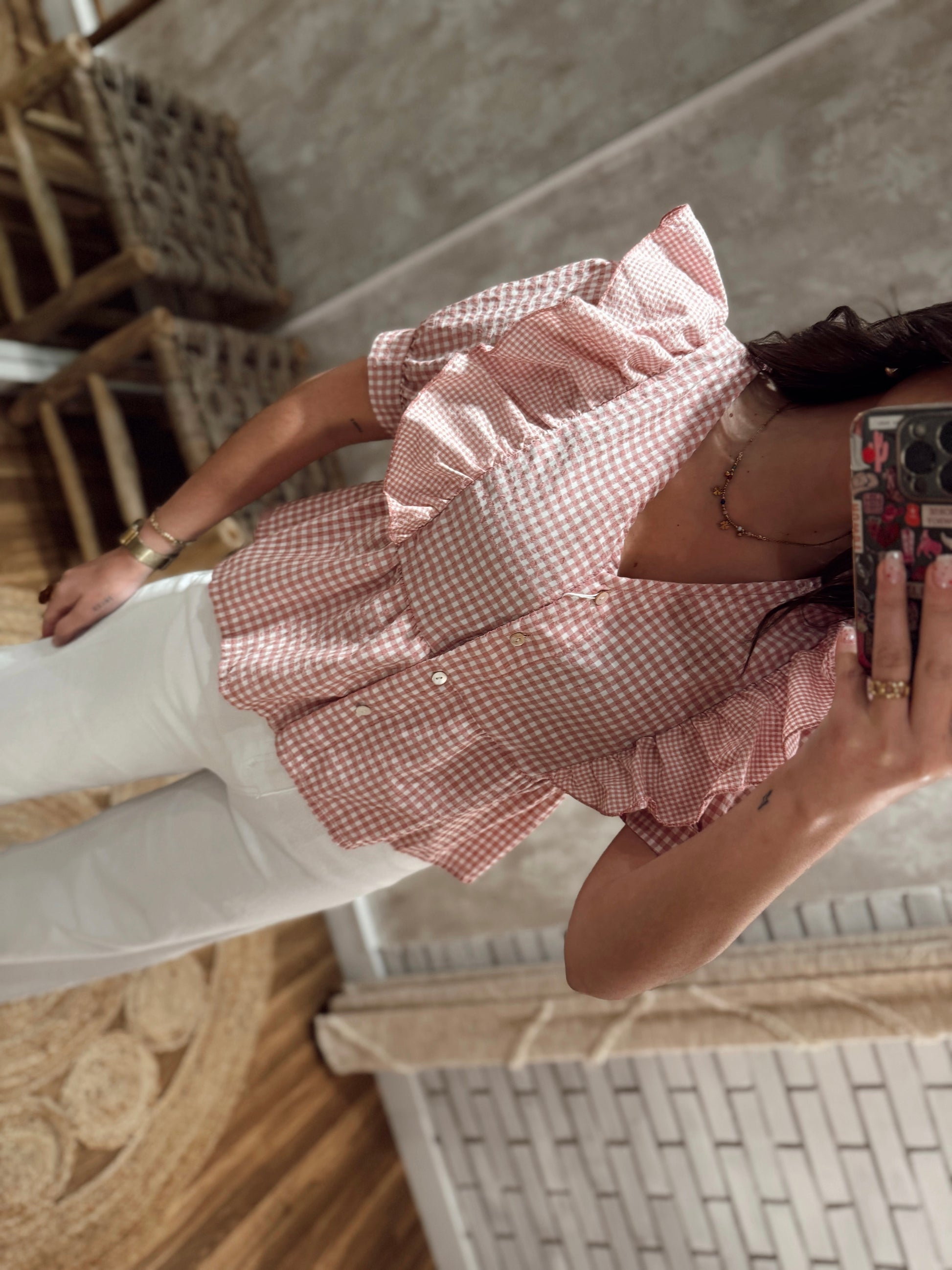 Blusa em padrão vichy com decote em V e detalhe de folho que acompanha o recorte da frente. Modelo de manga curta com ligeiro volume e botão forrado na parte frontal. O corte feminino e leve torna-a ideal para dias de sol — perfeita com jeans ou peças de linho.