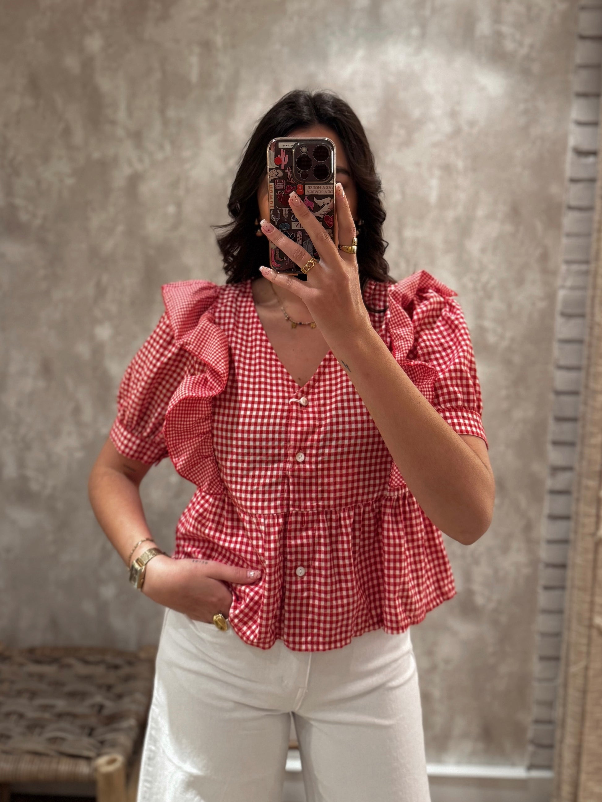 Blusa em padrão vichy com decote em V e detalhe de folho