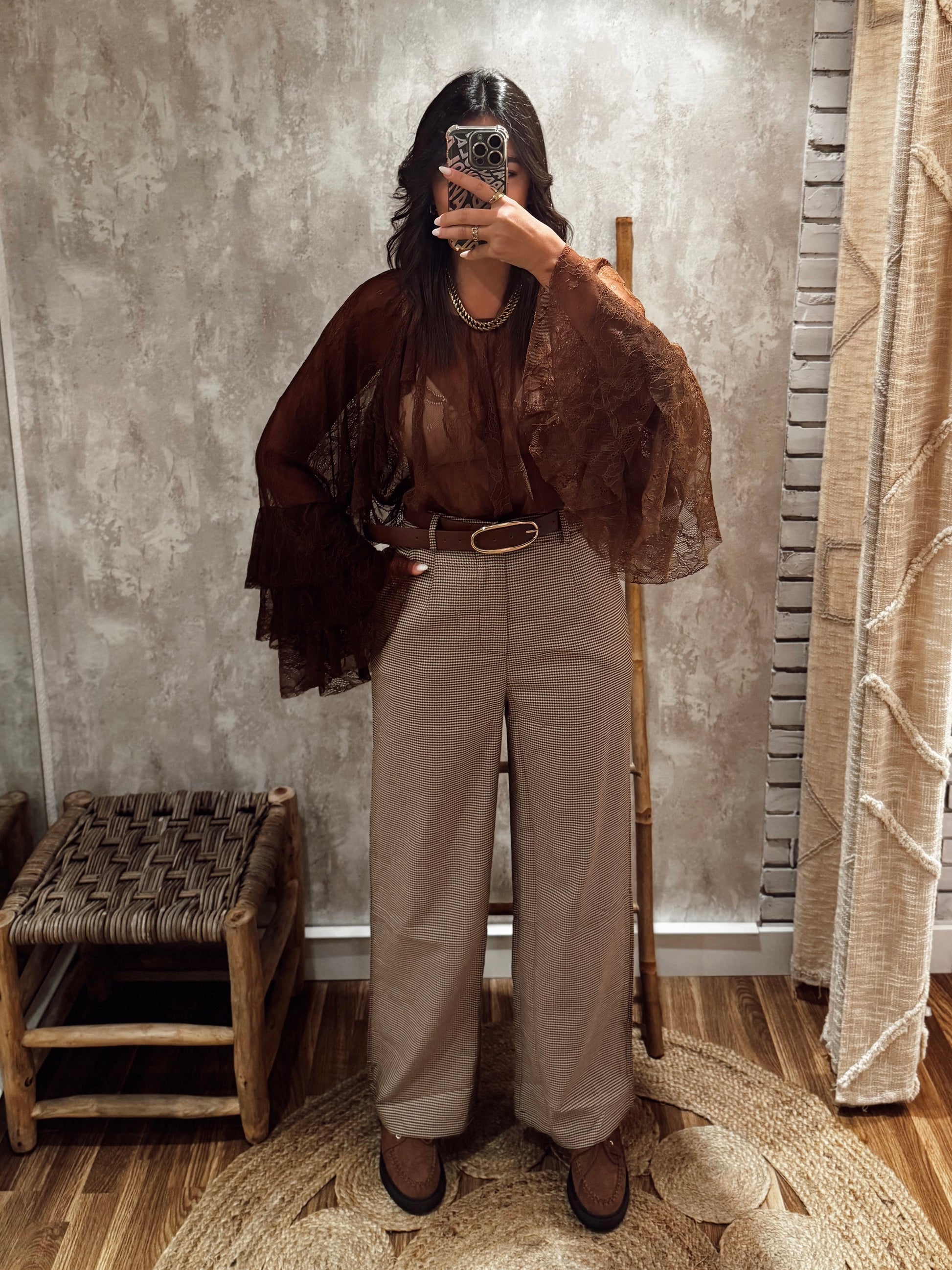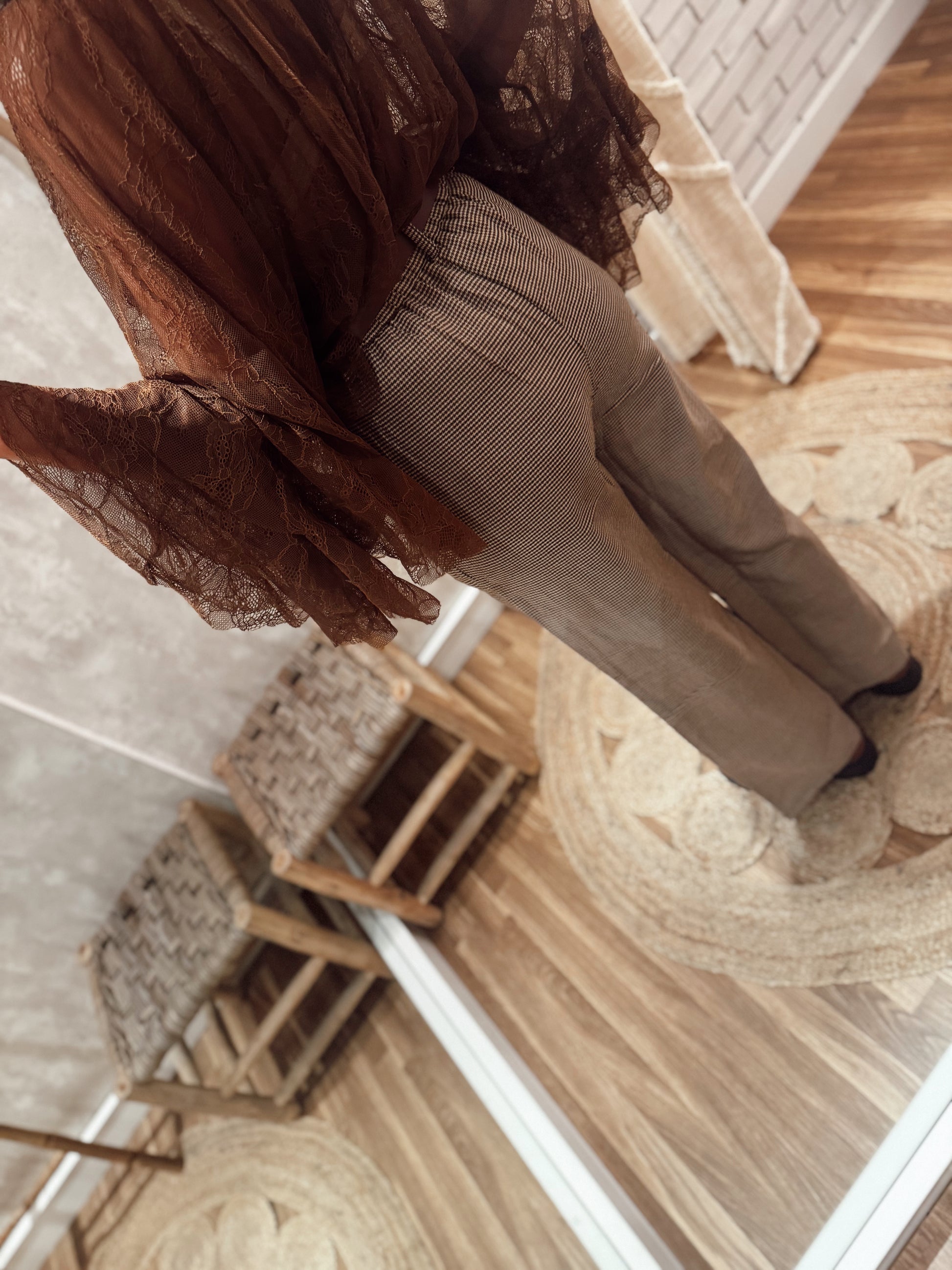 Calças em padrão pied-de-poule com fundo bege e detalhes em castanho claro e escuro, um clássico intemporal que nunca desilude. O modelo tem corte fluido, confortável e elegante, perfeito para o dia a dia ou para compor um look mais sofisticado.