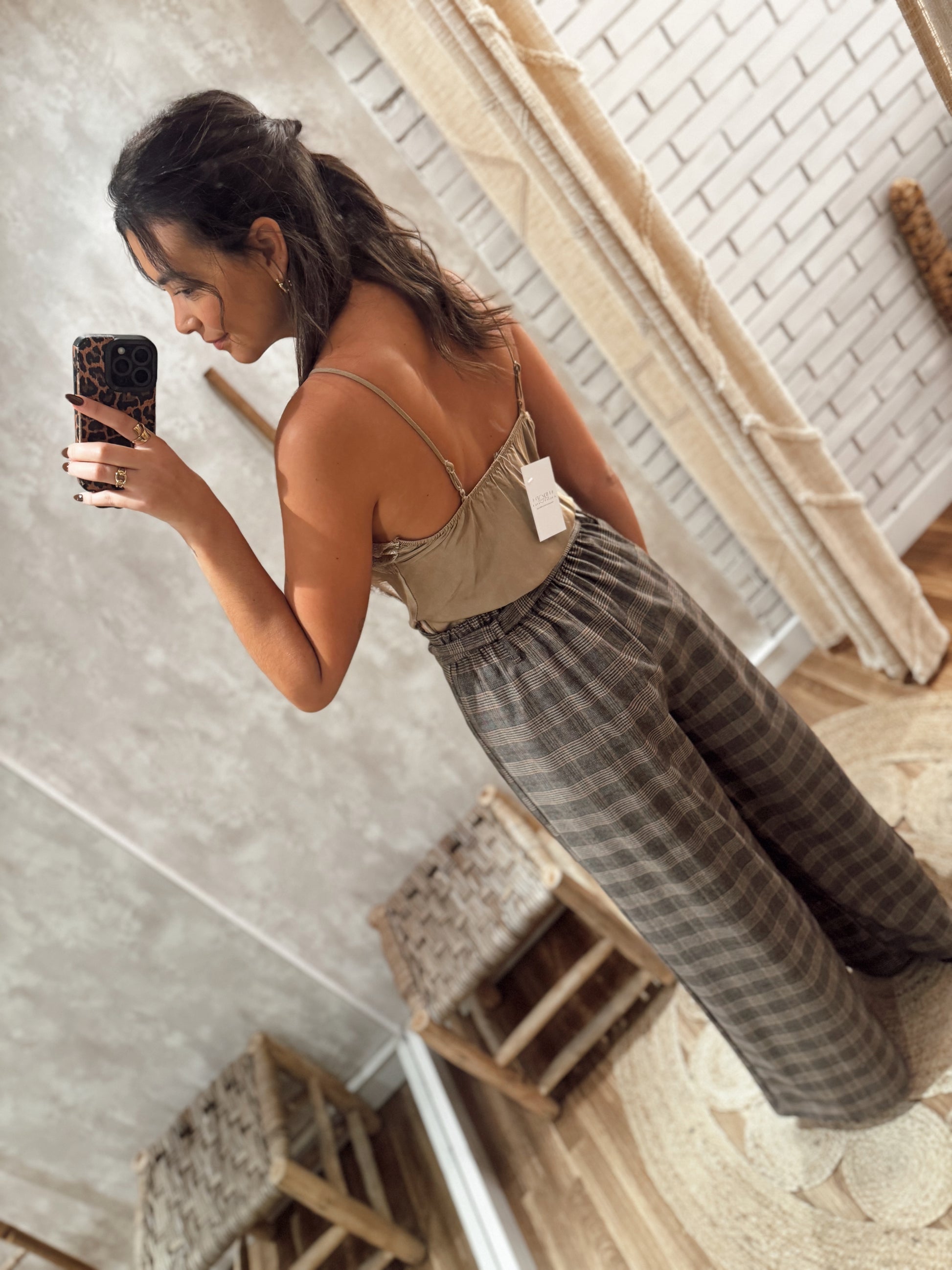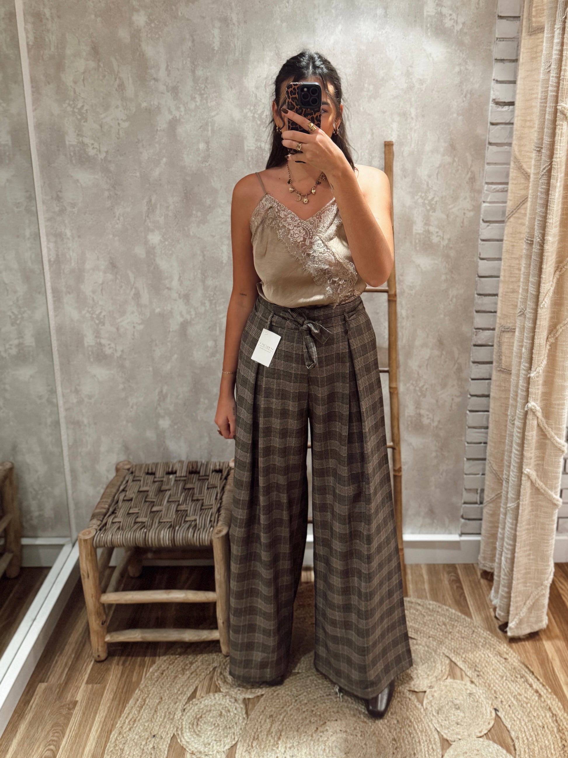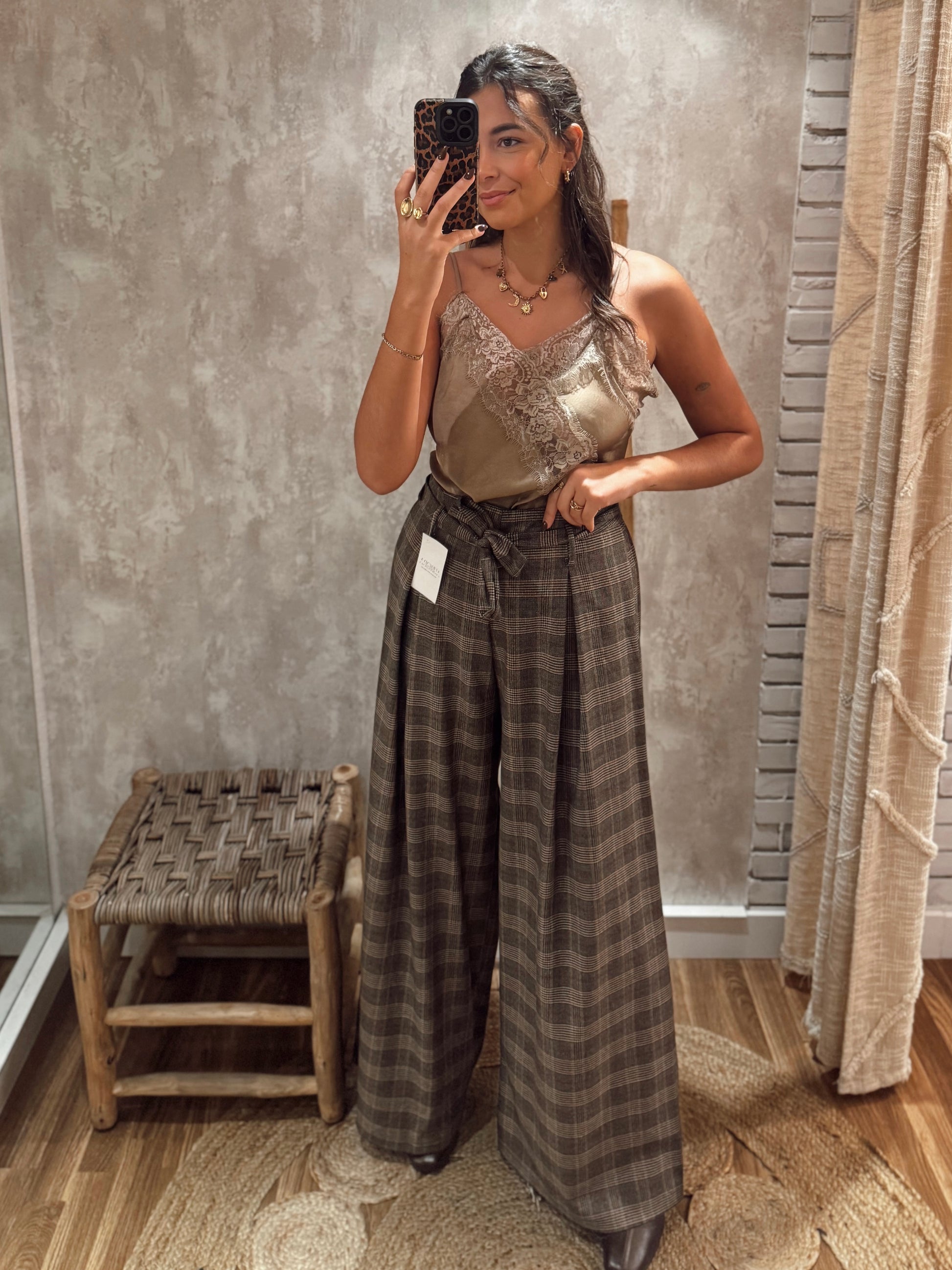 Calças fluídas em padrão axadrezado, com cintura subida e cinto no mesmo tecido.