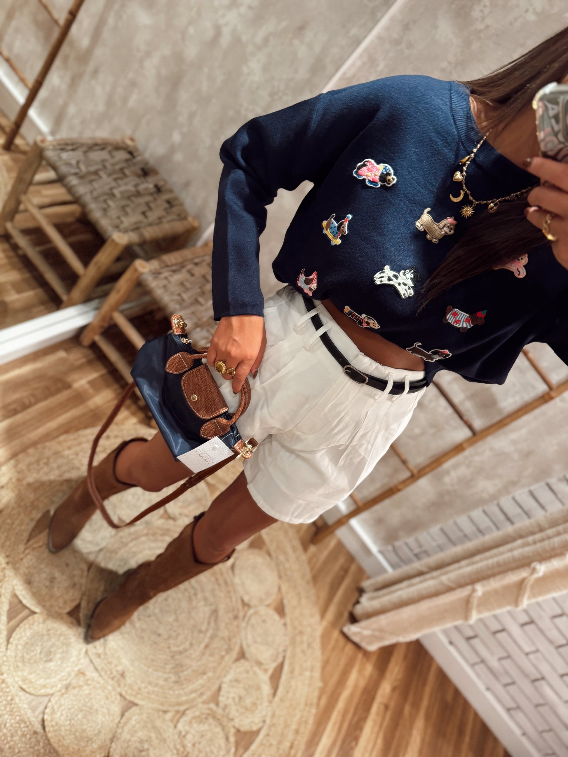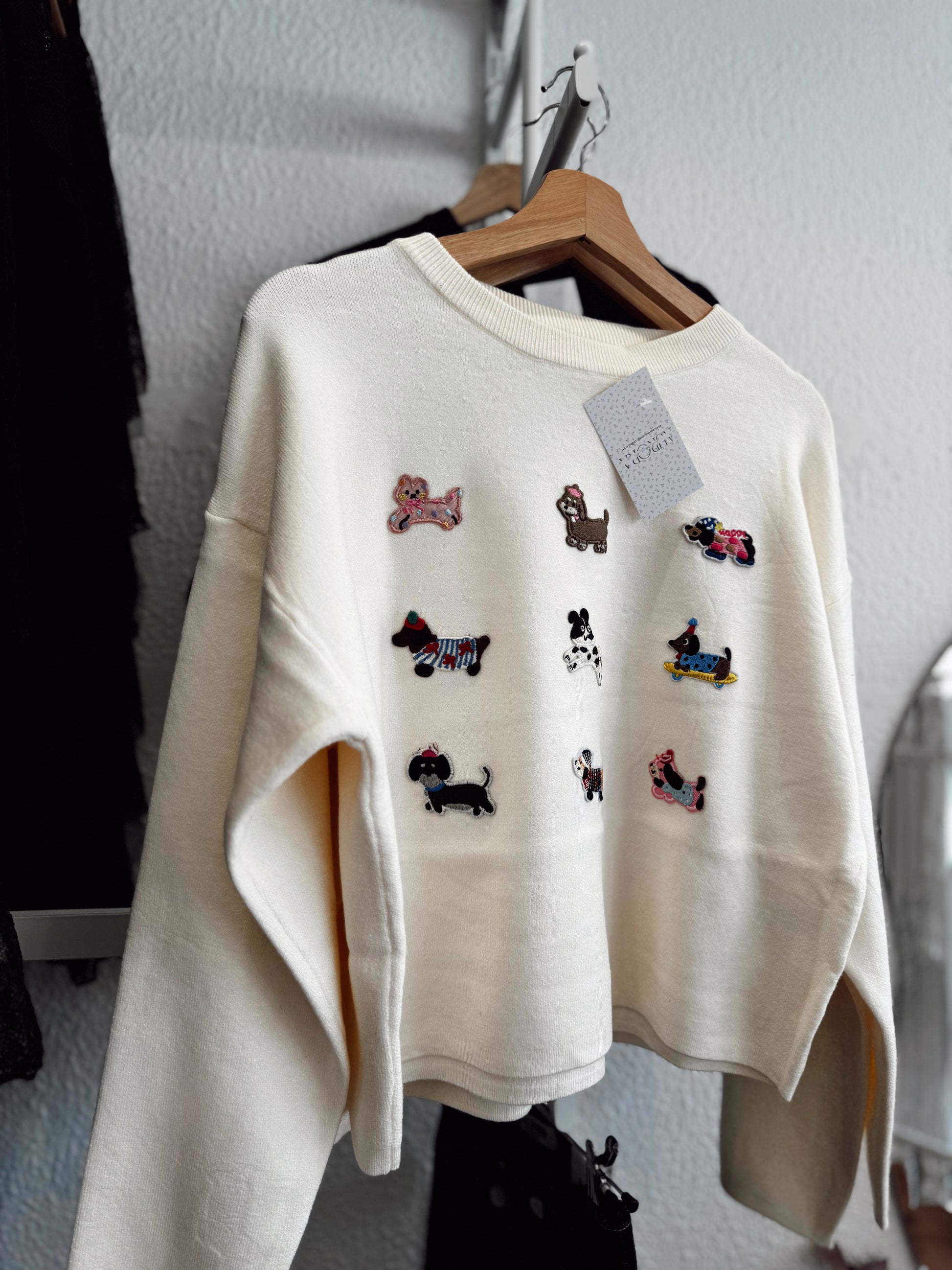 Camisola de malha super divertida, com bordados aplicados de diferentes raças de cães e pequenos detalhes coloridos. Um modelo descontraído e cheio de personalidade, perfeito para dar graça aos looks do dia a dia. Disponível em branco pérola e azul-escuro.