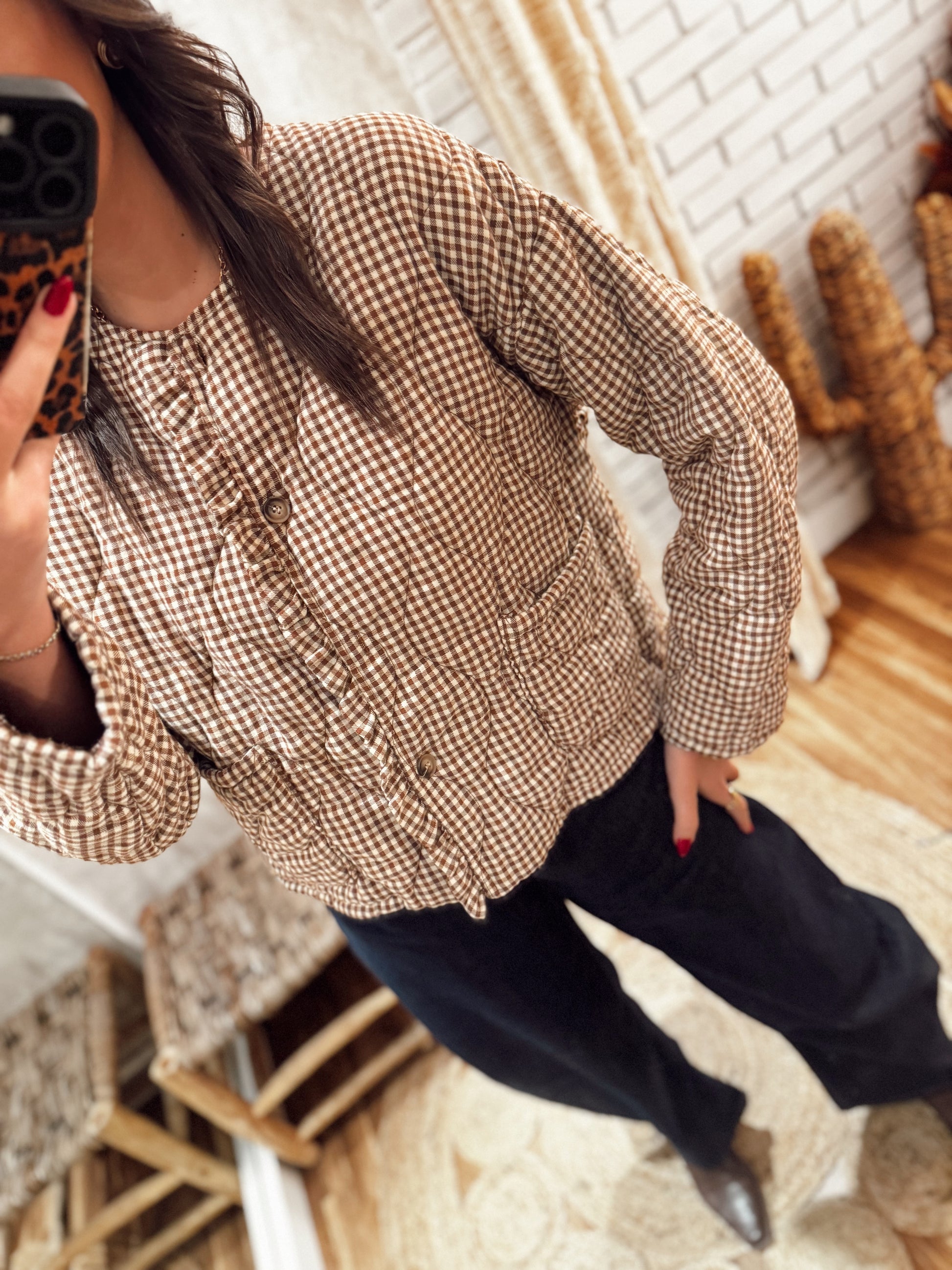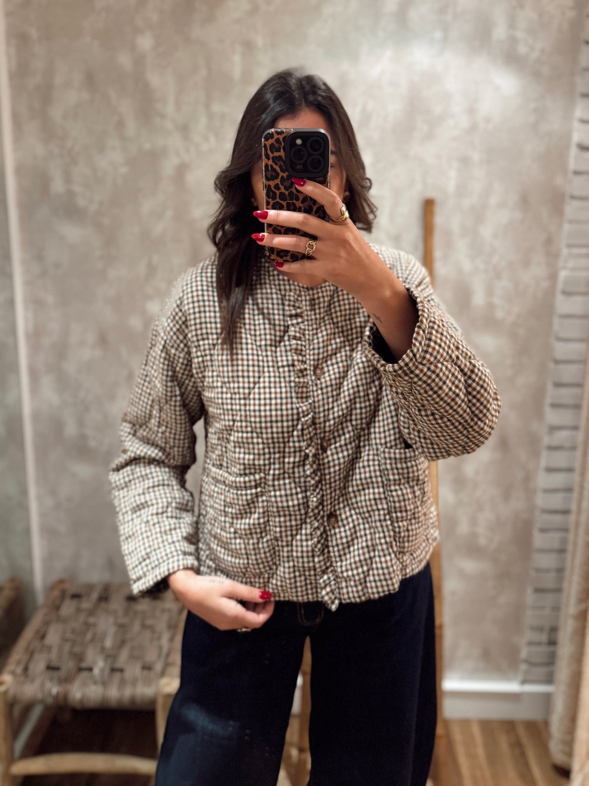 Casaco acolchoado em padrão pequeno de quadradinhos em tons de bege e castanho. O corte é curto, reto e muito leve, perfeito para quem quer uma peça confortável mas com presença. Tem botões frontais, bolsos úteis e um detalhe subtil de folho junto à carcela, que lhe dá um toque mais feminino e moderno. O tecido é macio, fácil de usar no dia a dia e ótimo para sobreposições.
