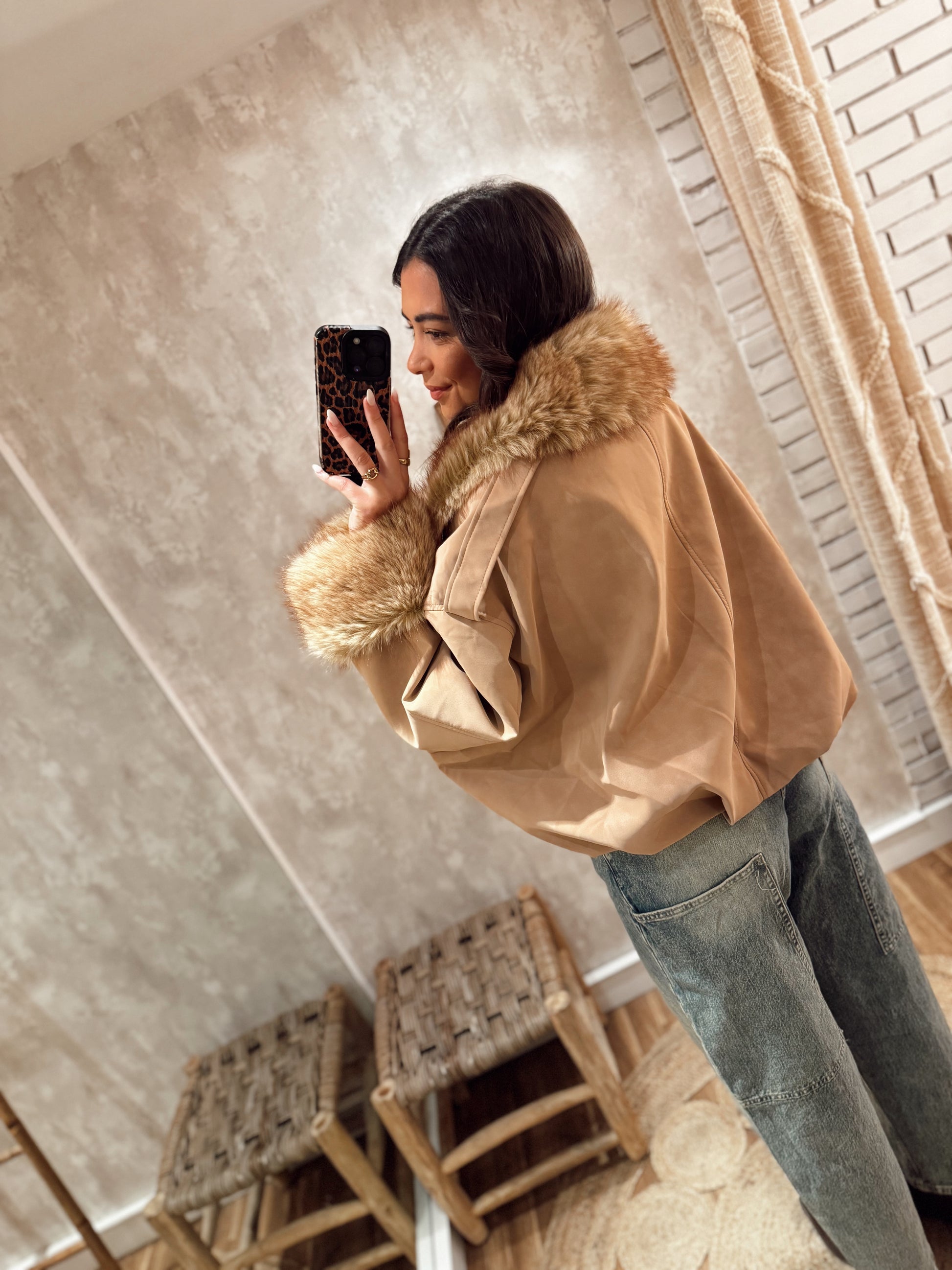 Casaco modelo Balum num tom bege elegante, perfeito para quem quer um look quente, moderno e com personalidade. A gola em pelo é totalmente removível, permitindo ajustar o estilo conforme o clima ou a ocasião. Os punhos também vêm com pelo macio, criando um contraste bonito com o corpo do casaco.
