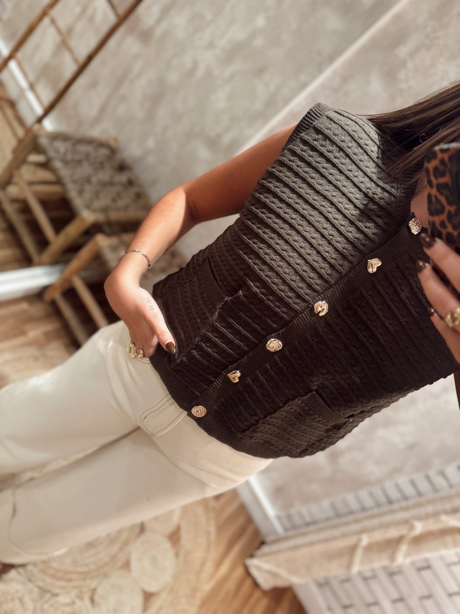 Colete em malha com detalhe de bolsos frontais e botões trabalhados que elevam o look. O ponto em relevo dá textura e charme à peça, tornando-a versátil para usar sozinha ou sobreposta a camisas e blusas.