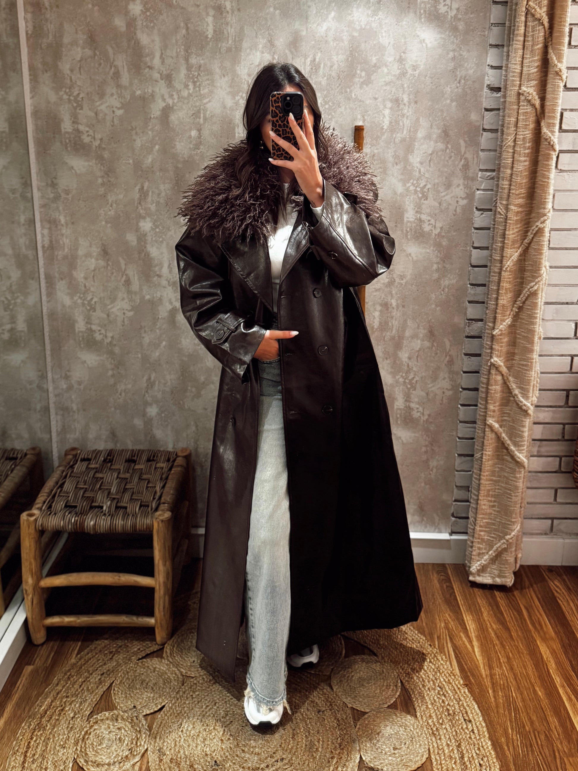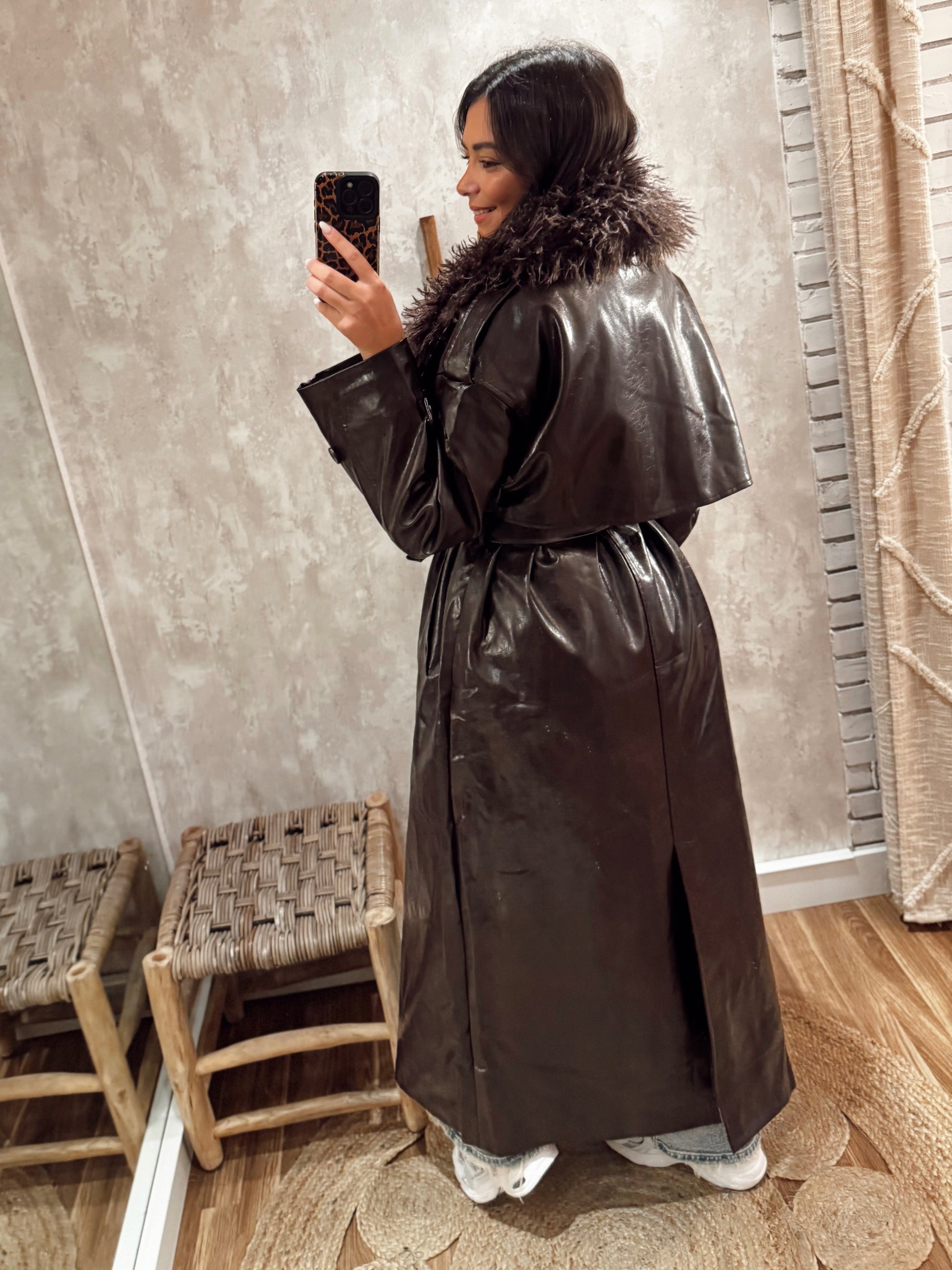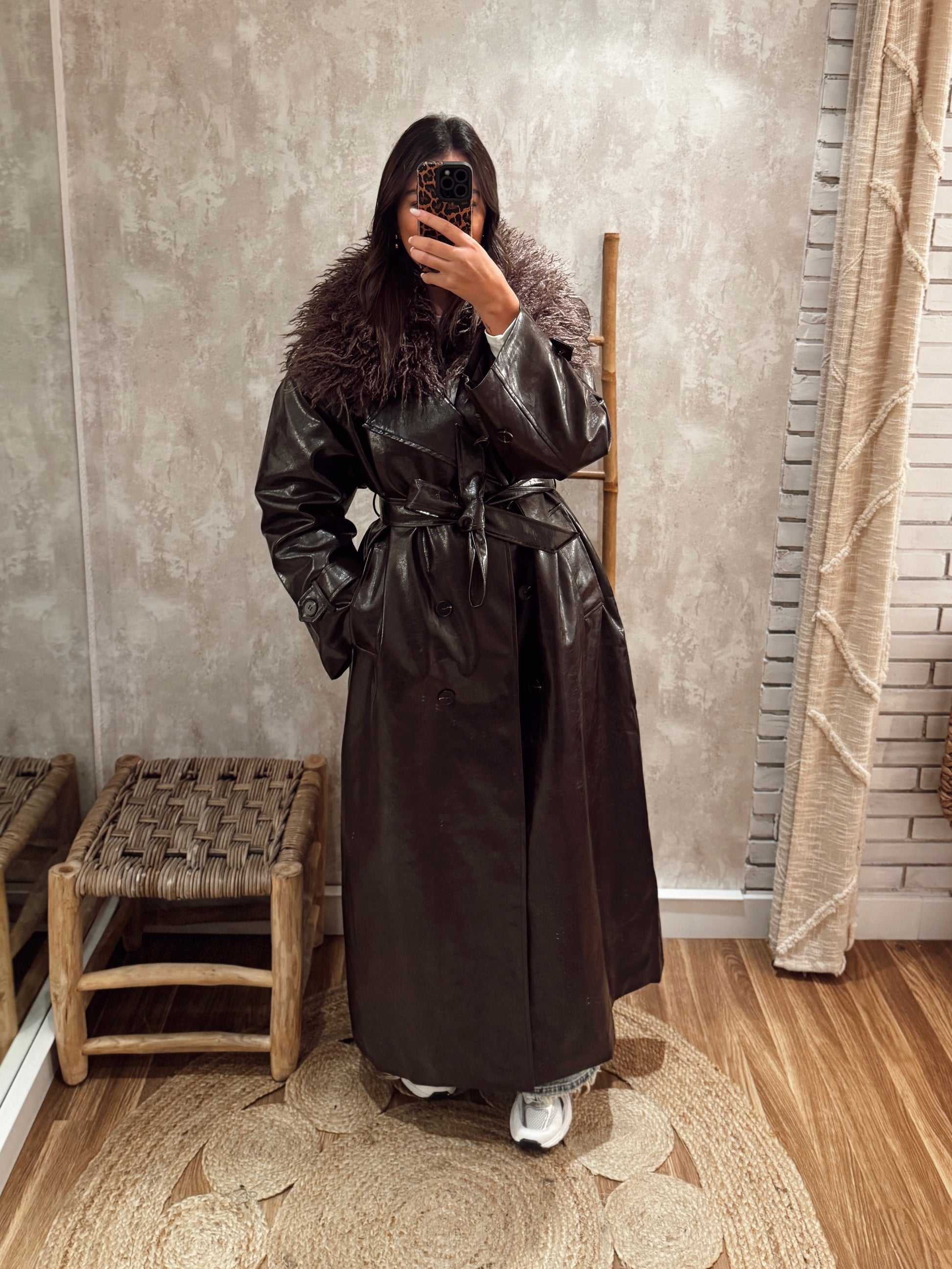 Gabardine em napa castanho-chocolate, modelo longo, com gola em pelo removível e interior totalmente forrado em pelo.