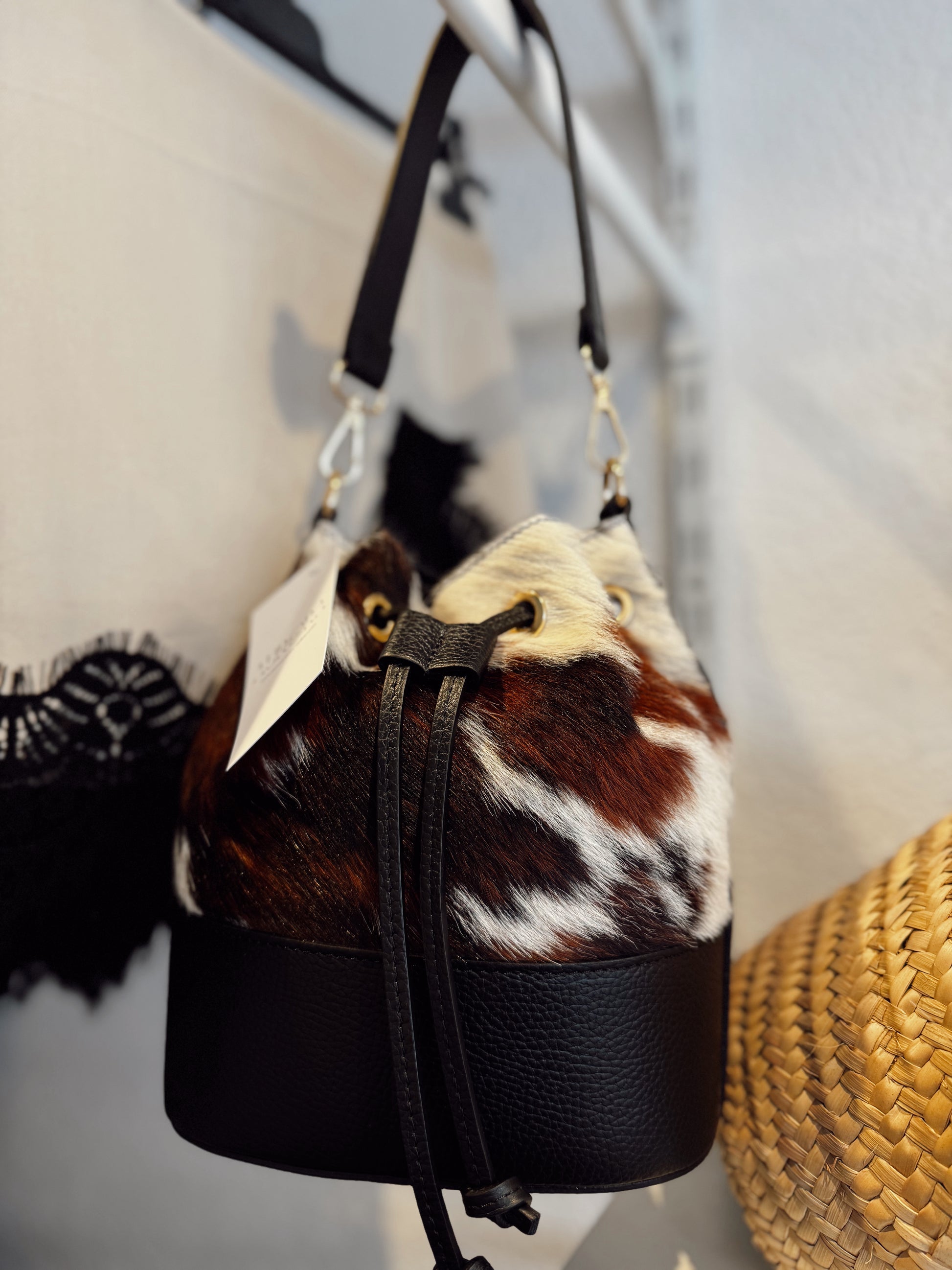 Mala em pele estilo saco, com a parte superior em pêlo natural e padrão único, perfeita para dar um toque marcante a qualquer look. Traz duas alças incluídas: uma alça curta de mão e uma alça comprida para usar a tiracolo, ambas removíveis.