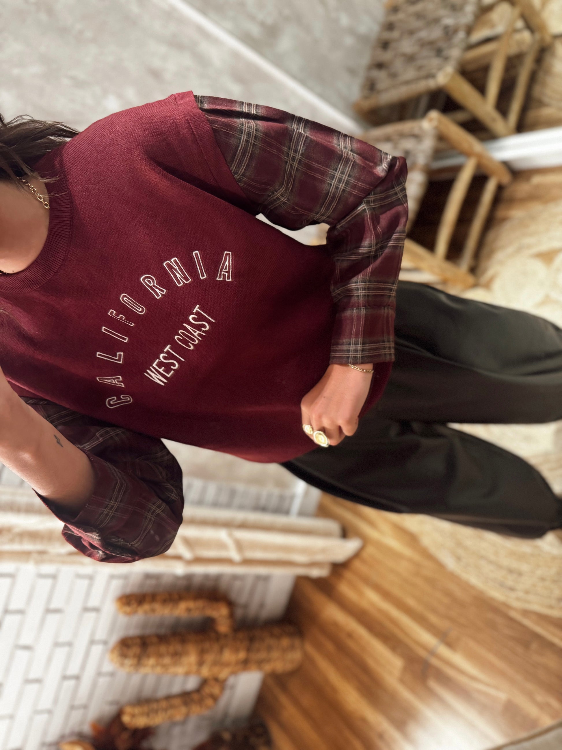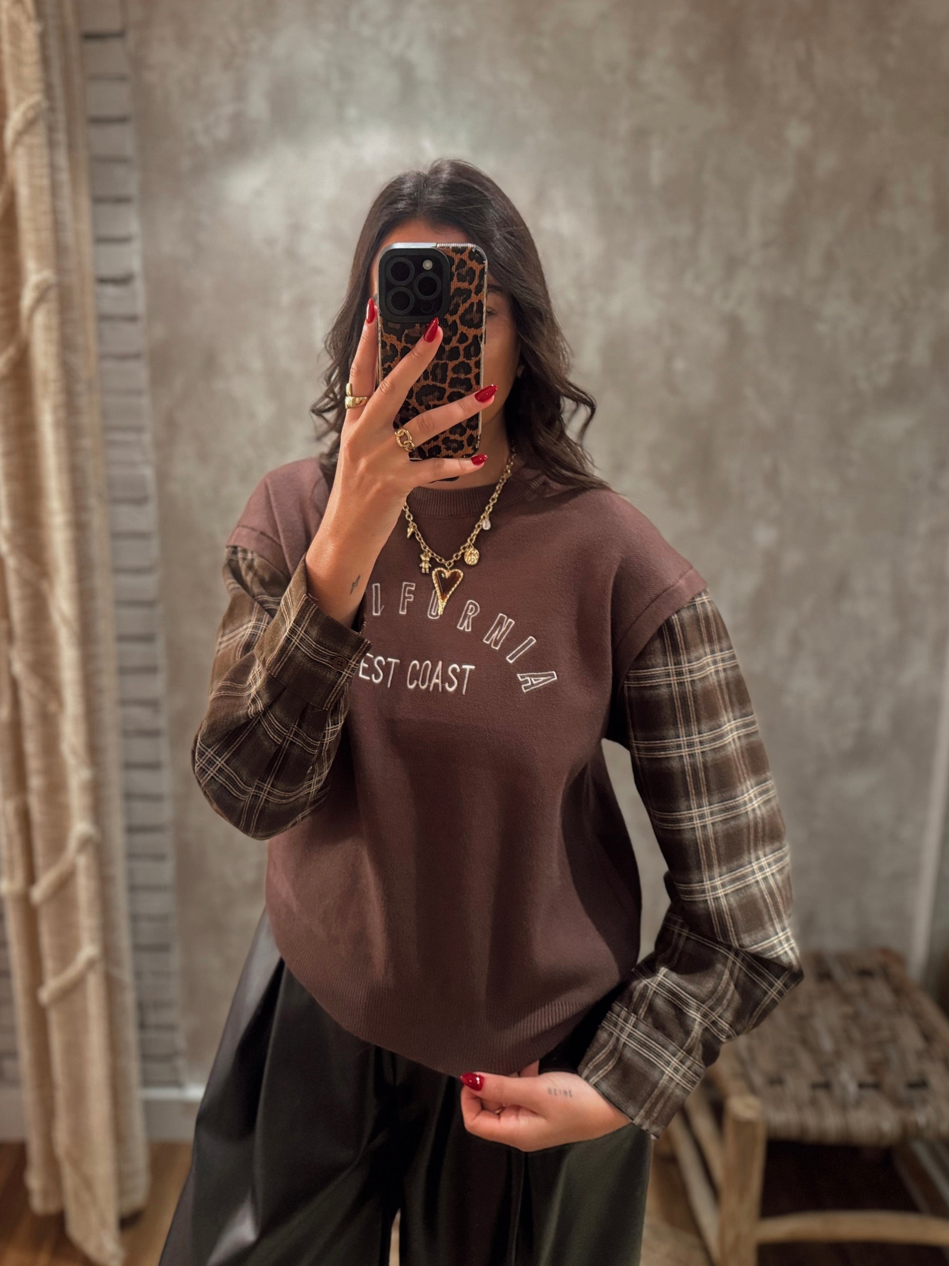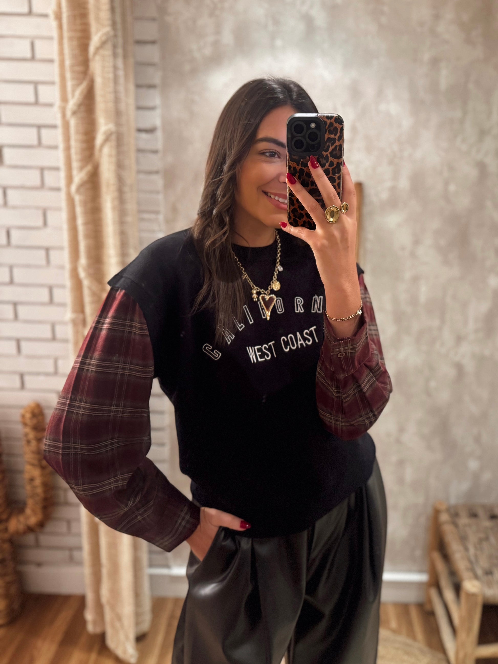 Malha de estilo casual com lettering frontal, combinada com mangas em padrão xadrez que lhe dão um toque diferente e muito moderno. O corpo é em malha confortável, ligeiramente estruturada, enquanto as mangas trazem aquele contraste que transforma a peça num destaque imediato. Perfeita para looks descontraídos mas com personalidade — funciona lindamente com ganga, napa ou calças mais largas.
